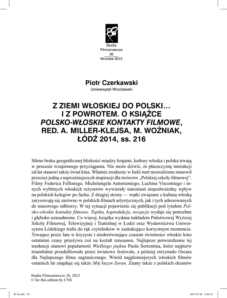 Studia Filmoznawcze 36 Wroc³aw 2015 Piotr Czerkawski Uniwersytet Wroc³awski Z ZIEMI W£OSKIEJ DO POLSKI… I Z POWROTEM. O KSI¥¯CE POLSKO-W£OSKIE KONTAKTY FILMOWE, RED. A. MILLER-KLEJSA, M. WONIAK, £ÓD 2014, ss. 216 Mimo braku geograficznej bliskości między krajami, kultury włoska i polska trwają w procesie wzajemnego przyciągania. Nie może dziwić, że płaszczyznę interakcji od lat stanowi także świat kina. Właśnie zrodzony w Italii nurt neorealizmu stanowił przecież jedną z najważniejszych inspiracji dla twórców „Polskiej szkoły filmowej”. Filmy Federica Felliniego, Michelangela Antonioniego, Luchina Viscontiego i innych wybitnych włoskich reżyserów wywierały natomiast niepodważalny wpływ na polskich kolegów po fachu. Z drugiej strony — wątki związane z kulturą włoską zarysowują się zarówno w polskich filmach artystycznych, jak i tych adresowanych do masowego odbiorcy. W tej sytuacji pojawienie się publikacji pod tytułem Polsko-włoskie kontakty filmowe. Topika, koprodukcje, recepcja wydaje się potrzebne i głęboko uzasadnione. Co więcej, książka wydana nakładem Państwowej Wyższej Szkoły Filmowej, Telewizyjnej i Teatralnej w Łodzi oraz Wydawnictwa Uniwersytetu Łódzkiego trafia do rąk czytelników w zaskakująco korzystnym momencie. Trwające przez lata w kryzysie i niedorównujące czasom świetności włoskie kino ostatnimi czasy przeżywa coś na kształt renesansu. Najlepsze potwierdzenie tej tendencji stanowi popularność Wielkiego piękna Paola Sorrentina, które najpierw triumfalnie przedefilowało przez światowe festiwale, a później otrzymało Oscara dla Najlepszego filmu zagranicznego. Wśród najgłośniejszych włoskich filmów ostatnich lat znajduje się także Mój kuzyn Zoran. Znany także z polskich ekranów Studia Filmoznawcze 36, 2015 © for this edition by CNS SF 36.indb 311 2015-07-20 13:02:43 312 | Piotr Czerkawski debiut Mattea Oleotta potwierdza — sygnalizowaną pośrednio w pochodzącym z recenzowanego tomu tekście Diany Dąbrowskiej — tezę o charakterystycznej dla nowego włoskiego kina zmianie stosunku do imigrantów1. W Moim kuzynie… słoweński nastolatek niespodziewanie wkraczający do życia włoskiego nieudacznika, zostaje potraktowany w sposób daleki od prymitywnej wyższości. Pojawienie się chłopaka wprowadza do życia krewnego niezbędną dawkę świeżości i na powrót rozbudza jego uśpione ambicje. Powstawanie filmów, które — tak jak Mój kuzyn… opiewają zbliżanie się „starej” i „nowej” Europy sprawia, że inicjatywa pokroju Polsko-włoskich kontaktów filmowych jeszcze bardziej zwiększa swoją rację bytu i powinna prowokować pogłębione zainteresowanie. ZAPISKI NA MARGINESACH Książka pod redakcją Anny Miller-Klejsy i Moniki Woźniak składa się z części zatytułowanej Studia i szkice oraz aneksu obejmującego artykuł Krzysztofa Zanussiego i zapis spotkania z Jerzym Stuhrem. Obaj artyści wspominają swoje doświadczenia z włoską kulturą w sposób barwny, lecz anegdotyczny i pozbawiony pretensji do naukowości. W związku z tym przedmiotem niniejszej recenzji będą wyłącznie teksty zamieszczone w pierwszej części publikacji. Jak wskazują w rozdziale wstępnym obie redaktorki, książka Polsko-włoskie kontakty filmowe stanowi część projektu naukowego „Italianistyka dla filmoznawstwa, filmoznawstwo dla italianistyki. Paradygmat audiowizualny w ramach polsko-włoskiego transferu kulturowego” i jest pokłosiem interdyscyplinarnej konferencji naukowej zorganizowanej w kwietniu 2013 roku na Uniwersytecie Łódzkim. Jak większość tego rodzaju publikacji Polsko-włoskie kontakty… odznaczają się różnorodnością dotyczącą tematyki i poziomu zamieszczonych w tomie tekstów. Z perspektywy filmoznawczej najmniej interesujące mogłyby się wydawać wieńczące Studia i szkice teksty językoznawcze skupione na problemach związanych z tłumaczeniem polskich filmów na język włoski i odwrotnie. O ile jednak szkic Werony Król W świecie wyobraźni wszystko może się zdarzyć i w dubbingu również — transformacja w przekładzie audiowizualnym na przykładzie polskiej wersji Pinokia Roberta Benigniego rzeczywiście funkcjonuje w służbie innej dyscypliny naukowej, o tyle nad artykułem Sylwii Skuzy Kanał, czyli I dannati di Varsavia. Językowe i kulturowe aspekty przekładu filmowego na język włoski na przykładzie filmu Andrzeja Wajdy warto zatrzymać się 1 Paradoksalnie stereotypowe podejście do imigrantów moglibyśmy jednak zauważyć właśnie w Wielkim pięknie. W jednej ze scen główny bohater spotyka starego przyjaciela, właściciela rzymskiego klubu nocnego. Mężczyzna tłumaczy dawnemu kompanowi, że jego branża ulega zmianom, a młode Polki za niewielkie pieniądze „są w stanie zrobić wszystko”. Osadzenie tej sceny w kontekście całego filmu Paola Sorrentina pozwala w niej dostrzec nie tyle próbę upokorzenia Polaków, ile kolejną odsłonę ataku na protekcjonalność i miałkość rzymskich elit. Studia Filmoznawcze 36, 2015 © for this edition by CNS SF 36.indb 312 2015-07-20 13:02:43 Z ziemi w³oskiej do Polski… | 313 chwilę dłużej. Za sprawą swojego tekstu Skuza uzmysławia czytelnikowi wpływ tłumaczenia na odbiór filmowego dzieła. Autorka przekonująco wyjaśnia choćby — dokonaną przez Włochów — zmianę tytułu filmu Wajdy, który w Italii funkcjonował jako I dannati di Varsavia (Potępieńcy z Warszawy). Jak stwierdza Skuza: jest to wyjątkowo adekwatny tytuł dla filmu przedstawiającego piekło, w którym znaleźli się żołnierze Powstania Warszawskiego […]. Co więcej, sam przymiotnik i dannati wywołuje u Włochów skojarzenie z i dannati di Dante, czyli z duszami potępionymi, które znajdujemy licznie w piekle Boskiej Komedii. W innym miejscu autorka gani jednak tłumacza za brak przełożenia na język włoski pseudonimów powstańców. Skuza zauważa, że podobny