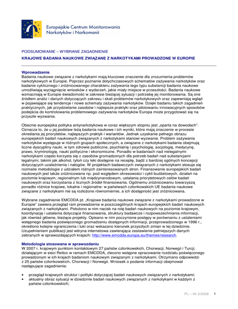 PODSUMOWANIE – WYBRANE ZAGADNIENIE KRAJOWE BADANIA NAUKOWE ZWI ZANE Z NARKOTYKAMI PROWADZONE W EUROPIE Wprowadzenie Badania naukowe zwi zane z narkotykami maj kluczowe znaczenie dla zrozumienia problemów narkotykowych w Europie. Poprzez poznanie dotychczasowych schematów za ywania narkotyków oraz badanie cyklicznego i zró nicowanego charakteru za ywania tego typu substancji badania naukowe umo liwiaj wyci gni cie wniosków z wydarze , jakie miały miejsce w przeszło ci. Badania naukowe wzmacniaj w Europie wiadomo w zakresie bie cej sytuacji i potrzeb jej monitorowania. S one ródłem analiz i danych dotycz cych zakresu i skali problemów narkotykowych oraz zapewniaj wgl d w pojawiaj ce si tendencje i nowe schematy za ywania narkotyków. Dzi ki badaniu takich zagadnie praktycznych, jak przydzielanie zasobów i najlepsze praktyki oraz pilotowaniu innowacyjnych sposobów podej cia do kontrolowania problemowego za ywania narkotyków Europa mo e przygotowa si na przyszłe wyzwania. Obecnie europejska polityka antynarkotykowa w coraz wi kszym stopniu jest „oparta na dowodach”. Oznacza to, e u jej podstaw le badania naukowe i ich wyniki, które maj znaczenie w procesie okre lania jej priorytetów, najlepszych praktyk i wariantów. Jednak uzyskanie pełnego obrazu europejskich bada naukowych zwi zanych z narkotykami stanowi wyzwanie. Problem za ywania narkotyków wyst puje w ró nych grupach społecznych, a zwi zane z narkotykami badania obejmuj liczne dyscypliny nauki, w tym zdrowie publiczne, psychiatri i psychologi , socjologi , medycyn , prawo, kryminologi , nauki polityczne i ekonomiczne. Ponadto w badaniach nad nielegalnymi narkotykami cz sto korzysta si z zasobów gromadzonych dla potrzeb bada nad substancjami legalnymi, takimi jak alkohol, tyto czy leki dost pne na recept , b d z bardziej ogólnych koncepcji dotycz cych uzale nienia i nałogów. W projektach badawczych zwi zanych z narkotykami stosuje si rozmaite metodologie z udziałem ró nych zainteresowanych stron. Finansowanie europejskich bada naukowych jest tak e zró nicowane np. pod wzgl dem okresowo ci i cykli bud etowych, działa na poziomie krajowym, regionalnym lub mi dzynarodowym, ustalania priorytetowych celów bada naukowych oraz korzystania z licznych ródeł finansowania. Ogólnemu zró nicowaniu towarzysz ponadto ró nice krajowe, lokalne i regionalne: w pa stwach członkowskich UE badania naukowe zwi zane z narkotykami nie s rozło one równomiernie, a ich dost pno jest zró nicowana. Wybrane zagadnienie EMCDDA pt. „Krajowe badania naukowe zwi zane z narkotykami prowadzone w Europie” zawiera przegl d ram prowadzenia w poszczególnych krajach europejskich bada naukowych zwi zanych z narkotykami. Poło ono w nim nacisk na rol bada naukowych na poziomie krajowym, koordynacj i ustalenia dotycz ce finansowania, struktury badawcze i rozpowszechniania informacji, jak równie główne, bie ce projekty. Opisano w nim poczynione post py w porównaniu z ustaleniami wst pnego badania po wi conego gromadzeniu dost pnych informacji, przeprowadzonego w 1996 r., okre lono kolejne ograniczenia i luki oraz wskazano kierunek przyszłych zmian w tej dziedzinie. Uzupełnieniem publikacji jest witryna internetowa zawieraj ca zestawienie pełniejszych danych zebranych w sprawozdaj cych krajach: http://www.emcdda.europa.eu/themes/research. Metodologia stosowana w sprawozdaniu W 2007 r. krajowym punktom kontaktowym 27 pa stw członkowskich, Chorwacji, Norwegii i Turcji, działaj cym w sieci Reitox w ramach EMCDDA, zlecono wst pne opracowanie rozdziału po wi conego prowadzonym w ich krajach badaniom naukowym zwi zanym z narkotykami. Otrzymano odpowiedzi z 25 pa stw członkowskich, Chorwacji i Norwegii. Wniosek o podanie informacji obejmował nast puj ce zagadnienia: • • przegl d krajowych struktur i polityki dotycz cej bada naukowych zwi zanych z narkotykami; aktualny obraz sytuacji w dziedzinie bada naukowych zwi zanych z narkotykami w ka dym z pa stw członkowskich; PL – Nr 2/2008 1 • opis krajowych struktur i sposobów podej cia do kwestii gromadzenia i rozpowszechniania informacji o wynikach tych bada . Sprawozdanie dotyczyło zarówno bada stosowanych, jak i podstawowych. Nie uwzgl dniono w nim bada naukowych zwi zanych z ograniczeniem poda y – a wi c dotycz cych takich dziedzin, jak kryminologia, działania policji, egzekwowanie prawa i konfiskaty, gdy uznano, e wiele spo ród krajowych punktów kontaktowych dysponuje jedynie ograniczonym dost pem do tego typu informacji. Sprawozdania otrzymane z krajowych punktów kontaktowych w sieci Reitox umo liwiły Centrum sporz dzenie obrazu aktualnej sytuacji w dziedzinie europejskich bada naukowych zwi zanych z narkotykami w Europie oraz zastosowanie wst pnych kategorii ramowych w celu dokonania klasyfikacji (i) europejskich podmiotów badawczych, (ii) szeroko zakrojonych tematów i przedmiotów głównych bada uj tych w sprawozdaniach przekazanych Centrum oraz (iii) dost pnych kanałów rozpowszechniania informacji. Sprawozdania te porównano ze sprawozdaniem z 1996 r., w którym EMCDDA po raz pierwszy uczestniczyło w opracowaniu wst pnego przegl du prowadzonych w 15 pa stwach członkowskich bada naukowych zwi zanych z narkotykami, zatytułowanego „Drug research-related initiatives in the European Union” (Podejmowane w Unii Europejskiej inicjatywy z zakresu bada naukowych zwi zanych z narkotykami). Pierwsze wyniki • Pomimo e ju w 1996 r. tematyka bada naukowych zwi zanych z narkotykami stanowiła przedmiot zainteresowania opinii publicznej, pa stwa członkowskie teraz oficjalnie uznały te badania za priorytetowe. Od tego czasu w wielu krajach UE uwzgl dniono je w formalnych wytycznych politycznych. Obecnie w krajowych dokumentach w sprawie polityki antynarkotykowej 20 spo ród 27 sprawozdaj cych krajów zwraca szczególn uwag na badania naukowe. • Przegl d najnowszych wydarze w dziedzinie prowadzonych w UE bada naukowych zwi zanych z narkotykami w pewnym stop