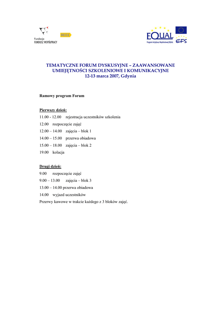 TEMATYCZNE FORUM DYSKUSYJNE – ZAAWANSOWANE UMIEJĘTNOŚCI SZKOLENIOWE I KOMUNIKACYJNE 12-13 marca 2007, Gdynia Ramowy program Forum Pierwszy dzień: 11.00 - 12.00 rejestracja uczestników szkolenia 12.00 rozpoczęcie zajęć 12.00 – 14.00 zajęcia – blok 1 14.00 – 15.00 przerwa obiadowa 15.00 – 18.00 zajęcia – blok 2 19.00 kolacja Drugi dzień: 9.00 rozpoczęcie zajęć 9.00 – 13.00 zajęcia – blok 3 13.00 – 14.00 przerwa obiadowa 14.00 wyjazd uczestników Przerwy kawowe w trakcie każdego z 3 bloków zajęć.