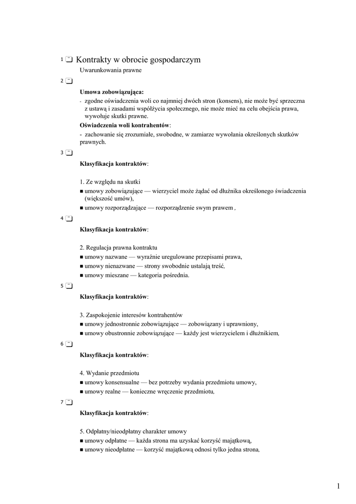 1 Kontrakty w obrocie gospodarczym Uwarunkowania prawne 2 Umowa zobowiązująca: - zgodne oświadczenia woli co najmniej dwóch stron (konsens), nie moŜe być sprzeczna z ustawą i zasadami współŜycia społecznego, nie moŜe mieć na celu obejścia prawa, wywołuje skutki prawne. Oświadczenia woli kontrahentów: - zachowanie się zrozumiałe, swobodne, w zamiarze wywołania określonych skutków prawnych. 3 Klasyfikacja kontraktów: 1. Ze względu na skutki umowy zobowiązujące — wierzyciel moŜe Ŝądać od dłuŜnika określonego świadczenia (większość umów), umowy rozporządzające — rozporządzenie swym prawem , 4 Klasyfikacja kontraktów: 2. Regulacja prawna kontraktu umowy nazwane — wyraźnie uregulowane przepisami prawa, umowy nienazwane — strony swobodnie ustalają treść, umowy mieszane — kategoria pośrednia. 5 Klasyfikacja kontraktów: 3. Zaspokojenie interesów kontrahentów umowy jednostronnie zobowiązujące — zobowiązany i uprawniony, umowy obustronnie zobowiązujące — kaŜdy jest wierzycielem i dłuŜnikiem, 6 Klasyfikacja kontraktów: 4. Wydanie przedmiotu umowy konsensualne — bez potrzeby wydania przedmiotu umowy, umowy realne — konieczne wręczenie przedmiotu, 7 Klasyfikacja kontraktów: 5. Odpłatny/nieodpłatny charakter umowy umowy odpłatne — kaŜda strona ma uzyskać korzyść majątkową, umowy nieodpłatne — korzyść majątkową odnosi tylko jedna strona, 1 umowy wzajemne — obopólna wymiana świadczeń. 8 Klasyfikacja kontraktów: 6. Umowy przysparzające — dokonanie przysporzenia w majątku innej osoby niŜ zobowiązujący się kontrahent (majątek kontrahentów pozostaje niezmienny. 7. Motywy kontrakty kazualne (przyczynowe) — istnienie odpowiedniej podstawy prawnej, kontrakty abstrakcyjne — oderwane od podstawy prawnej. 9 Klasyfikacja kontraktów: 8. Umowy losowe — powstanie obowiązku świadczenia i jego zakres zaleŜy od przypadku. 9. Swoboda umowy umowy swobodnie negocjowane — równy z równym, umowy adhezyjne — treść kontraktu z góry narzuca jeden kontrahent. 10 Zasada swobody umów Prawo gwarantuje szeroki zakres swobody kontraktowania. Swobodne: decydowanie o zawarciu kontraktu, wybór osoby kontrahenta, kształtowanie treści kontraktu, wybór formy kontraktu. 11 Granice swobody 1. Sprzeczność z ustawą lub zasadami uczciwego obrotu i dobrych obyczajów. 2. Sprzeczność z właściwościami (naturą) stosunku kontraktowego. 3. Umowa o świadczenie niemoŜliwe (niemoŜliwość: pierwotna/następcza, obiektywna/subiektywna, fizyczna/prawna) 4. Wyzysk (dysproporcja wartości świadczeń). 12 Zawarcie kontraktu Kontrakt moŜe być zawarty jedynie przez osobę (fizyczną lub prawną) mającą zdolność do czynności prawnych. Umocowanie do zawarcia kontraktu Przedstawicielstwo — działanie w cudzym imieniu ze skutkiem prawnym bezpośrednio dla reprezentowanego. 2 Przedstawicielstwo czynne (składanie oświadczeń) i bierne (odbieranie). 13 Rodzaje pełnomocnictwa: ogólne — umocowanie do wykonywania czynności zwykłego zarządu, rodzajowe — umocowanie do wykonywania określonego rodzaju czynności, szczegółowe — umocowanie do wykonania określonej czynności. Prokura — pełnomocnictwo handlowe udzielane przez spółki handlowe 14 Swoboda i prawidłowość oświadczeń woli kontrahentów Wady oświadczenia woli: pozorność - nie zamierza wywołać Ŝadnych skutków prawnych lub wywołać inne, błąd - mylne wyobraŜenie o rzeczywistym stanie rzeczy, podstęp - świadome doprowadzenie do powstania w umyśle kontrahenta błędnego wyobraŜenia o rzeczywistym stanie rzeczy, groźba - zastosowanie środków niedozwolonej presji w celu zmuszenia do złoŜenia oświadczenia woli. 15 Sposoby zawierania kontraktów 1. Przez przyjęcie przez oblata oferty oferenta (złoŜenie oferty + przyjęcie oferty = zawarcie kontraktu) 2. Przetarg (nie zawsze prowadzi do zawarcia kontraktu) i aukcja (licytacja) 3. Zastosowanie wzorów kontraktów 16 Sposoby zawierania kontraktów 4. Negocjowanie kontraktów. Dokumenty organizujące procedurę prowadzenia negocjacji określają: przedmiot negocjacji, zagadnienia wymagające rozwaŜenia miejsca, terminy spotkań, składy ekip sporządzanie dokumentów moŜliwości powierzenia ustalenia treści kontraktu osobom trzecim rozkład kosztów negocjacji inne, np. prawo do zerwania negocjacji, moŜliwość prowadzenia równoległych negocjacji 17 Umowa przedwstępna Ułatwia i zapewnia stronom zawarcie kontraktu w określonym terminie. Jedna lub obie strony zobowiązują się do zawarcia oznaczonej (przyrzeczonej) umowy. Aby umowa przedwstępna była waŜna musi określać: istotne postanowienia umowy przyrzeczonej umoŜliwiające oznaczenie świadczenia stanowiącego przedmiot zobowiązania termin zawarcia umowy przyrzeczonej 18 3 Forma kontraktów 1. Zwykła forma pisemna — złoŜenie własnoręcznych podpisów lub wymiana podpisanych dokumentów 2. Forma pisemna z urzędowym poświadczeniem daty (tzw. data pewna) 3. Forma pisemna z urzędowym poświadczeniem podpisu 4. Forma aktu notarialnego — spisanie przez notariusza przedstawionych mu oświadczeń woli, odczytanie ich w obecności stron, upewnienie się czy je rozumieją i czy są zgodne z ich wolą 19 Rodzaje formy szczególnej kontraktów (skutki prawne) 1. Forma zastrzeŜona wyłącznie dla celów dowodowych 2. Forma zastrzeŜona pod rygorem niewaŜności 3. Forma zastrzeŜona dla wywołania określonych skutków prawnych 20 Przedmiot i treść kontraktu Kontrakt — czynność prawna, źródło powstania zobowiązania (stosunku prawnego) w którym wierzyciel moŜe Ŝądać (tzw. roszczenie) od dłuŜnika świadczenia. Świadczenie — zachowanie się (czynne lub bierne) dłuŜnika zgodnie z treścią zobowiązania polegające na zaspokojeniu określonego interesu kontrahenta (wierzyciela). 21 Rodzaje świadczeń 1. Świadczenia jednorazowe, okresowe i ciągłe 2. Świadczenia podzielne i niepodzielne 3