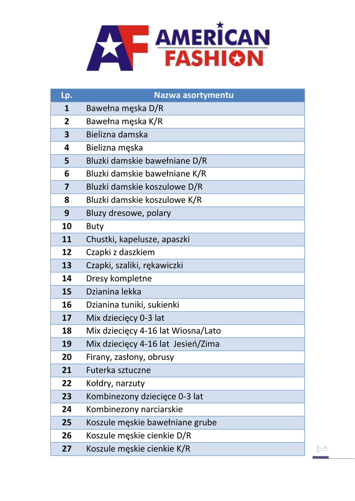 Lp. 1 2 3 4 5 6 7 8 9 10 11 12 13 14 15 16 17 18 19 20 21 22 23 24 25 26 27 Nazwa asortymentu Bawełna męska D/R Bawełna męska K/R Bielizna damska Bielizna męska Bluzki damskie bawełniane D/R Bluzki damskie bawełniane K/R Bluzki damskie koszulowe D/R Bluzki damskie koszulowe K/R Bluzy dresowe, polary Buty Chustki, kapelusze, apaszki Czapki z daszkiem Czapki, szaliki, rękawiczki Dresy kompletne Dzianina lekka Dzianina tuniki, sukienki Mix dziecięcy 0-3 lat Mix dziecięcy 4-16 lat Wiosna/Lato Mix dziecięcy 4-16 lat Jesieo/Zima Firany, zasłony, obrusy Futerka sztuczne Kołdry, narzuty Kombinezony dziecięce 0-3 lat Kombinezony narciarskie Koszule męskie bawełniane grube Koszule męskie cienkie D/R Koszule męskie cienkie K/R 28 29 30 31 32 33 34 35 36 37 38 39 40 41 42 43 44 45 46 47 48 49 50 51 52 53 54 55 Kurtki dziecięce lekkie Wiosna/Lato Kurtki dziecięce ocieplane Jesieo/Zima Kurtki lekkie Wiosna/Jesieo Kurtki ocieplane Jesieo/Zima Marynarki, garnitury męskie Mix damski Mix damsko - młodzieżowy Mix skórzany Mix sportowy Moda ciążowa Noworoczne kostiumy dziecięce Pan puszysty Pani puszysta Płaszcze MIX Pościel dziecięca Rybaczki Wiosna/Lato Rybaczki Jesieo/Zima Skarpety, rajstopy Spodenki krótkie bawełniane Spodnie dresowe Spodnie jeans damskie Spodnie jeans dziecięce Spodnie jeans męskie Spodnie męskie bawełna Spodnie męskie garniturowe Spodnie sztruksowe Stroje kąpielowe Sukienki wieczorowe 56 57 58 59 60 61 62 Swetry Szorty - spodenki krótkie damskie Szorty - spodenki krótkie dziewczęce Szorty - spodenki krótkie męskie T-shirts Wojskowe Zabawki miękkie