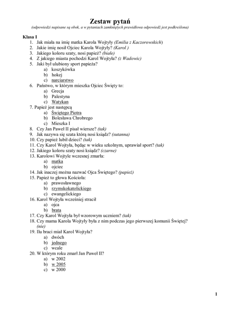 Zestaw pytań (odpowiedzi napisane są obok, a w pytaniach zamkniętych prawidłowa odpowiedź jest podkreślona) Klasa I 1. Jak miała na imię matka Karola Wojtyły (Emilia z Kaczorowskich) 2. Jakie imię nosił Ojciec Karola Wojtyły? (Karol ) 3. Jakiego koloru szaty, nosi papież? (białe) 4. Z jakiego miasta pochodzi Karol Wojtyła? (z Wadowic) 5. Jaki był ulubiony sport papieża? a) koszykówka b) hokej c) narciarstwo 6. Państwo, w którym mieszka Ojciec Święty to: a) Grecja b) Palestyna c) Watykan 7. Papież jest następcą a) Świętego Piotra b) Bolesława Chrobrego c) Mieszka I 8. Czy Jan Paweł II pisał wiersze? (tak) 9. Jak nazywa się szata którą nosi ksiądz? (sutanna) 10. Czy papież lubił dzieci? (tak) 11. Czy Karol Wojtyła, będąc w wieku szkolnym, uprawiał sport? (tak) 12. Jakiego koloru szaty nosi ksiądz? (czarne) 13. Karolowi Wojtyle wczesnej zmarła: a) matka b) ojciec 14. Jak inaczej można nazwać Ojca Świętego? (papież) 15. Papież to głowa Kościoła: a) prawosławnego b) rzymskokatolickiego c) ewangelickiego 16. Karol Wojtyła wcześniej stracił a) ojca b) brata 17. Czy Karol Wojtyła był wzorowym uczniem? (tak) 18. Czy mama Karola Wojtyły była z nim podczas jego pierwszej komunii Świętej? (nie) 19. Ilu braci miał Karol Wojtyła? a) dwóch b) jednego c) wcale 20. W którym roku zmarł Jan Paweł II? a) w 2002 b) w 2005 c) w 2000 1 Klasa II 1. Jaki zawód wykonywał brat Karola Wojtyły? (był lekarzem) 2. Jakie kolory ma flaga papieska? (biały i żółty) 3. Jak nazywał się zamachowiec, który strzelał do papieża 13 maja 1981roku? (Mehmet Ali Acga) 4. Jak jest ulubiona pieśń Jana Pawła II? (Barka) 5. Jakie imię nosił brat Karola Wojtyły? (Edmund) 6. Czym jest konklawe? a) to pierwsza msza odprawiana przez nowo wyświęconego kapłana b) to białe szaty papież c) to zgromadzenie kardynałów na którym wybierany jest nowy papież 7. Jakie były ulubione ciastka Karola Wojtyły? a) kremówki b) ptysie c) eklerki 8. Jak koledzy nazywali Karola Wojtyłę? d) Poeta e) Lolek f) Naukowiec 9. Co było wielką pasją Karola Wojtyły? a) teatr b) karty c) szachy 10. Gdzie, papież Jan Paweł II, spotkał się ze swym zamachowcem? a) w kościele b) w papieskiej rezydencji c) w więzieniu 11. Czy papieżowi udało się odbyć pielgrzymkę do Ziemi Świętej?(tak) 12. W którym roku Polak został wybrany na Papieża? (1978r) 13. Jak nazywa się samochód, którym porusza się Jan Paweł II podczas pielgrzymek? a) Perpetum Mobile b) Alfa Romeo c) Papa Mobile 14. Jaką nową część różańca ustanowił Jan Paweł II a) tajemnica zmartwychwstania b) tajemnica światła c) tajemnica Boska 15. Co oznaczają słowa habemus papam? a) Święta Maryja b) Zmiłuj się nad nami c) Mamy papieża 16. Jakie imię wybrał obecny papież? a) Benedykt XVI b) Henryk XVI c) Jan Paweł III 17. Jaka była ulubiona modlitwa Jana Pawła II? a) Różaniec b) droga krzyżowa c) Anioł Pański 2 18. Kto był osobistym sekretarzem Jana Pawła II przez cały pontyfikat? a) Stefan Wyszyński b) Stanisław Dziwisz c) Franciszek Macharski 19. Kim z zawodu był ojciec Karola Wojtyły? a) lekarzem b) wojskowym c) profesorem 20. Jak młodzież nazywała księdza Wojtyłę? a) ksiądz b) wujek c) nauczyciel Klasa III 1. W którym roku urodził się Karol Wojtyła? (1920r.) 2. Ile lat miał Karol Wojtyła, gdy zmarła jego mama? (9 lat) 3. W jakim mieście urodził się Karol Wojtyła? (w Wadowicach) 4. Podaj datę śmierci papieża. (2 kwietnia, 2005rok) 5. Gzie w czasie wojny pracował Karol Wojtyła a) w szwalni b) w sklepie c) w kamieniołomach 6. Na co zmarł brat Karola Wojtyły? a) na szkarlatynę b) na febrę c) gruźlicę 7. Karol Wojtyła, początkowo chciał studiować: a) medycynę b) polonistykę c) historię 8. Gdzie pochowany jest Ojciec Święty Jan Paweł II? a) Wadowicach w grobie rodzinnym b) W Krakowie, na Wawelu c) podziemiach Bazyliki Świętego Piotra 9. Co oznaczają słowa „Totus tuus"? a) Cały Twój b) Papież Polak c) Kocham Boga 10. Ile lat żył Ojciec Święty a) 98 lat b) 85 lat c) 73 lat 11. Jak nazywał się wielki przyjaciel Jana Pawła II? Był kardynałem i prymasem Polski w czasie, gdy Karol Wojtyła wybierany był na następcę Świętego Piotra. a) Stefan Wyszyński b) Ignacy Krasicki c) Piotr Skarga 3 12. W czasie nauki w gimnazjum przyszły Papież ze szczególnym zamiłowaniem przykładał się do nauki dwóch przedmiotów. Jednym z nich byłą religia. Jaki był drugi przedmiot? a) język polski b) fizyka c) matematyka 13. Jak nazywał się plac w Watykanie, na którym papież spotykał się z wiernymi? a) Plac św. Anny b) Plac św. Stanisława c) Plac św. Piotra 14. Skąd pochodzi zamachowiec Ojca Świętego Jana Pawła II? a) z Wenezueli b) z Rosji c) z Turcji 15. Jak nazywał się papież, sprawujący swój pontyfikat przed Janem Pawłem II? a) Benedykt XV b) Pius VIII c) Jan Paweł I 16. Którym z kolei papieżem był Jan Paweł II? a) 264 b) 521 c) 133 17. Ojciec Święty spotykał się z wiernymi na niedzielnej modlitwie: a) Różańcu Świętym b) Drodze Krzyżowej c) Anioł Pański 18. Jan Paweł II jest autorem: a) Tryptyku Rzymskiego b) Biblii c) Całego Różańca 19. W którym roku Karol Wojtyła otrzymał świecenia kapłańskie? a) 1985 b) 1946 c) 1933 20. Pierwsza parafia księdza Wojtyły to: a) Niegowić b) Kraków c) Kalwaria Zebrzydowska 4