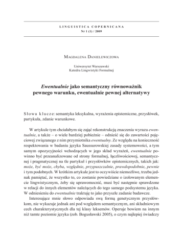 LINGUISTICA COPERNICANA Nr 1 (1) / 2009 M agdalena Danielewiczowa Uniwersytet Warszawski Katedra Lingwistyki Formalnej Ewentualnie jako semantyczny równoważnik pewnego warunku, ewentualnie pewnej alternatywy S ł o w a k l u c z e: semantyka leksykalna, wyrażenia epistemiczne, przysłówek, partykuła, zdanie warunkowe. W artykule tym chciałabym się zająć rekonstrukcją znaczenia wyrazu ewentualnie, a także – o wiele bardziej pobieżnie – odnieść się do zawartości pojęciowej związanego z nim przymiotnika ewentualny. Ze względu na konieczność respektowania w badaniu języka Saussurowskiej zasady systemowości, a tym samym opozycyjności wchodzących w jego skład wyrażeń, ewentualnie powinno być przeanalizowane od strony formalnej, łączliwościowej, semantycznej i pragmatycznej na tle partykuł i przysłówków epistemicznych, takich jak: może, być może, chyba, względnie, przypuszczalnie, prawdopodobnie, pewnie i tym podobnych. W krótkim artykule jest to oczywiście niemożliwe, trzeba jednak pamiętać, że wszystko to, co zostanie powiedziane o izolowanym elemencie lingwistycznym, żeby się uprawomocnić, musi być następnie sprawdzone w relacji do innych elementów należących do tego samego podsystemu języka. W odniesieniu do ewentualnie traktuję to jako przyszłe zadanie badawcze. Interesujące mnie słowo odpowiada swą formą genetycznym przysłówkom, nie wykazuje jednak ani pod względem semantycznym, ani składniowym cech charakterystycznych dla tej klasy leksemów. Operuje bowiem na innym niż tamte poziomie języka (zob. Bogusławski 2005), o czym najlepiej świadczy 78 Magdalena Danielewiczowa fakt, że w przeciwieństwie do najbardziej typowych przysłówków nie przyjmuje na siebie niekontrastywnego akcentu zdaniowego i nie podlega negacji. Co za tym idzie, nie łączy się w zwykły sposób, jak każdy modelowy przysłówek, z czasownikiem ani też z przysłówkowymi dookreślnikami, takimi jak np. intensyfikatory, por.: przeczyta sprawnie i * przeczyta ewentualnie [z akcentem na ewentualnie], całkiem sprawnie i * całkiem ewentualnie. W skład jego znaczenia, jak będę próbowała wykazać, wchodzą bowiem odniesione do innych treści komentarze podmiotu mówiącego, które zaburzają strukturę pojęciową wyrazu i czynią ją, ze względu na wewnętrzną budowę, synkretyczną (zob. Bogusławski 1979). Przyjrzyjmy się w pierwszej kolejności najbardziej typowym użyciom ewentualnie, które w większości zostały zaczerpnięte z korpusu języka polskiego opracowanego przez PWN: (1) Nie będę recytować. Ewentualnie mógłbym przeczytać coś na głos. (2) Należy sprawdzić stan uszczelki i ewentualnie wymienić ją na nową. (3) Mecz odbyłby się we Włoszech. W grę wchodzi ewentualnie współpraca z francuską telewizją. (4) Chodzi o to, czy fundamenty będą ewentualnie zdolne utrzymać nowy budynek. (5) Pójdziemy na spacer, ewentualnie do kina. (6) Na papierosa najlepiej pójść do drugiego pokoju, tam gdzie ewentualnie podany będzie deser. (7) Świeże ostrygi podaje się na pokruszonym lodzie, z cytryną i ewentualnie z białym pieprzem. (8) Zajęcia będą prowadzone z taktyki, historii wojskowości i ewentualnie geografii wojennej. (9) W skład komisji wejdzie dwóch, ewentualnie trzech studentów. (10) Miej przy sobie dowód, prawo jazdy (krajowe plus ewentualnie międzynarodowe). (11) Adres ewentualnie mógłbym podać, ale pozostałe dane są moją osobistą własnością. (12) Powiedział przecież, że ewentualnie mógłby się tym zająć. (13) Przed wyjściem ewentualnie zamknij okno. (14) Muszę wiedzieć, czy i ewentualnie jak chcecie się tam dostać. (15) Jeśli wrócimy przed piątą, to ewentualnie damy znać. Ewentualnie jako semantyczny równoważnik pewnego warunku... 79 O ile mi wiadomo, słowo ewentualnie nie było wcześniej przedmiotem szczegółowych analiz semantycznych. Jego znaczenie próbowano jednakże przybliżać w słownikach języka polskiego, a także w leksykonach poprawnościowych. I właśnie od krytycznego omówienia tych leksykograficznych propozycji rozpocznę moje obecne rozważania. We wszystkich podstawowych słownikach języka polskiego [a więc w tomach pod redakcją W. Doroszewskiego (SJPDor), M. Szymczaka (SJPSzym), B. Dunaja (SWJP), M. Bańki (ISJP) i S. Dubisza (USJP)] wyraz ewentualnie opisywany jest jako jednostka polisemiczna, a w dwóch spośród wymienionych opracowań jako wręcz homonimiczna. Chodzi mianowicie o to, że w SWJP i w ISJP wyróżnione zostały nie tylko dwa jej znaczenia, ale również dwie, niesprowadzalne do siebie nawzajem funkcje gramatyczne: w jednych kontekstach słowo to ma reprezentować klasę modalizatorów lub partykuł, w innych – spójników. Znaczenie spójnikowe jednostki ewentualnie uwzględniają wszystkie podstawowe leksykony: jest ona w nich mianowicie w części swych użyć pojęciowo utożsamiana z lub, albo, bądź, czy też, to znaczy ze spójnikami rozłącznymi, będącymi wykładnikami alternatywy. Znaczenie to ilustrują konteksty zaczerpnięte kolejno z SJPSzym i WSJP: Pójdziemy do kina ewentualnie do znajomych., Napiszę ewentualnie zadzwonię do was. Znamienna jest przy tym zastosowana tu pisownia. Ponieważ w wypadku ewentualnie mamy jakoby do czynienia z czymś w rodzaju spójnika rozłącznego, więc zgodnie z obowiązującymi zasadami interpunkcji przed wyrazem tym autorzy odpowiednich haseł nie stawiają przecinka, co jest bardzo kontrowersyjne. Zapis z przecinkiem występuje w SJPDor i USJP. Podobnie jest w ISJP. W takim „spójnikowym” użyciu znajdujemy tu przed ewentualnie przecinek, a ponadto autor hasła, nie usatysfakcjonowany najwyraźniej eksplikacjami w postaci wyliczenia spójników rozłącznych, daje glosę bardziej rozczłonkowaną i w punkcie 2., który ma się odnosić do ewentualnie będącego wcieleniem spójnika centralnego, stwierdza, co następuje: Jeśli wymieniając kilka możliwości, 