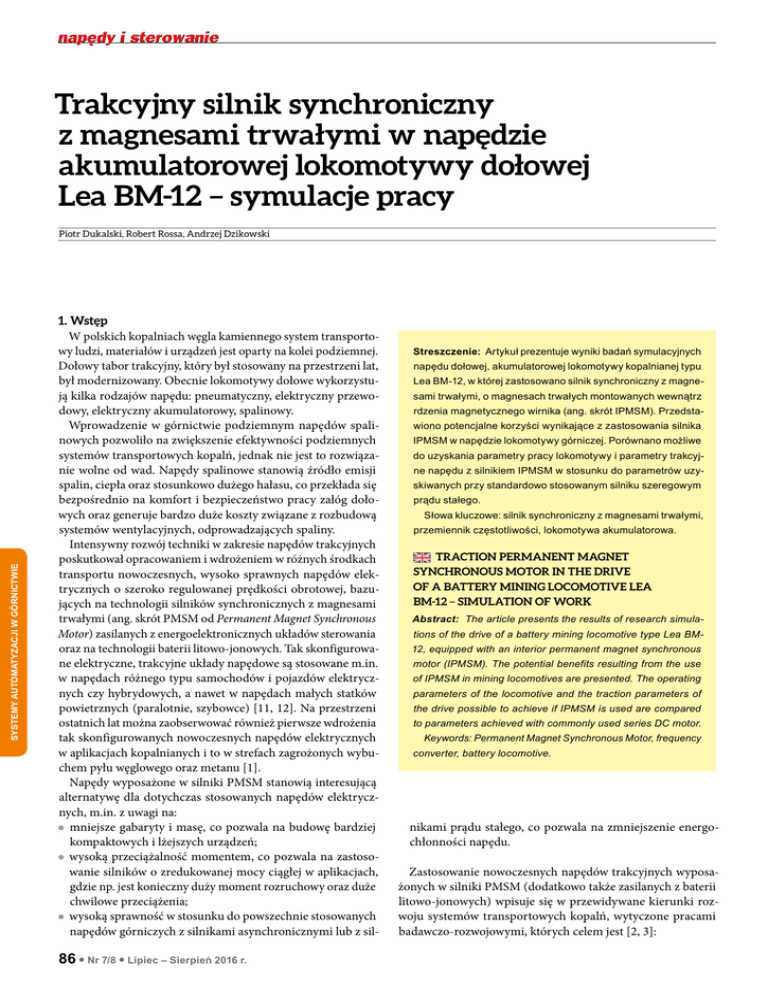 Trakcyjny silnik synchroniczny z magnesami trwałymi w napędzie akumulatorowej lokomotywy dołowej lea bm-12 – symulacje pracy SYSTEMY AUTOMATYZACJI W GÓRNICTWIE Piotr Dukalski, Robert Rossa, Andrzej Dzikowski 1. Wstęp W polskich kopalniach węgla kamiennego system transportowy ludzi, materiałów i urządzeń jest oparty na kolei podziemnej. Dołowy tabor trakcyjny, który był stosowany na przestrzeni lat, był modernizowany. Obecnie lokomotywy dołowe wykorzystują kilka rodzajów napędu: pneumatyczny, elektryczny przewodowy, elektryczny akumulatorowy, spalinowy. Wprowadzenie w górnictwie podziemnym napędów spalinowych pozwoliło na zwiększenie efektywności podziemnych systemów transportowych kopalń, jednak nie jest to rozwiązanie wolne od wad. Napędy spalinowe stanowią źródło emisji spalin, ciepła oraz stosunkowo dużego hałasu, co przekłada się bezpośrednio na komfort i bezpieczeństwo pracy załóg dołowych oraz generuje bardzo duże koszty związane z rozbudową systemów wentylacyjnych, odprowadzających spaliny. Intensywny rozwój techniki w zakresie napędów trakcyjnych poskutkował opracowaniem i wdrożeniem w różnych środkach transportu nowoczesnych, wysoko sprawnych napędów elektrycznych o szeroko regulowanej prędkości obrotowej, bazujących na technologii silników synchronicznych z magnesami trwałymi (ang. skrót PMSM od Permanent Magnet Synchronous Motor) zasilanych z energoelektronicznych układów sterowania oraz na technologii baterii litowo-jonowych. Tak skonfigurowane elektryczne, trakcyjne układy napędowe są stosowane m.in. w napędach różnego typu samochodów i pojazdów elektrycznych czy hybrydowych, a nawet w napędach małych statków powietrznych (paralotnie, szybowce) [11, 12]. Na przestrzeni ostatnich lat można zaobserwować również pierwsze wdrożenia tak skonfigurowanych nowoczesnych napędów elektrycznych w aplikacjach kopalnianych i to w strefach zagrożonych wybuchem pyłu węglowego oraz metanu [1]. Napędy wyposażone w silniki PMSM stanowią interesującą alternatywę dla dotychczas stosowanych napędów elektrycznych, m.in. z uwagi na: zz mniejsze gabaryty i masę, co pozwala na budowę bardziej kompaktowych i lżejszych urządzeń; zz wysoką przeciążalność momentem, co pozwala na zastosowanie silników o zredukowanej mocy ciągłej w aplikacjach, gdzie np. jest konieczny duży moment rozruchowy oraz duże chwilowe przeciążenia; zz wysoką sprawność w stosunku do powszechnie stosowanych napędów górniczych z silnikami asynchronicznymi lub z sil- 86 l Nr 7/8 l Lipiec – Sierpień 2016 r. Streszczenie: Artykuł prezentuje wyniki badań symulacyjnych napędu dołowej, akumulatorowej lokomotywy kopalnianej typu Lea BM-12, w której zastosowano silnik synchroniczny z magnesami trwałymi, o magnesach trwałych montowanych wewnątrz rdzenia magnetycznego wirnika (ang. skrót IPMSM). Przedstawiono potencjalne korzyści wynikające z zastosowania silnika IPMSM w napędzie lokomotywy górniczej. Porównano możliwe do uzyskania parametry pracy lokomotywy i parametry trakcyjne napędu z silnikiem IPMSM w stosunku do parametrów uzyskiwanych przy standardowo stosowanym silniku szeregowym prądu stałego. Słowa kluczowe: silnik synchroniczny z magnesami trwałymi, przemiennik częstotliwości, lokomotywa akumulatorowa. TRACTION PERMANENT MAGNET SYNCHRONOUS MOTOR IN THE DRIVE OF A BATTERY MINING LOCOMOTIVE LEA BM-12 – SIMULATION OF WORK Abstract: The article presents the results of research simulations of the drive of a battery mining locomotive type Lea BM12, equipped with an interior permanent magnet synchronous motor (IPMSM). The potential benefits resulting from the use of IPMSM in mining locomotives are presented. The operating parameters of the locomotive and the traction parameters of the drive possible to achieve if IPMSM is used are compared to parameters achieved with commonly used series DC motor. Keywords: Permanent Magnet Synchronous Motor, frequency converter, battery locomotive. nikami prądu stałego, co pozwala na zmniejszenie energochłonności napędu. Zastosowanie nowoczesnych napędów trakcyjnych wyposażonych w silniki PMSM (dodatkowo także zasilanych z baterii litowo-jonowych) wpisuje się w przewidywane kierunki rozwoju systemów transportowych kopalń, wytyczone pracami badawczo-rozwojowymi, których celem jest [2, 3]: Tabela 1. Podstawowe dane techniczne lokomotyw akumulatorowych [4] Tabela 2. Porównanie parametrów znamionowych silnika szeregowego LDs-327 oraz proponowanego silnika PMSM Typ lokomotywy Parametr Siła pociągowa kN Typ silnika Lea BM8 Lea BM12 Lea BM15 Ldag 05M 11,2 16,8 16,8 5,3 Prędkość km/h 7 8 8 7,2 Prędkość max. km/h 14 16 16 14,4 Moc godzinowa (S2-60) kW 24 38 25 11 Liczba silników szt. 1 1 2 2 Napięcie baterii V 110 144 240 84 Ah 570 760 2x330 420 Pojemność akumulatora zmniejszenie emisji szkodliwych spalin do atmosfery kopalnianej; zz zmniejszenie generowania hałasu i emisji ciepła przez spalinowe jednostki napędowe; zz opracowanie napędów elektrycznych z nową generacją akumulatorów i silników elektrycznych; zz optymalizacja oprzyrządowania silników pod kątem zmniejszenia zużycia energii oraz kosztów wytwarzania; zz zwiększenie wydatku mocy silnika przy ograniczonym zużyciu paliwa (energii). zz 2. Lokomotywa akumulatorowa typu Lea BM-12 W systemach transportowych krajowych kopalń podziemnych dominują dwa typy lokomotyw: Lea BM-12 (o masie 12 ton) oraz Ldag-05 (o masie 5,5 tony). Obie te lokomotywy są zasilane z baterii trakcyjnej. Zostały one opracowane w latach 60/70. XX wieku, natomiast zaprzestano ich produkcji w latach 90. Prace projektowe oraz badawcze, prowadzone przez autorów artykułu, dotyczą lokomotywy Lea BM-12, która jest stosowana do transportu ludzi, urobku oraz materiałów. W Polsce nie są produkowane lokomotywy elektryczne stanowiące odpowiednik lokomotyw Lea BM-12, co stanowi o konieczności coraz czę