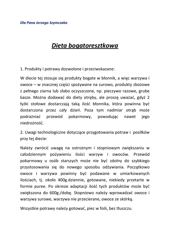 Dla Pana Jerzego Szymczaka Dieta bogatoresztkowa 1. Produkty i potrawy dozwolone i przeciwskazane: W diecie tej stosuje się produkty bogate w błonnik, a więc warzywa i owoce – w znacznej części spożywane na surowo, produkty zbożowe z pełnego ziarna lub słabo oczyszczone, np. pieczywo razowe, grube kasze. Można dodawać do diety otręby, ale proszę uważać, gdyż 2 łyżki stołowe dostarczają taką ilość błonnika, która powinna być dostarczona przez cały dzień. Poza tym nadmiar otrąb może podrażniać przewód pokarmowy, powodując nawet jego niedrożność. 2. Uwagi technologiczne dotyczące przygotowania potraw i posiłków przy tej diecie: Należy zwrócić uwagę na ostrożnym i stopniowym zwiększaniu w całodziennym pożywieniu ilości warzyw i owoców. Przewód pokarmowy u osób starszych może nie być zdolny do szybkiego przystosowania się do nowego sposobu odżywiania. Początkowo owoce i warzywa powinny być podawane w umiarkowanych ilościach, tj. około 400g.dziennie, gotowane, niekiedy przetarte w formie puree. Po okresie adaptacji ilość tych produktów może być zwiększona do 600g./dobę. Stopniowo należy wprowadzać owoce i warzywa surowe, warzywa nie przecierane, owoce ze skórką. Wszystkie potrawy należy gotować, piec w folii, bez tłuszczu. 3. Propozycje potraw na poszczególne posiłki: Śniadania: zupy mleczne (mleko 2%) z dodatkiem kaszy, płatków zbożowych, kawa inka lub bawarka – jeśli podawana jest zupa mleczna, napój może stanowić herbata lub herbata z cytryną. Pieczywo w przeważającej części razowe z dodatkiem wysokogatunkowej margaryny. Produktem białkowym dodawanym do pieczywa mogą być sery białe chude, wędliny chude, mięsa pieczone podawane na zimno, jaja gotowane – dozwolone 2 w tygodniu, pasty jajeczne, kiełbasy drobiowe, ryby wędzone – jeśli są tolerowane przez Pana Jerzego. Można dodawać dżem niskosłodzony – ważne aby był drobnopestkowy, tj. porzeczkowy, agrestowy, malinowy, truskawkowy. Podajemy także owoce i warzywa, najlepiej surowe i ze skórką, oczywiście w przypadku dobrego tolerowania prze Pana Andrzeja, a także uprzednim okresie adaptacji. Obiady: podajemy zupy różne – jarzynowe z dużą ilością warzyw, krupniki z grubymi kaszami, barszcz ukraiński, fasolowe lub grochowe – jeżeli są tolerowane i najlepiej rozgotowane, zupy owocowe. Dania mięsne, półmięsne, rybne, z sera białego – wszystkie produkty muszą być chude, z ograniczoną ilością tłuszczu. Jako dodatek: ziemniaki, kasze gruboziarniste, rzadziej makarony. Warzywa oprócz dodatku do zup powinny być jeszcze podane w formie surówki i jako warzywo gotowane. Podwieczorki: owoce surowe podawane oddzielnie lub w formie sałatek, kompoty, kisiele, galaretki, budynie, musy owocowe. Koktajle z dodatkiem jogurtu naturalnego. Kolacja: kurczak lub ryba w galarecie, leniwe pierogi, zapiekanka warzywna, risotto z kaszy jęczmiennej, mięsa chudego i warzyw, kasza jaglana z owocami. Napoje, pieczywo, margaryna takie jak w przypadku śniadań. Przykładowy jadłospis: I śniadanie: kawa z mlekiem, chleb żytni razowy, margaryna wysokogatunkowa, szynka drobiowa, pomidor, sałata zielona, jabłko; II śniadanie: chleb Graham z dodatkiem sera białego twarogowego chudego i powideł, herbata; Obiad: pomidorowa ze świeżych pomidorów z ryżem, pierś z kurczaka pieczona w folii, bez tłuszczu, z dodatkiem banana, jabłka, mizeria z dodatkiem jogurtu naturalnego lub śmietaną 12%; Podwieczorek: sałatka owocowa z owoców sezonowych bez dodatku cukru; Kolacja: słaba herbata, leniwe pierogi, cykoria