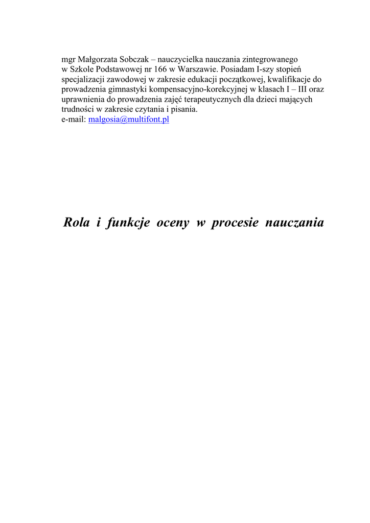 mgr Małgorzata Sobczak – nauczycielka nauczania zintegrowanego w Szkole Podstawowej nr 166 w Warszawie. Posiadam I-szy stopień specjalizacji zawodowej w zakresie edukacji początkowej, kwalifikacje do prowadzenia gimnastyki kompensacyjno-korekcyjnej w klasach I – III oraz uprawnienia do prowadzenia zajęć terapeutycznych dla dzieci mających trudności w zakresie czytania i pisania. e-mail: [email protected] Rola i funkcje oceny w procesie nauczania Spis treści Wstęp.........................................................................................................3 Rozdział I . Ocena w procesie nauczania..................................................3 1. Podstawowe pojęcia ..................................................................3 2. Zasady kontrolowania i oceniania..............................................5 3. Ocena szkolna............................................................................5 Rozdział II. Rola i funkcje oceny w świetle ustawy o systemie oświaty ( tekst znowelizowany)......................................11 1. Czym powinno być ocenianie?................................................11 2. Czemu służy ocenianie w szkole?...........................................12 Rozdział III. Pedagogiczne aspekty oceny procesu nauczania...............15 1. Wpływ oceny na ucznia...........................................................15 2. Rola nauczyciela w procesie oceniania uczniów ....................16 Rozdział IV. Wewnątrzszkolny system oceniania..................................18 1. Szkolny system oceniania ...................................................... 18 2. Wewnątrzszkolny system oceniania ........................................22 Zakończenie............................................................................................27 Bibliografia.............................................................................................28 2 WSTĘP Ocenianie jest powszechną praktyką życia. Ustawicznie zbieramy informacje o ludziach, wytworach, miejscach, możliwościach, zachowaniach. Ocenianie polega na oszacowaniu wartości rozmaitych stanów lub zdarzeń. Aby oszacowanie mogło nastąpić, trzeba zgromadzić szereg informacji o wartościach ocenianego zjawiska, koniecznych do podjęcia decyzji orzekającej: czy coś jest dobre czy złe, przydatne – czy zbędne, drogie – czy tanie, wartościowe – czy bezwartościowe, czy coś przyjmujemy – czy odrzucamy lub zmieniamy, czy skutki jakiegoś procesu są zgodne z określonymi celami. W ocenianiu posługujemy się ustalonymi kryteriami oceny jakości. Cały czas, już od najmłodszych lat, jesteśmy poddawani permanentnej ocenie. Jakże często słyszymy „ robisz to dobrze, źle, tak, nie tak...”. Oceny wypowiadane przez kogoś, przenikają bardzo głęboko, konstruując matrycę pewności, własnych kompetencji, obrazu samego siebie i poczucia własnej wartości – często kolein na całe życie. Jest to właśnie podstawowy powód dla którego jakość komunikatów oceniających jest tak bardzo ważna. Z ocenianiem spotykamy się również w procesie edukacji szkolnej. Ocena bowiem, jest integralną częścią tego procesu – dyrektor ocenia pracę nauczycieli, nauczyciele oceniają swoich uczniów, uczniowie oceniają swoich nauczycieli, choć nie zawsze mogą to robić oficjalnie. Ocena rozwoju ucznia jest trudna, obarczona pomyłkami i dlatego żadna nie może być uznawana za ostateczną. Rozwój dziecka jest procesem ciągłym, ciągły charakter ma też jego ocenianie. Rozwój dziecka jest procesem złożonym, nie można go więc szacować na podstawie jednego lub trzech składników. ROZDZIAŁ I. OCENA W PROCESIE NAUCZANIA 1.Podstawowe pojęcia. Kontrolując pewną działalność – własną lub innych ludzi – szukamy odpowiedzi co najmniej na trzy pytania:- „jak jest?”, porównujemy z tym „jak być powinno?” i wskazujemy – „jak można wykonać to lepiej?”. Odpowiedź na drugie pytanie prowadzi do oceny. Przez kontrolę rozumiemy zorganizowaną czynność, której zadaniem jest: 3 1) zbadanie aktualnego i wcześniejszego stanu rzeczy, 2) ustalenie, czy dane działanie przebiega zgodnie z przyjętym planem i czy wynik tego działania odpowiada zamierzonemu celowi, 3) oraz wskazanie sposobów usprawniania tego działania tak, aby możliwe było osiągnięcie zamierzonego celu w sposób najbardziej racjonalny. Materiały uzyskane w toku kontroli służą do ustalenia oceny i opinii. Na podstawie tych materiałów porównujemy dane działanie (jego organizację, plan, metody) z pewnym wzorcem tego działania oraz osiągnięte wyniki z zamierzonym celem i ujmujemy rezultaty tego porównania w formę słowną lub liczbę, co właśnie nazywamy oceną. Oceny wyrażają wydawane przez człowieka sądy, będące odpowiedzią na pytania postawione w określonym momencie. Odnoszą się one zarówno do nowo poznanych, jak i dobrze znanych osób. Ocenianie polega więc na przyporządkowaniu odpowiednich liczb wyznaczonym osobom, pewnym zdarzeniom lub efektom ich pracy i jest wyrażaniem na skali natężenia ocenianych jakości, np. atrakcyjności, wiarygodności, umiejętności i innych. Ocena odnosi się do jednej, ściśle określonej działalności człowieka np. jego wyników w nauce języka ojczystego, historii, geografii. Opinia obejmuje szerszy zakres jego działalności w dłuższym okresie czasu (np. pracę zawodową w pewnej instytucji, współżycie w rodzinie, wyniki w nauce) i jest zbiorem ocen dotyczących różnorodnej działalności człowieka, na podstawie których ustala się ocenę ogólną jego osobowości ze względu na system wartości przyjęty przez oceniającego. W opinii pogłębionej znajdą się odpowiedzi na pytania „dlaczego dana osoba jest taka, jaka jest?” i uzasadnienie możliwości jej dalszego rozwoju. Tak pogłębiona opinia zbliża się do charakterystyki człowieka. Zależnie od celu postawione