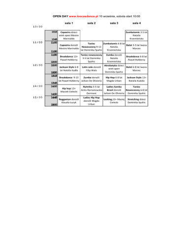 OPEN DAY www.loocasdance.pl 10 września, sobota start 10:00 sala 1 sala 2 sala 3 sala 4 10:00 1015 11:00 12:00 14:00 15:00 Capoeira dzieci wiek open Mestre Marinaldo 1045 1100 Capoeira dorośli Mestre Marinaldo 1130 1130 Breakdance 13+ Paweł Hołderny 1200 1200 Jackson Style 6-8 lat Natalia Kudła 1230 1315 Breakdance 9-13 lat Paweł Hołderny 1345 1400 Hip hop 13+ Maciek Cielecki 1430 1445 Reggaeton dorośli Klaudia Łucyk 1500 Zumbatomic 3-5 lat Natalia Krzemieńska Zumbatomic 6-8 lat Taniec Balet 3-5 lat Iwona Natalia Nowoczesny 9-13 Marzec Krzemieńska lat Dominika Spahic Taniec nowoczesny 3-5 lat Dominika Spahic Latin solo dorośli Filip Wala Zumba dorośli Jailson De Olivieria Zumba dorośli Natalia Krzemieńska Breakdance 6-8 lat Paweł Hołderny Akrobatyka dzieci Balet 6-8 lat Iwona wiek open Marzec Dominika Spahic Hip Hop 6-8 lat Magda Urban Jackson Style 13+ Natalia Kudała Rytmika 3-5 lat Ladies Samba Taniec Anita RomanowskaBrasil dorośli Nowoczesny 6-8 lat Dermont Jailson De Olivieria Dominika Spahic Ladies Hip Hop dorośli Magda Urban Locking,13+ Maciej Cielecki Stretching dzieci Dominika Spahic