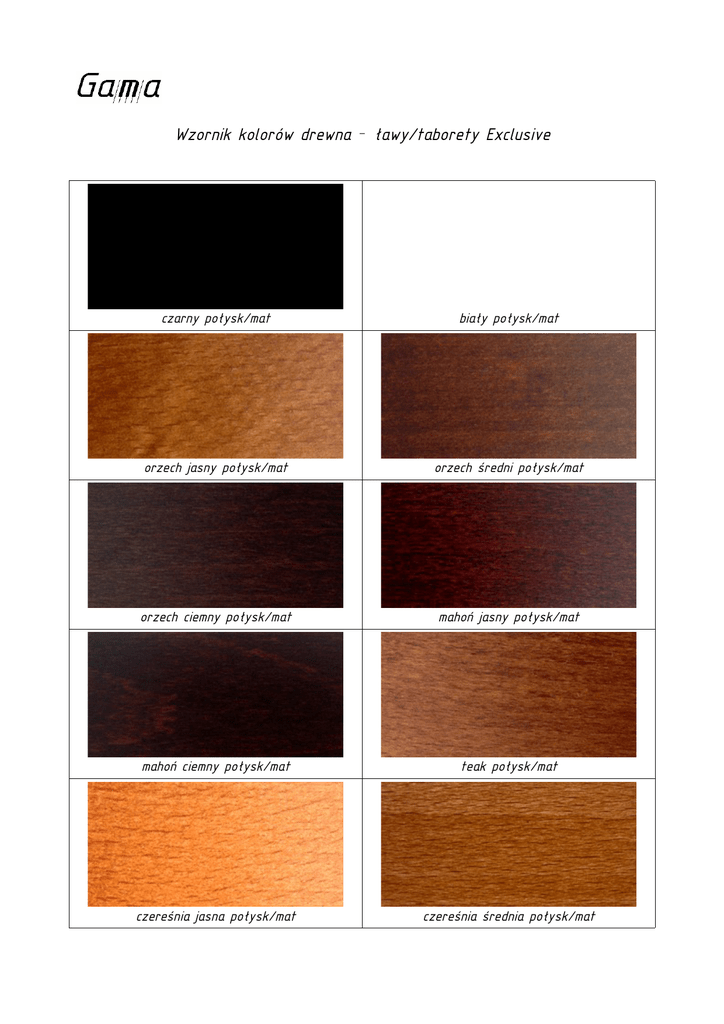 Wzornik kolorów drewna – ławy/taborety Exclusive czarny połysk/mat biały połysk/mat orzech jasny połysk/mat orzech średni połysk/mat orzech ciemny połysk/mat mahoń jasny połysk/mat mahoń ciemny połysk/mat teak połysk/mat czereśnia jasna połysk/mat czereśnia średnia połysk/mat buk połysk/mat dąb połysk/mat dąb rustykalny połysk/mat olcha połysk/mat drewno róży połysk/mat palisander jasny połysk/mat palisander ciemny połysk/mat Przedstawiony wzornik ma wyłącznie charakter poglądowy, kolory na monitorze mogą nieznacznie odbiegać od rzeczywistej kolorystyki. Dystrybutor ław i taboretów Exclusive ul. Górnośląska 17 43-200 Pszczyna tel: (32) 212 88 55 [email protected] www.pianina.pl