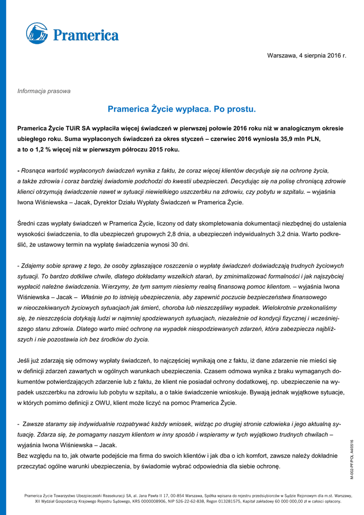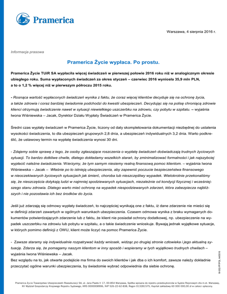Warszawa, 4 sierpnia 2016 r. Informacja prasowa Pramerica Życie wypłaca. Po prostu. Pramerica Życie TUiR SA wypłaciła więcej świadczeń w pierwszej połowie 2016 roku niż w analogicznym okresie ubiegłego roku. Suma wypłaconych świadczeń za okres styczeń – czerwiec 2016 wyniosła 35,9 mln PLN, a to o 1,2 % więcej niż w pierwszym półroczu 2015 roku. - Rosnąca wartość wypłaconych świadczeń wynika z faktu, że coraz więcej klientów decyduje się na ochronę życia, a także zdrowia i coraz bardziej świadomie podchodzi do kwestii ubezpieczeń. Decydując się na polisę chroniącą zdrowie klienci otrzymują świadczenie nawet w sytuacji niewielkiego uszczerbku na zdrowiu, czy pobytu w szpitalu. – wyjaśnia Iwona Wiśniewska – Jacak, Dyrektor Działu Wypłaty Świadczeń w Pramerica Życie. Średni czas wypłaty świadczeń w Pramerica Życie, liczony od daty skompletowania dokumentacji niezbędnej do ustalenia wysokości świadczenia, to dla ubezpieczeń grupowych 2,8 dnia, a ubezpieczeń indywidualnych 3,2 dnia. Warto podkreślić, że ustawowy termin na wypłatę świadczenia wynosi 30 dni. - Zdajemy sobie sprawę z tego, że osoby zgłaszające roszczenia o wypłatę świadczeń doświadczają trudnych życiowych sytuacji. To bardzo dotkliwe chwile, dlatego dokładamy wszelkich starań, by zminimalizować formalności i jak najszybciej wypłacić należne świadczenia. Wierzymy, że tym samym niesiemy realną finansową pomoc klientom. – wyjaśnia Iwona Wiśniewska – Jacak – Właśnie po to istnieją ubezpieczenia, aby zapewnić poczucie bezpieczeństwa finansowego w nieoczekiwanych życiowych sytuacjach jak śmierć, choroba lub nieszczęśliwy wypadek. Wielokrotnie przekonaliśmy się, że nieszczęścia dotykają ludzi w najmniej spodziewanych sytuacjach, niezależnie od kondycji fizycznej i wcześniejszego stanu zdrowia. Dlatego warto mieć ochronę na wypadek niespodziewanych zdarzeń, która zabezpiecza najbliższych i nie pozostawia ich bez środków do życia. Jeśli już zdarzają się odmowy wypłaty świadczeń, to najczęściej wynikają one z faktu, iż dane zdarzenie nie mieści się w definicji zdarzeń zawartych w ogólnych warunkach ubezpieczenia. Czasem odmowa wynika z braku wymaganych dokumentów potwierdzających zdarzenie lub z faktu, że klient nie posiadał ochrony dodatkowej, np. ubezpieczenie na wypadek uszczerbku na zdrowiu lub pobytu w szpitalu, a o takie świadczenie wnioskuje. Bywają jednak wyjątkowe sytuacje, w których pomimo definicji z OWU, klient może liczyć na pomoc Pramerica Życie. - Zawsze staramy się indywidualnie rozpatrywać każdy wniosek, widząc po drugiej stronie człowieka i jego aktualną sywyjaśnia Iwona Wiśniewska – Jacak. Bez względu na to, jak otwarte podejście ma firma do swoich klientów i jak dba o ich komfort, zawsze należy dokładnie przeczytać ogólne warunki ubezpieczenia, by świadomie wybrać odpowiednia dla siebie ochronę. M-002-PF/POL A4/0516 tuację. Zdarza się, że pomagamy naszym klientom w inny sposób i wspieramy w tych wyjątkowo trudnych chwilach – Pramerica Życie Towarzystwo Ubezpieczeńń i Reasekuracji SA, al. Jana Pawła II 17, 00-854 Warszawa, Spółka wpisana do rejestru przedsiębiorców w Sądzie Rejonowym dla m.st. Warszawy, XII Wydział Gospodarczy Krajowego Rejestru Sądowego, KRS 0000008906, NIP 526-22-62-838, Regon 013281575, Kapitał zakładowy 60 000 000,00 zł w całości opłacony. Dodatkowe informacje: Małgorzata Morańska, [email protected], Tel. (+48) 660 755 238 Pramerica Życie TUiR SA należy do grupy kapitałowej Prudential Financial, Inc.- jednej z największych instytucji finansowych na świecie z ponad 140letnią historią. W Polsce oferujemy ubezpieczenia na życie o jednym z najszerszych zakresów ochrony. Na rynku wyróżnia nas wyjątkowa dbałość o Klientów i ich zaufanie a także najwyższe standardy obsługi. Naszym Klientom dajemy realne oparcie finansowe w momencie, gdy tego najbardziej potrzebują, a przez cały okres współpracy chronimy to, co dla nich najważniejsze, pomagając im czerpać więcej z życia. Tworzymy przyjazne i oparte na szacunku środowisko pracy, w którym ambitni i wyjątkowi ludzie mogą się rozwijać, realizować swój potencjał i osiągać sukcesy. Dzięki stabilnym fundamentom - naszym wartościom - towarzyszącym nam w codziennej pracy wspólnie tworzymy firmę, która wspiera klientów w realizacji ich celów życiowych i odpowiada na ich dynamicznie zmieniające się potrzeby. Więcej na www.pramerica.pl Prudential Financial, Inc., spółka zarejestrowana w Stanach Zjednoczonych, nie jest powiązany w żaden sposób z Prudential plc, spółką zarejestrowaną w Wielkiej Brytanii. Więcej informacji na temat PFI można znaleźć na stronie www.prudential.com. 2