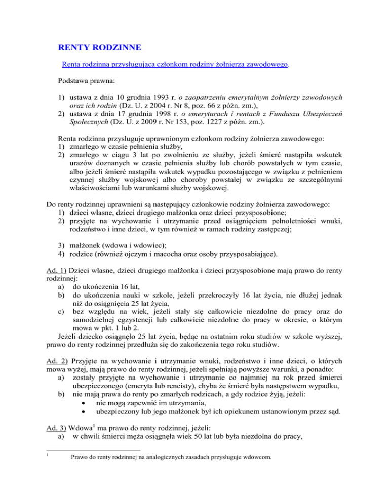 RENTY RODZINNE Renta rodzinna przysługująca członkom rodziny żołnierza zawodowego. Podstawa prawna: 1) ustawa z dnia 10 grudnia 1993 r. o zaopatrzeniu emerytalnym żołnierzy zawodowych oraz ich rodzin (Dz. U. z 2004 r. Nr 8, poz. 66 z późn. zm.), 2) ustawa z dnia 17 grudnia 1998 r. o emeryturach i rentach z Funduszu Ubezpieczeń Społecznych (Dz. U. z 2009 r. Nr 153, poz. 1227 z późn. zm.). Renta rodzinna przysługuje uprawnionym członkom rodziny żołnierza zawodowego: 1) zmarłego w czasie pełnienia służby, 2) zmarłego w ciągu 3 lat po zwolnieniu ze służby, jeżeli śmierć nastąpiła wskutek urazów doznanych w czasie pełnienia służby lub chorób powstałych w tym czasie, albo jeżeli śmierć nastąpiła wskutek wypadku pozostającego w związku z pełnieniem czynnej służby wojskowej albo choroby powstałej w związku ze szczególnymi właściwościami lub warunkami służby wojskowej. Do renty rodzinnej uprawnieni są następujący członkowie rodziny żołnierza zawodowego: 1) dzieci własne, dzieci drugiego małżonka oraz dzieci przysposobione; 2) przyjęte na wychowanie i utrzymanie przed osiągnięciem pełnoletniości wnuki, rodzeństwo i inne dzieci, w tym również w ramach rodziny zastępczej; 3) małżonek (wdowa i wdowiec); 4) rodzice (również ojczym i macocha oraz osoby przysposabiające). Ad. 1) Dzieci własne, dzieci drugiego małżonka i dzieci przysposobione mają prawo do renty rodzinnej: a) do ukończenia 16 lat, b) do ukończenia nauki w szkole, jeżeli przekroczyły 16 lat życia, nie dłużej jednak niż do osiągnięcia 25 lat życia, c) bez względu na wiek, jeżeli stały się całkowicie niezdolne do pracy oraz do samodzielnej egzystencji lub całkowicie niezdolne do pracy w okresie, o którym mowa w pkt. 1 lub 2. Jeżeli dziecko osiągnęło 25 lat życia, będąc na ostatnim roku studiów w szkole wyższej, prawo do renty rodzinnej przedłuża się do zakończenia tego roku studiów. Ad. 2) Przyjęte na wychowanie i utrzymanie wnuki, rodzeństwo i inne dzieci, o których mowa wyżej, mają prawo do renty rodzinnej, jeżeli spełniają powyższe warunki, a ponadto: a) zostały przyjęte na wychowanie i utrzymanie co najmniej na rok przed śmierci ubezpieczonego (emeryta lub rencisty), chyba że śmierć była następstwem wypadku, b) nie mają prawa do renty po zmarłych rodzicach, a gdy rodzice żyją, jeżeli: nie mogą zapewnić im utrzymania, ubezpieczony lub jego małżonek był ich opiekunem ustanowionym przez sąd. Ad. 3) Wdowa1 ma prawo do renty rodzinnej, jeżeli: a) w chwili śmierci męża osiągnęła wiek 50 lat lub była niezdolna do pracy, 1 Prawo do renty rodzinnej na analogicznych zasadach przysługuje wdowcom. b) wychowuje co najmniej jedno z dzieci, wnuków lub rodzeństwa uprawnione do renty rodzinnej po zmarłym mężu, które nie osiągnęło 16 lat, a jeżeli kształci się w szkole - 18 lat życia, lub jeżeli sprawuje pieczę nad dzieckiem całkowicie niezdolnym do pracy oraz do samodzielnej egzystencji lub całkowicie niezdolnym do pracy, uprawnionym do renty rodzinnej. Prawo do renty rodzinnej nabywa również wdowa, która osiągnęła wiek 50 lat lub stała się niezdolna do pracy po śmierci męża, nie później jednak niż w ciągu 5 lat od jego śmierci lub od zaprzestania wychowywania osób wymienionych w pkt. 3b. Małżonka rozwiedziona lub wdowa, która do dnia śmierci męża nie pozostawała z nim we wspólności małżeńskiej, ma prawo do renty rodzinnej, jeżeli oprócz spełnienia warunków określonych w pkt. 3a lub 3b miała w dniu śmierci męża prawo do alimentów z jego strony ustalone wyrokiem lub ugodą sądową. Wdowa niespełniająca warunków do renty rodzinnej określonych w pkt. 3a lub 3b i niemająca niezbędnych źródeł utrzymania ma prawo do okresowej renty rodzinnej: 1) przez okres jednego roku od chwili śmierci męża; 2) w okresie uczestniczenia w zorganizowanym szkoleniu mającym na celu uzyskanie kwalifikacji do wykonywania pracy zarobkowej, nie dłużej jednak niż przez 2 lata od chwili śmierci męża. W razie śmierci żołnierza w czasie wykonywania zadań służbowych poza granicami państwa lub w razie śmierci żołnierza po zwolnieniu ze służby, jeżeli śmierć nastąpiła wskutek wypadku albo choroby powstałej w czasie wykonywania zadań służbowych poza granicami państwa, związanych z udziałem w: 1) konflikcie zbrojnym lub dla wzmocnienia sił państwa albo państw sojuszniczych, 2) misji pokojowej, 3) akcji zapobieżenia aktom terroryzmu lub ich skutkom, renta rodzinna przysługuje małżonkowi bez względu na wiek i stan zdrowia. Ad. 4) Rodzice mają prawo do renty rodzinnej, jeżeli: a) zmarły żołnierz bezpośrednio przed śmiercią przyczyniał się do ich utrzymania; b) spełniają odpowiednio warunki określone w ustawie dla wdowy i wdowca, tj.: w chwili śmierci żołnierza osiągnęli wiek 50 lat lub byli niezdolni do pracy, wychowują co najmniej jedno z dzieci, wnuków lub rodzeństwa uprawnione do renty rodzinnej po zmarłym żołnierzu, które nie osiągnęło 16 lat, a jeżeli kształci się w szkole – 18 lat życia, lub jeżeli sprawuje pieczę nad dzieckiem całkowicie niezdolnym do pracy oraz do samodzielnej egzystencji lub całkowicie niezdolnym do pracy, uprawnionym do renty rodzinnej. Wszystkim uprawnionym członkom rodziny przysługuje jedna łączna renta rodzinna, która podlega podziałowi na równe części między uprawnionych. Renta rodzinna wynosi: 1) dla jednej osoby uprawnionej - 85% świadczenia, które przysługiwałoby zmarłemu; 2) dla dwóch osób uprawnionych - 90% świadczenia, które przysługiwałoby zmarłemu; 3) dla trzech lub więcej osób uprawnionych - 95% świadczenia, które przysługiwałoby zmarłemu. Podstawa wymiaru renty rodzinnej: 1) w razie śmierci żołnierza rentę rodzinną wymierza się od renty inwalidzkiej I grupy, jaka przysługiwałaby temu żołnierzowi w dniu śmierci, bez uwzględ