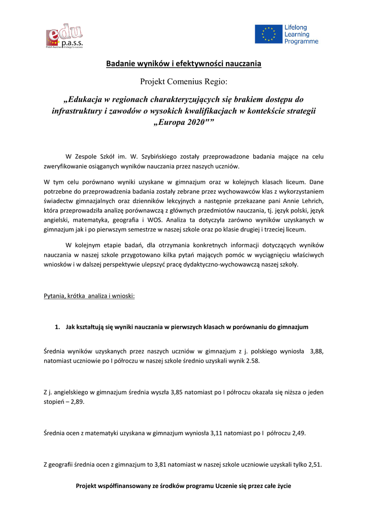 Badanie wyników i efektywności nauczania Projekt Comenius Regio: „Edukacja w regionach charakteryzujących się brakiem dostępu do infrastruktury i zawodów o wysokich kwalifikacjach w kontekście strategii „Europa 2020"” W Zespole Szkół im. W. Szybińskiego zostały przeprowadzone badania mające na celu zweryfikowanie osiąganych wyników nauczania przez naszych uczniów. W tym celu porównano wyniki uzyskane w gimnazjum oraz w kolejnych klasach liceum. Dane potrzebne do przeprowadzenia badania zostały zebrane przez wychowawców klas z wykorzystaniem świadectw gimnazjalnych oraz dzienników lekcyjnych a następnie przekazane pani Annie Lehrich, która przeprowadziła analizę porównawczą z głównych przedmiotów nauczania, tj. język polski, język angielski, matematyka, geografia i WOS. Analiza ta dotyczyła zarówno wyników uzyskanych w gimnazjum jak i po pierwszym semestrze w naszej szkole oraz po klasie drugiej i trzeciej liceum. W kolejnym etapie badań, dla otrzymania konkretnych informacji dotyczących wyników nauczania w naszej szkole przygotowano kilka pytań mających pomóc w wyciągnięciu właściwych wniosków i w dalszej perspektywie ulepszyć pracę dydaktyczno-wychowawczą naszej szkoły. Pytania, krótka analiza i wnioski: 1. Jak kształtują się wyniki nauczania w pierwszych klasach w porównaniu do gimnazjum Średnia wyników uzyskanych przez naszych uczniów w gimnazjum z j. polskiego wyniosła 3,88, natomiast uczniowie po I półroczu w naszej szkole średnio uzyskali wynik 2.58. Z j. angielskiego w gimnazjum średnia wyszła 3,85 natomiast po I półroczu okazała się niższa o jeden stopień – 2,89. Średnia ocen z matematyki uzyskana w gimnazjum wyniosła 3,11 natomiast po I półroczu 2,49. Z geografii średnia ocen z gimnazjum to 3,81 natomiast w naszej szkole uczniowie uzyskali tylko 2,51. Projekt współfinansowany ze środków programu Uczenie się przez całe życie Jeśli chodzi o WOS, średnia ocen uzyskanych w gimnazjum to 4,3 natomiast po I półroczu tylko 2,66. Podsumowanie: Średnia ocen uczniów po I półroczu w naszej szkole bardzo wyraźnie zmalała w stosunku do wyników końcowych z gimnazjum. Uczniowie twierdzą, że z przedmiotów takich jak WOS czy geografia w gimnazjum uzyskiwali dobre i bardzo dobre oceny ponieważ oceniani byli za referaty i prace przygotowane wcześniej w domu. W szkole ponadgimnazjalnej oceniani są za wiedzę wyuczoną (w formie sprawdzianów ustnych i pisemnych), co może tłumaczyć duży spadek ocen. 2. Jak kształtują się wyniki nauczania w kolejnych klasach liceum, czy mają tendencję wzrostową czy spadkową Średnia ocen w kolejnych klasach z poszczególnych przedmiotów: kl.1 j.polski 2,43 kl.2 2,51 kl.3 2,68 j.angielski 2,84 2,9 2,96 matematyka 2,69 2,55 2,43 geografia 2,99 3,40 - Analizując średnią ocen w poszczególnych klasach można zauważyć niewielki wzrost wyników w kolejnych latach nauki w liceum. Wyjątek stanowi matematyka, gdzie średnia ocen z roku na rok spadała. Prawdopodobnie po początkowym spadku osiąganych wyników uczniowie zaczynają dostosowywać się do stawianych wymagań, przyzwyczajają się do zasad panujących w naszej szkole. Być może również materiał przerabiany w kolejnych klasach jest dla uczniów bardziej przystępny. 3. Z których przedmiotów uczniowie mają największe problemy i osiągają najsłabsze wyniki a z których przedmiotów uczniowie osiągają najlepsze wyniki Projekt współfinansowany ze środków programu Uczenie się przez całe życie Najniższa średnia ocen została uzyskana z j. polskiego w klasie pierwszej oraz z matematyki w klasie trzeciej co oznacza, że te przedmioty stwarzają uczniom najwięcej problemów. Może to być spowodowane trudniejszym programem nauczania w tych klasach z podanych przedmiotów. Natomiast najwyższa średnia ocen została uzyskana z geografii w klasie drugiej. 4. Porównanie wyników nauczania w gimnazjum uczniów wyróżniających się z ich wynikami po pierwszej klasie Po analizie średniej ocen uzyskanych przez uczniów ze świadectwami „z wyróżnieniem” (tj. ze średnią min. 4,75) , którzy podjęli u nas naukę można zauważyć, że wyniki uzyskane po I semestrze nauki są zdecydowanie słabsze i kształtują się na poziomie średnio 3,65. 5. Jak wypada nasza szkoła po analizie wyników maturalnych na tle wyników powiatowych Wyniki egzaminu maturalnego z roku 2012 zostały przedstawione z uwzględnieniem poszczególnych typów szkół wchodzących w skład Zespołu Szkół im. Wł. Szybińskiego. Zdawalność w liceum ogólnokształcącym wyniosła 96,8%. Egzamin maturalny w liceum profilowanym zdało 89,3%, zaś w technikum 100% uczniów. Średnia zdawalność w Zespole Szkół im. Wł. Szybińskiego wyniosła 91,96%, co jest wynikiem lepszym, niż w roku ubiegłym, tj. 2011 (88,9%). Na tle powiatu liceum ogólnokształcące uplasowało się na czwartej pozycji. Kolejność jest następująca: 1. LO im. A. Osuchowskiego w Cieszynie – zdawalność wyniosła 100% 2. LO im. M. Kopernika w Cieszynie – 99,5% 3. LO im. P. Stalmacha w Wiśle – 98,9% 4. LO im. Wł. Szybińskiego w Cieszynie – 96,8% 5. LO w Skoczowie – 96,7% Projekt współfinansowany ze środków programu Uczenie się przez całe życie Wśród technikum najlepszym w powiecie okazało się Technikum nr 1 im. Wł. Szybińskiego. Zdawalność egzaminu maturalnego wyniosła 100%. Na kolejnych miejscach uplasowały się: 1. Technikum Budowlane w Cieszynie: 97,3% 2. Technikum w Zespole Szkół Gastronomiczno – Hotelarskich w Wiśle: 89,6% 3. Technikum w Zespole Szkół Ekonomiczno – Gastronomicznych w Cieszynie: 89,4% 4. Technikum w Zespole Szkół Zawodowych w Skoczowie: 84,6% 5. Zespół Szkół Technicznych w Cieszynie: 79,4% 6. Technikum w Zespole Szkół Ponadgimnazjalnych w Ustroniu: 73,0% 7. Technikum Rolnicze w Międzyświeciu: 71,9% 6. Dlaczego uczniowie osiągają takie a nie inne (lepsze) wyn