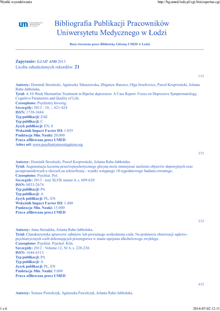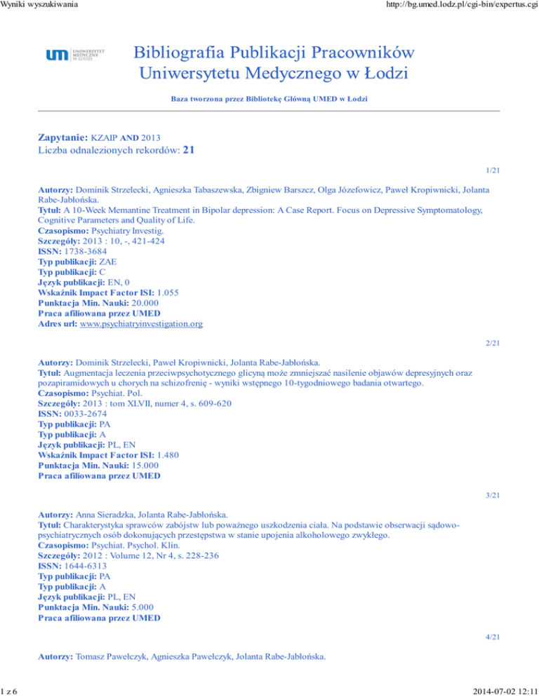 Wyniki wyszukiwania 1z6 http://bg.umed.lodz.pl/cgi-bin/expertus.cgi Baza tworzona przez Bibliotekę Główną UMED w Łodzi Zapytanie: KZAIP AND 2013 Liczba odnalezionych rekordów: 21 1/21 Autorzy: Dominik Strzelecki, Agnieszka Tabaszewska, Zbigniew Barszcz, Olga Józefowicz, Paweł Kropiwnicki, Jolanta Rabe-Jabłońska. Tytuł: A 10-Week Memantine Treatment in Bipolar depression: A Case Report. Focus on Depressive Symptomatology, Cognitive Parameters and Quality of Life. Czasopismo: Psychiatry Investig. Szczegóły: 2013 : 10, -, 421-424 ISSN: 1738-3684 Typ publikacji: ZAE Typ publikacji: C Język publikacji: EN, 0 Wskaźnik Impact Factor ISI: 1.055 Punktacja Min. Nauki: 20.000 Praca afiliowana przez UMED Adres url: www.psychiatryinvestigation.org 2/21 Autorzy: Dominik Strzelecki, Paweł Kropiwnicki, Jolanta Rabe-Jabłońska. Tytuł: Augmentacja leczenia przeciwpsychotycznego glicyną może zmniejszać nasilenie objawów depresyjnych oraz pozapiramidowych u chorych na schizofrenię - wyniki wstępnego 10-tygodniowego badania otwartego. Czasopismo: Psychiat. Pol. Szczegóły: 2013 : tom XLVII, numer 4, s. 609-620 ISSN: 0033-2674 Typ publikacji: PA Typ publikacji: A Język publikacji: PL, EN Wskaźnik Impact Factor ISI: 1.480 Punktacja Min. Nauki: 15.000 Praca afiliowana przez UMED 3/21 Autorzy: Anna Sieradzka, Jolanta Rabe-Jabłońska. Tytuł: Charakterystyka sprawców zabójstw lub poważnego uszkodzenia ciała. Na podstawie obserwacji sądowopsychiatrycznych osób dokonujących przestępstwa w stanie upojenia alkoholowego zwykłego. Czasopismo: Psychiat. Psychol. Klin. Szczegóły: 2012 : Volume 12, Nr 4, s. 228-236 ISSN: 1644-6313 Typ publikacji: PA Typ publikacji: A Język publikacji: PL, EN Punktacja Min. Nauki: 5.000 Praca afiliowana przez UMED 4/21 Autorzy: Tomasz Pawełczyk, Agnieszka Pawełczyk, Jolanta Rabe-Jabłońska. 2014-07-02 12:11 Wyniki wyszukiwania 2z6 http://bg.umed.lodz.pl/cgi-bin/expertus.cgi Tytuł: Ciężka hypertriglicerydemia związana z leczeniem olanzapiną ustąpiła po zmianie terapii na aripiprazol: opis przypadku. Czasopismo: Current Problems of Psychiatry Szczegóły: 2013 : Volume 14, Number 2, Uwagi: XLIV Zjazd Psychiatrów Polskich \"Między neurobiologią a środowiskiem\", Lublin, 27-29 czerwca 2013 ISSN: 2081-3910 Typ publikacji: PSZ Język publikacji: PL, 0 Praca afiliowana przez UMED 5/21 Autorzy: Tomasz Pawełczyk, Agnieszka Pawełczyk, Magdalena Kotlicka-Antczak, Jolanta Rabe-Jabłońska. Tytuł: Czy i jak leczyć ryzykowny stan psychiczny? Czasopismo: Current Problems of Psychiatry Szczegóły: 2013 : Volume 14, Number 2, Uwagi: XLIV Zjazd Psychiatrów Polskich \"Między neurobiologią a środowiskiem\", Lublin, 27-29 czerwca 2013 ISSN: 2081-3910 Typ publikacji: PSZ Język publikacji: PL, 0 Praca afiliowana przez UMED 6/21 Autorzy: Jolanta Rabe-Jabłońska, Agnieszka Pawełczyk. Tytuł: Czy słuchowe słowne halucynacje mają zawsze znaczenie kliniczne? Czasopismo: Psychiat. Psychol. Klin. Szczegóły: 2013 : Volume 13, nr 2, s. 76-82 ISSN: 1644-6313 Typ publikacji: PA Typ publikacji: B Język publikacji: PL, EN Punktacja Min. Nauki: 5.000 Praca afiliowana przez UMED 7/21 Autorzy: Magdalena Kotlicka-Antczak, Jolanta Rabe-Jabłońska, Agnieszka Pawełczyk, Tomasz Pawełczyk. Tytuł: Czy warto diagnozować ryzykowny stan psychiczny? Konsekwencje tego stanu. Czasopismo: Current Problems of Psychiatry Szczegóły: 2013 : Volume 14, Number 2, Uwagi: XLIV Zjazd Psychiatrów Polskich \"Między neurobiologią a środowiskiem\", Lublin, 27-29 czerwca 2013 ISSN: 2081-3910 Typ publikacji: PSZ Język publikacji: PL, 0 8/21 Autorzy: Agnieszka Pawełczyk, Magdalena Kotlicka-Antczak, Tomasz Pawełczyk, Jolanta Rabe-Jabłońska. Tytuł: Deficyty poznawcze w ryzykownym stanie psychicznym-znaczenie diagnostyczne Czasopismo: Current Problems of Psychiatry Szczegóły: 2013 : Volume 14, Number 2, Uwagi: XLIV Zjazd Psychiatrów Polskich \"Między neurobiologią a środowiskiem\", Lublin, 27-29 czerwca 2013 ISSN: 2081-3910 Typ publikacji: PSZ Język publikacji: PL, 0 Praca afiliowana przez UMED 9/21 Autorzy: Małgorzata Urban-Kowalczyk, Tomasz Rudecki, Dariusz Wróblewski, Janusz Śmigielski, Olga Kałużyńska, Jolanta Rabe-Jabłońska. 2014-07-02 12:11 Wyniki wyszukiwania 3z6 http://bg.umed.lodz.pl/cgi-bin/expertus.cgi Tytuł: Electroconvulsive therapy in patient with psychotic depression and multiple sclerosis. Czasopismo: Neurocase Szczegóły: 2013 : -, -, s. 1-4 ISSN: 1355-4794 Typ publikacji: ZA Typ publikacji: A Język publikacji: EN, 0 Wskaźnik Impact Factor ISI: 1.050 Punktacja Min. Nauki: 15.000 Praca afiliowana przez UMED Adres url: http://dx.doi.org/10.1080/13554794.2013.791865 10/21 Autorzy: Agnieszka Pawełczyk, Magdalena Kotlicka-Antczak, Jolanta Rabe-Jabłońska, Tomasz Pawełczyk, Anna Ruszpel, Emilia Łojek. Tytuł: Figural fluency and immediate visual memory in patients with at-risk mental state for psychosis: empirical study Czasopismo: Early Interv. Psychiatry Szczegóły: 2013 : -, -, s. 1-7 ISSN: 1751-7885 Typ publikacji: ZA Typ publikacji: A Język publikacji: EN, 0 Wskaźnik Impact Factor ISI: 1.653 Punktacja Min. Nauki: 25.000 Praca afiliowana przez UMED Adres url: DOI: 10.1111/eip.12116 11/21 Autorzy: Anna Frątczak, Katarzyna Kula, Jolanta Rabe-Jabłońska, Dominik Strzelecki. Tytuł: Modulowanie funkcji układu cholinergicznego w leczeniu schizofrenii - dziś i jutro. Czasopismo: Psychiat. Psychol. Klin. Szczegóły: 2013 : Volume 13, nr 2, s. 108-115 ISSN: 1644-6313 Typ publikacji: PA Typ publikacji: B Język publikacji: PL, 0 Punktacja Min. Nauki: 5.000 Praca afiliowana przez UMED 12/21 Autorzy: Aleksandra Margulska, Aleksandra Kobusiewicz, Agnieszka Pawełczyk, Tomasz Pawełczyk, Jolanta Rabe-Jabłońska. Tytuł: Obraz idealnego lekarza psychiatry w oczach studentów medycyny, pacjentów i lekarzy sprawujących opiekę psychiatryczną. Czasopismo: Psychiat. Psychol. Klin. Szczegóły: 2013 : Volume 13, nr 1, s. 25-32 ISSN: 1644-6313