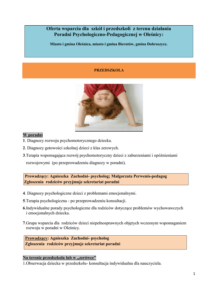 Oferta wsparcia dla szkół i przedszkoli z terenu działania Poradni Psychologiczno-Pedagogicznej w Oleśnicy: Miasto i gmina Oleśnica, miasto i gmina Bierutów, gmina Dobroszyce. PRZEDSZKOLA W poradni 1. Diagnozy rozwoju psychomotorycznego dziecka. 2. Diagnozy gotowości szkolnej dzieci z klas zerowych. 3.Terapia wspomagająca rozwój psychomotoryczny dzieci z zaburzeniami i opóźnieniami rozwojowymi (po przeprowadzeniu diagnozy w poradni). Prowadzący: Agnieszka Zachodni- psycholog; Małgorzata Perwenis-pedagog Zgłoszenia rodziców przyjmuje sekretariat poradni 4. Diagnozy psychologiczne dzieci z problemami emocjonalnymi. 5.Terapia psychologiczna - po przeprowadzeniu konsultacji. 6.Indywidualne porady psychologiczne dla rodziców dotyczące problemów wychowawczych i emocjonalnych dziecka. 7.Grupa wsparcia dla rodziców dzieci niepełnosprawnych objętych wczesnym wspomaganiem rozwoju w poradni w Oleśnicy. Prowadzący: Agnieszka Zachodni- psycholog Zgłoszenia rodziców przyjmuje sekretariat poradni Na terenie przedszkola lub w „zerówce” 1.Obserwacja dziecka w przedszkolu- konsultacja indywidualna dla nauczyciela. 1 2.Prelekcja lub warsztaty dla rodziców dotyczące wspomagania rozwoju dziecka, problemów wychowawczych specyficznych dla wieku przedszkolnego, gotowości szkolnej itp. Proponowana tematyka: Niegrzeczny przedszkolak-jak wzmacniać pozytywne zachowania dziecka Zabawy stymulujące rozwój małego dziecka Ocena gotowości szkolnej dziecka Jak zapobiegać agresji u dzieci w wieku przedszkolnym Prowadzący: Agnieszka Zachodni- psycholog; Małgorzata Perwenis-pedagog Zgłoszenia w trakcie dyżuru pracowników lub na adres e-mail poradni (podając w tytule wiadomości nazwisko adresata.) 3.Badania przesiewowe w zerówkach dotyczące rozwoju mowy. Prowadzący: Elżbieta Iwan-logopeda Kontakt w godzinach dyżuru oraz telefonicznie, a także na adres e-mail poradni (podając w temacie wiadomości nazwisko adresata) SZKOŁY PODSTAWOWE Wsparcie dla szkół w rozwiązywaniu problemów wychowawczych oraz w profilaktyce zaburzeń emocjonalnych i zaburzeń zachowania u dzieci. 2 W poradni 1. Diagnozy przyczyn problemów emocjonalnych i trudności wychowawczych u dziecka, wydawanie pisemnych opinii ( na wniosek rodzica). Prowadzący: Agnieszka Cwynar, Ewa Brocka- psycholodzy „Kartę zgłoszenia na badania” składają rodzice w sekretariacie poradni 2. Indywidualne porady psychologiczne dla rodziców. 3.Mediacje dla rodziców (po konsultacji u pani Agnieszki Cwynar) 4.Terapia psychologiczna dla dzieci z problemami emocjonalnymi, w tym terapia rodzinnej (wymagana jest wcześniejsza konsultacja u psychologa) Prowadzący: Agnieszka Cwynar, Ewa Brocka- psycholodzy. Zgłoszenia w sekretariacie poradni telefonicznie lub osobiście 5.Cykliczne spotkania dla pedagogów szkolnych (grupa wsparcia). 6.Wsparcie dla pedagogów szkolnych i wychowawców w sytuacji kryzysowej (interwencja kryzysowa, mediacja). Prowadzący: Agnieszka Cwynar-psycholog Kontakt w godzinach dyżuru, lub telefonicznie Na terenie szkoły 1.Udział w radzie pedagogicznej poświęconej problematyce wychowawczej. 2.Konsultacja grupowa dla nauczycieli dotycząca problemów występujących w określonej klasie. 3.Prowadzenie obserwacji zachowania dziecka w szkole i konsultacja dla nauczyciela 4.Prowadzenie obserwacji lekcji-pod kątem problemów z dyscypliną. 5.Przeprowadzenie zajęć psychoedukacyjnych dla uczniów danej klasy (we współpracy z wychowawcą lub pedagogiem szkolnym) Proponowana tematyka: Rozpoznawanie emocji i wyrażanie ich w konstruktywny sposób. Jak radzić sobie w sytuacjach konfliktowych. 3 Współpraca zamiast rywalizacji. Zgrana klasa. 6.Przeprowadzenie warsztatów psychoedukacyjnych oraz prelekcji dla rodziców dotyczących wychowania dziecka (we współpracy z pedagogiem szkolnym lub wychowawcą). Proponowana tematyka: Komunikacja dziecko- rodzic. Jak rozwijać u dziecka wiarę w siebie i zaradność. Wspieranie emocjonalne dzieci w sytuacjach trudnych i stresowych. Profilaktyka agresji-jak radzić sobie ze złością i agresją u dziecka. Kary i nagrody w wychowaniu. Jak wspierać dziecko rozpoczynjące naukę w klasie I . Prowadzący: Ewa Brocka (klasy I-III), Agnieszka Cwynar (klasy IV-VI). Kontakt w godzinach dyżuru lub na adres e-mail poradni (podając w temacie wiadomości nazwisko adresata) Wsparcie dla szkół w zakresie rozpoznawania w klasach I-III uczniów z trudnościami w uczeniu się, z ryzyka specyficznych trudności w uczniu się oraz udzielania im pomocy psychologiczno-pedagogicznej. 4 W poradni 1.Diagnozy możliwości psychofizycznych i potrzeb rozwojowych i edukacyjnych dzieci z trudnościami w nauce oraz pod kątem oceny ryzyka specyficznych trudności w uczeniu się na I etapie edukacyjnym, wydawanie pisemnych opinii ( na wniosek rodzica). Prowadzący : Kamila Stemplewska –pedagog, Ewa Brocka -psycholog Zgłoszenia w sekretariacie poradni („Karta zgłoszenia na badania”). 2.Terapia pedagogiczna dla dzieci z ryzyka specyficznych trudności w uczeniu się (wyłącznie po badaniach przeprowadzonych w poradni). Prowadzący :Kamila Stemplewska Zgłoszenie: „Wniosek o objecie terapią” złożony w sekretariacie. 3.Indywidualne porady pedagoga dla rodziców dotyczące wspierania dziecka w nauce. 4. Indywidualne porady pedagoga dla nauczycieli badanych w poradni dzieci: omówienie badań oraz form pomocy dziecku w szkole. Prowadzący :Kamila Stemplewska Kontakt: w godzinach dyżuru lub po telefonicznym umówieniu się 5.Seminarium lub warsztaty dla nauczycieli i specjalistów terapii pedagogicznej dotyczące metodyki pracy korekcyjno-kompensacyjnej oraz metodyki nauki czytania i pisania oraz liczenia dzieci z ryzyka specyficznych trudności w uczeniu się. Prowadzący : Kamila Stemplewska –pedagog po ustaleniu terminu przez prowadzącego zostanie wysłane zaproszenie do szkół). Na terenie szkoły 1. Seminarium dla nauczycieli dotyczącego rozpoznawania objawów ryzy
