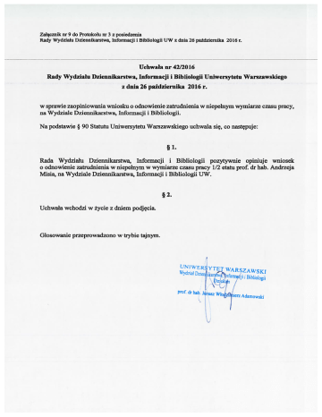 Zalcznik nr 9 do Protokolu nr 3 z posiedzenia Rady Wydzialu Dziennikarstwa, Informacji i Bibliologii UW z dnia 26 pa±dziemika 2016 r. Uchwala nr 42/2016 Rady Wydzialu Dziennikarstwa, Informacji i Bibliologii Uniwersytetu Warszawskiego z dnia 26 padziernika 2016 r. w sprawie zaopiniowania wniosku o odnowienie zatrudnienia w niepehiym wymiarze czasu pracy, na Wydziale Dziennikarstwa, Informacji i Bibliologii. Na podstawie § 90 Statutu Uniwersytetu Warszawskiego uchwala sic, co nastçpuje: § 1. Rada Wydziahi Dziennikarstwa, Informacji i Bibliologii pozytywnie opiniuje wniosek o odnowienie zatrudnienia w niepelnym w wymiarze czasu pracy 1/2 etatu prof. dr hab. Anclrzeja Misia, na Wydziale Dziennikarstwa, Informacji i Bibliologii UW. §2. Uchwala wchodzi w zycie z dniem podjçcia. Glosowanie przeprowadzono w trybie tajnym. prof dr hab. Janusz W ierz Adarnowj