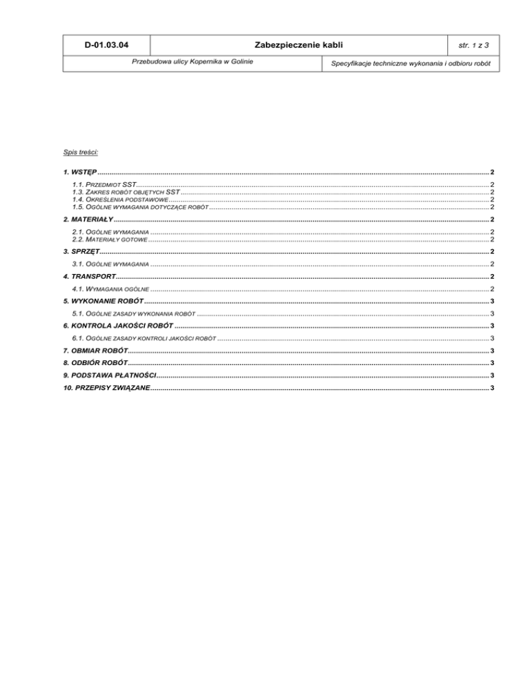 D-01.03.04 Zabezpieczenie kabli Przebudowa ulicy Kopernika w Golinie str. 1 z 3 Specyfikacje techniczne wykonania i odbioru robót Spis treści: 1. WSTĘP ................................................................................................................................................................................................. 2 1.1. PRZEDMIOT SST.............................................................................................................................................................................. 2 1.3. ZAKRES ROBÓT OBJĘTYCH SST ........................................................................................................................................................ 2 1.4. OKREŚLENIA PODSTAWOWE.............................................................................................................................................................. 2 1.5. OGÓLNE WYMAGANIA DOTYCZĄCE ROBÓT .......................................................................................................................................... 2 2. MATERIAŁY ......................................................................................................................................................................................... 2 2.1. OGÓLNE WYMAGANIA ....................................................................................................................................................................... 2 2.2. MATERIAŁY GOTOWE ........................................................................................................................................................................ 2 3. SPRZĘT ................................................................................................................................................................................................ 2 3.1. OGÓLNE WYMAGANIA ....................................................................................................................................................................... 2 4. TRANSPORT ........................................................................................................................................................................................ 2 4.1. WYMAGANIA OGÓLNE ....................................................................................................................................................................... 2 5. WYKONANIE ROBÓT .......................................................................................................................................................................... 3 5.1. OGÓLNE ZASADY WYKONANIA ROBÓT ................................................................................................................................................ 3 6. KONTROLA JAKOŚCI ROBÓT ........................................................................................................................................................... 3 6.1. OGÓLNE ZASADY KONTROLI JAKOŚCI ROBÓT ...................................................................................................................................... 3 7. OBMIAR ROBÓT .................................................................................................................................................................................. 3 8. ODBIÓR ROBÓT .................................................................................................................................................................................. 3 9. PODSTAWA PŁATNOŚCI .................................................................................................................................................................... 3 10. PRZEPISY ZWIĄZANE ....................................................................................................................................................................... 3 D-01.03.04 Zabezpieczenie kabli Przebudowa ulicy Kopernika w Golinie str. 2 z 3 Specyfikacje techniczne wykonania i odbioru robót 1. WSTĘP 1.1. Przedmiot SST Przedmiotem niniejszej szczegółowej specyfikacji technicznej (SST) są wymagania dotyczące wykonania i odbioru zabezpieczenia kablowych linii telekomunikacyjnych i energetycznych podczas przebudowy ulicy Kopernika w Golinie. 1.2. Zakres stosowania SST Szczegółowa specyfikacja techniczna (SST) jest stosowana jako dokument kontraktowy i przetargowy przy zlecaniu i realizacji robót wymienionych w punkcie 1.1. 1.3. Zakres robót objętych SST Roboty omówione w SST mają zastosowanie do zabezpieczenia linii telekomunikacyjnych oraz energetycznych przy budowie dróg. 1.4. Określenia podstawowe 1.4.1. Kanalizacja kablowa - zespół ciągów podziemnych z wbudowanymi studniami przeznaczony do prowadzenia kabli telekomunikacyjnych. 1.4.2. Kanalizacja magistralna - kanalizacja kablowa wielootworowa przeznaczona do kabli linii magistralnych, międzycentralowych, międzymiastowych okręgowych i pośrednich. 1.4.3. Kanalizacja rozdzielcza - kanalizacja kablowa jedno- lub dwutorowa przeznaczona do kabli linii rozdzielczych. 1.4.4. Blok kanalizacji kablowej - blok betonowy z jednym lub wieloma otworami stosowany do zestawienia ciągów kanalizacji kablowej. 1.4.5. Ciąg kanalizacji - bloki kanalizacji kablowej lub rury ułoŜone w wykopie jeden za drugim i połączone pojedynczo lub w zestawach pozwalających uzyskać potrzebną liczbę otworów kanalizacji. 1.4.6. Studnia kablowa - pomieszczenia podziemne wbudowane między ciągi kanalizacji kablowej w celu umoŜliwienia wciągania, montaŜu i konserwacji kabli. 1.4.7. Kablowa sieć miejscowa - sieć łączy telefonicznych z urządzeniami liniowymi, łącząca centrale telefoniczne między sobą oraz centrale telefoniczne ze stacjami abonenckimi. 1.4.8. Sieć międzycentralowa - część linii miejscowej obejmująca linie łączące centrale telefoniczne