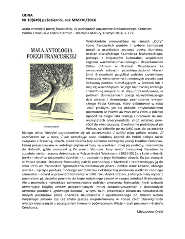 ODRA Nr 10(649) październik, rok MMXVI/2016 Mała antologia poezji francuskiej. W przekładzie Kazimierza Brakonieckiego. Centrum Polsko-Francuskie Côtes d’Armor – Warmia i Mazury, Olsztyn 2016, s. 172. Wielokrotnie omawialiśmy na łamach „Odry” tomy francuskich poetów i wybory tamtejszej poezji w przekładzie znanego poety, tłumacza, eseisty olsztyńskiego Kazimierza Brakonieckiego, jednego z inicjatorów kulturalnej współpracy regionu warmińsko-mazurskiego i departamentu Côtes d’Armor w Bretanii. Współpraca ta owocowała udanymi przedsięwzięciami literackimi. Brakoniecki przybliżył polskim czytelnikom twórczość wielu świetnych, cenionych wysoko nad Sekwaną poetów mieszkających w Bretanii lub z niej się wywodzących. W jego najnowszej antologii znalazło się miejsce m. in. dla już prezentowanej w polskich tłumaczeniach poezji najwybitniejszego dziś pisarza i dramaturga pochodzenia bretońskiego Paola Keinega, który debiutował w roku 1967 głośnym, jak się mówiło antykolonialnym poematem Le Poème du Pays qui a Faim, a później opuścił na długie lata Francję i pracował na uniwersytetach amerykańskich, choć ostatnio powrócił do swej ojczyzny. Dwukrotnie podróżował po Polsce, co skłoniło go na jakiś czas do zarzucenia białego wina: Niegdyś ograniczałem się do sprzeczności, / dzisiaj pijąc polską wódkę, // rozpływam się w nocy, / nie zamykając oczu. Podobną podróż do Polski odbyła także związana z Bretanią, zmarła przed trzema laty seniorka tamtejszej poezji Heather Dohollau, której prezentowane w antologii piękne ekfrazy są wynikiem innej jej podróży, mianowicie do Holandii, gdzie zauroczył ją Po prostu Vermeer. Inny senior francuskiej literatury to zupełnie nietłumaczony dotychczas w Polsce André Weckmann (1924-2012), z kolei miłośnik języka i obrońca tożsamości alzackiej – tu poznajemy jego Kalendarz alzacki. Do już znanych w Polsce postaci literatury francuskiej należy pochodzący z Martyniki i reprezentujący ją do roku 1993 we francuskim Zgromadzeniu Narodowym pisarz i polityk Aimé Césaire, którego wiersze – łączące poetykę modnego nadrealizmu z ekstatyczną pochwałą wielkości czarnego człowieka – odkrył w przywiózł do Francji w 1941 roku André Breton, a których mały wybór z poematem pt. Kronika powrotu do kraju rodzinnego zawarł w swojej antologii Brakoniecki. Ale z pewnością największe zainteresowanie polskich amatorów francuskiej liryki wzbudzi otwierający książkę zestaw przypomnianych, mniej spopularyzowanych a doskonałych utworów poetów z „głównego kanonu”, w tym. m.in. prezentacja kilkunastu nowatorskich małych poematów prozą Charles’a Beudelaire’a z opublikowanego po śmierci autora Paryskiego spleenu czy też chyba jeszcze niepublikowany w Polsce zbiór Dziewiętnastu wierszy elastycznych z patetycznym hymnem poświęconym Wieży – czyli penisowi – Blaise’a Cendrarsa. Mieczysław Orski