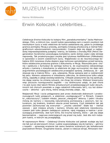 MUZEUM HISTORII FOTOGRAFII Hanna Wróblewska Erwin Koloczek i celebrities… Celebracja Erwina Koloczka to kolejny film „paradokumentalny” Jacka Malinowskiego. Film, w którym tzw. zwykli ludzie opowiadają nam o swoim zwykłym lub niezwykłym życiu a widz właściwie do końca zastanawia się, gdzie tu przebiega granica pomiędzy fikcją a prawdą, pomiędzy kreacją artystyczną a niemal fotograficznym odwzorowaniem rzeczywistości. Czasem daje się złapać w najbardziej nieprawdopodobną pułapkę i wierzy, że kobieta z chorobą PDS (Pelvic Degeneration Syndrome) powodującą kompletny zanik dolnej części ciała istnieje naprawdę. Tak przekonywująco zwykła jest tytułowa HalfAWoman (Półkobieta) w opowieści o swoim codziennym życiu. Wątpliwości co do neurotycznego bohatera SSS rozwiewa chyba dopiero jego końcowe samobójstwo przed kamerą, które ostatecznie przesuwa granice z dokumentu w fikcję. Niezwykła para: chorej i opiekuna z Symulacji do samego końca tj. do wyproszenia ciekawskiego artysty z kamerą z mieszkania (a właściwie do jego wyrzucenia) nie daje nam argumentów pozwalających ostatecznie przesądzić sprawę. Zwłaszcza, że – jak okazuje się w trakcie filmu – gra, udawanie, fikcja wpisana jest w codzienność tej pary. Kamera ustawiona w mieszkaniu odkrywa, że dziewczyna tylko udaje chorą, zapadłą w jakąś swoistą katatonię. Chłopak posesywnie się nią opiekuje, nie dając szansy na zmianę sytuacji, nie chcąc tej zmiany. Widzowi towarzyszy więc poczucie rozwiązywania zagadki – czy dziewczyna udaje, że jest chora i to jest życie (ileż takich filmów artystycznych przedstawiających ludzi obcych, innych lub chorych powstało w ciągu ostatnich kilkunastu lat!), czy też dziewczyna – aktorka – gra chorą, która swoją chorobę udaje… itp. Niejasność fikcji i życia potęgowana jest przez doskonale dobranych i przekonywujących ludzi grających, a właściwie „występujących” w filmach. Czasem to „naturszczycy”, czasem młodzi, jeszcze „nieograni” aktorzy. I jedni i drudzy mówią do kamery z niezwykłą naturalnością pomieszaną z pewnym, też naturalnym, jej brakiem, brakiem obycia przed kamerą. Czyli dokładnie tak jak powinien zachowywać się everyman – „zwykły człowiek”. Stałe też – niemal zawsze – jest miejsce artysty i kamery. Artysta jest właściwie niewidoczny, czasem jest tylko głosem zadającym pytania, ręką migającą w kadrze i przesuwającą przedmioty. Jest tym kimś, kto trzyma kamerę, która – jak się zdaje beznamiętnie – nagrywa zwierzających się przed nią ludzi. Jest dla nich rodzajem lustra, w którym się przeglądają. W najnowszym filmie – Celebracji Erwina Koloczka coś jednak wydaje się być nie tak już od pierwszych minut. Ludzie wypowiadający się do kamery – górnicy z kopalni – sprawiają wrażenie tak samo świetnie wybranych jak bohaterowie poprzednich filmów. Oryginalne twarze, ubrani w robocze stroje, filmowani rów- nież razem przy wspólnej pracy. Wypowiadają teksty, które pasują do tego co robią. Zdania, które mają opisywać ich pracę, życie, marzenia. Dlaczego więc te zdania nie brzmią tak naturalnie jak kwestie półkobiety czy chłopaka z SSS ? Czy dlatego, że i Erwin Koloczek i jego koledzy podają je do kamery ze zbyt wielką brawurą, w nieco sztuczny sposób? Czyżby zawiodło tu wyczucie artysty? A może to kwestia samego tekstu pasującego i jednocześnie nie pasującego do wypowiadających go osób? Czyżby artysta – demiurg, jak zwykle stojący za kamerą, postanowił też jednak uwidocznić się jako twórca dialogów i stąd ich sztuczność??? Minuty mijają i rośnie pewność, ze uczestniczymy w jakiejś grze, w której musimy rozpoznać swoje miejsce i rozpoznać „przeciwnika”. I dopiero ostanie minuty dają nam – nieraz przeczute już wcześniej – rozwiązanie tej zagadki. Celebracja Erwina Koloczka to również swoisty dokument o celebrities...! Kimkolwiek oni by nie byli… Jacek Malinowski (ur.1964) pracuje w różnych mediach: wideo, rzeźba, fotografia, instalacja, w ostatnim czasie najbardziej koncentruje się na filmie o charakterze fikcyjnego dokumentu. Ukończył: Wydział Rzeźby ASP w Warszawie (1992), International Summer Academy of Fine Arts w Salzburgu, Austria (1993), Mason Gross School of the Arts, Uniwersytet Rutgers, USA (1999). Wybrane wystawy: HalfAWoman, Mały Salon, Galeria Zachęta, Warszawa (2001); Praguebiennale 2, Praga, Czechy (2004); WRO – 11th. Multimedia Biennale, Wrocław (2004), HalfAWoman, Instituto Polacca di Rome, Włochy (2005), POZA, Real Art Ways Hartford, USA (2006), Edvard-Munch-Haus, Warnemunde, Niemcy (2006). 2