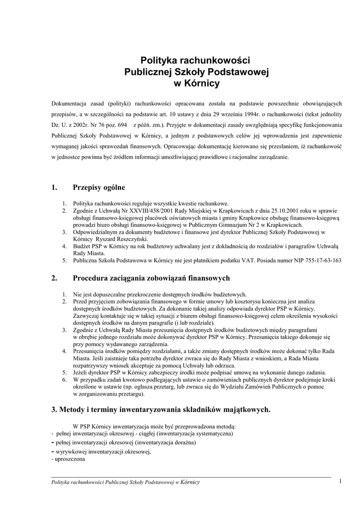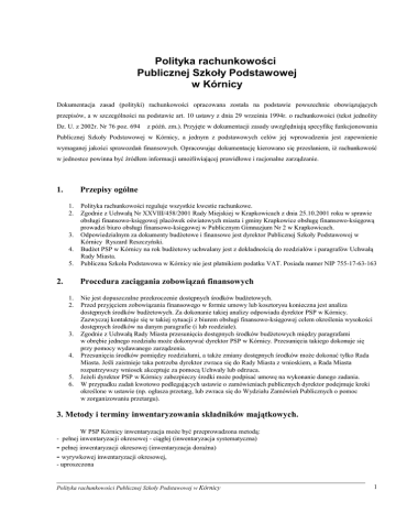 Polityka rachunkowości Publicznej Szkoły Podstawowej w Kórnicy Dokumentacja zasad (polityki) rachunkowości opracowana została na podstawie powszechnie obowiązujących przepisów, a w szczególności na podstawie art. 10 ustawy z dnia 29 września 1994r. o rachunkowości (tekst jednolity Dz. U. z 2002r. Nr 76 poz. 694 z późń. zm.). Przyjęte w dokumentacji zasady uwzględniają specyfikę funkcjonowania Publicznej Szkoły Podstawowej w Kórnicy, a jednym z podstawowych celów jej wprowadzenia jest zapewnienie wymaganej jakości sprawozdań finansowych. Opracowując dokumentację kierowano się przesłaniem, iż rachunkowość w jednostce powinna być źródłem informacji umożliwiającej prawidłowe i racjonalne zarządzanie. 1. Przepisy ogólne 1. 2. 3. 4. 5. 2. Polityka rachunkowości reguluje wszystkie kwestie rachunkowe. Zgodnie z Uchwałą Nr XXVIII/458/2001 Rady Miejskiej w Krapkowicach z dnia 25.10.2001 roku w sprawie obsługi finansowo-księgowej placówek oświatowych miasta i gminy Krapkowice obsługę finansowo-księgową prowadzi biuro obsługi finansowo-księgowej w Publicznym Gimnazjum Nr 2 w Krapkowicach. Odpowiedzialnym za dokumenty budżetowe i finansowe jest dyrektor Publicznej Szkoły Podstawowej w Kórnicy Ryszard Reszczyński. Budżet PSP w Kórnicy na rok budżetowy uchwalany jest z dokładnością do rozdziałów i paragrafów Uchwałą Rady Miasta. Publiczna Szkoła Podstawowa w Kórnicy nie jest płatnikiem podatku VAT. Posiada numer NIP 755-17-63-163 Procedura zaciągania zobowiązań finansowych 1. 2. 3. 4. 5. 6. Nie jest dopuszczalne przekroczenie dostępnych środków budżetowych. Przed przyjęciem zobowiązania finansowego w formie umowy lub kosztorysu konieczna jest analiza dostępnych środków budżetowych. Za dokonanie takiej analizy odpowiada dyrektor PSP w Kórnicy. Zazwyczaj kontaktuje się w takiej sytuacji z biurem obsługi finansowo-księgowej celem określenia wysokości dostępnych środków na danym paragrafie (i lub rozdziale). Zgodnie z Uchwałą Rady Miasta przesunięcia dostępnych środków budżetowych między paragrafami w obrębie jednego rozdziału może dokonywać dyrektor PSP w Kórnicy. Przesunięcia takiego dokonuje się przy pomocy wydawanego zarządzenia. Przesunięcia środków pomiędzy rozdziałami, a także zmiany dostępnych środków może dokonać tylko Rada Miasta. Jeśli zaistnieje taka potrzeba dyrektor zwraca się do Rady Miasta z wnioskiem, a Rada Miasta rozpatrzywszy wniosek akceptuje za pomocą Uchwały lub odrzuca. Jeżeli dyrektor PSP w Kórnicy zabezpieczy środki może podpisać umowę na wykonanie danego zadania. W przypadku zadań kwotowo podlegających ustawie o zamówieniach publicznych dyrektor podejmuje kroki określone w ustawie (np. ogłasza przetarg, lub zwraca się do Wydziału Zamówień Publicznych o pomoc w zorganizowaniu przetargu). 3. Metody i terminy inwentaryzowania składników majątkowych. W PSP Kórnicy inwentaryzacja może być przeprowadzona metodą: - pełnej inwentaryzacji okresowej - ciągłej (inwentaryzacja systematyczna) - pełnej inwentaryzacji okresowej (inwentaryzacja doraźna) - wyrywkowej inwentaryzacji okresowej, - uproszczona Polityka rachunkowości Publicznej Szkoły Podstawowej w Kórnicy 1 Inwentaryzację poszczególnymi metodami w zależności od rodzajów inwentaryzowanych składników, przeprowadza się w drodze: 1) spisu z natury, 2) potwierdzenia sald z kontrahentami 3) weryfikacji prawidłowości stanu rzeczywistego wynikającego z ewidencji księgowej tych składników, przez porównanie go z odpowiednimi dowodami, Ad 1) Inwentaryzacja w drodze spisu z natury polega na przeprowadzeniu zliczenia i zapisania ilości rzeczywistych składników majątku. Przedmiotem inwentaryzacji tą drogą są: - gotówka w kasie, - środku trwałe w eksploatacji, - wartości niematerialne i prawne - inne rzeczowe składniki majątku Ad 2) Inwentaryzacja w drodze potwierdzenia sald polega na uzyskaniu od kontrahentów pisemnych informacji o stanie środków widniejących w ich księgach rachunkowych. Ad 3) Inwentaryzacja w drodze weryfikacji polega na ustaleniu prawidłowego i realnego stanu ewidencyjnego sald aktywów i pasywów nie podlegających spisowi z natury. 4. Terminy inwentaryzowania składników majątkowych. 1. W procesie inwentaryzacji okresowej (ciągłej) poszczególne składniki majątkowe są inwentaryzowane z następującą częstotliwością: a) środki trwałe według klasyfikacji środków trwałych nie rzadziej niż co 4 lata b) środki trwałe o niskiej wartości nie rzadziej niż co 4 lata c) zbiory biblioteczne co najmniej 5 lat. d) środki pieniężne w kasie, znaczki oraz druki ścisłego zarachowania jeden raz w roku na dzień 31 grudnia. 2. Gotówka w kasie winna być dodatkowo inwentaryzowana: - przy zmianie kasjera, - w sytuacjach losowych 3. Pełną inwentaryzację okresową (doraźną) należy przeprowadzić na dzień zmiany osobie materialnie odpowiedzialnej a także na dzień w którym na skutek wypadków losowych lub innych (kradzież, pożar, itp.) część składników majątkowych została zniszczona, uszkodzona lub przywłaszczona. 4. Księgi inwentarzowe prowadzone są ręcznie, księga główna znajduję się w Publicznym Gimnazjum Nr 2 natomiast księga pomocnicza znajduje się w Publicznej Szkole Podstawowej w Kórnicy. Dokumentacja przyjętych zasad rachunkowości jednostki obejmuje: I. Określenie roku obrotowego i wchodzących w jego skład okresów sprawozdawczych. II. Metody wyceny aktywów i pasywów oraz zasady ustalania wyniku finansowego. III. Sposób prowadzenia ksiąg rachunkowych, w tym: 1. Zakładowy plan kont, 2. Wykaz ksiąg rachunkowych, 3. Opis systemu przetwarzania danych (opis systemu informatycznego) Określenie roku obrotowego i wchodzących w jego skład okresów sprawozdawczych. Rok obrotowy pokrywa się z rokiem budżetowym i trwa od 1 stycznia do 31 grudnia. Polityka rachunkowości Publicznej Szkoły Podstawo