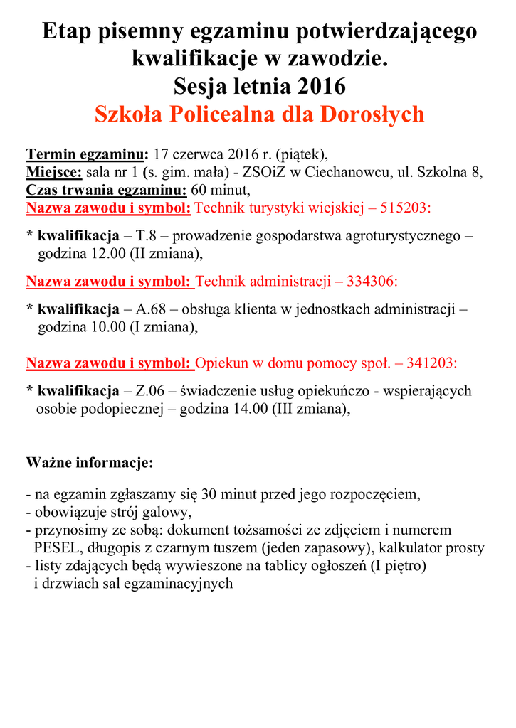 Etap pisemny egzaminu potwierdzającego kwalifikacje w zawodzie. Sesja letnia 2016 Szkoła Policealna dla Dorosłych Termin egzaminu: 17 czerwca 2016 r. (piątek), Miejsce: sala nr 1 (s. gim. mała) - ZSOiZ w Ciechanowcu, ul. Szkolna 8, Czas trwania egzaminu: 60 minut, Nazwa zawodu i symbol: Technik turystyki wiejskiej – 515203: * kwalifikacja – T.8 – prowadzenie gospodarstwa agroturystycznego – godzina 12.00 (II zmiana), Nazwa zawodu i symbol: Technik administracji – 334306: * kwalifikacja – A.68 – obsługa klienta w jednostkach administracji – godzina 10.00 (I zmiana), Nazwa zawodu i symbol: Opiekun w domu pomocy społ. – 341203: * kwalifikacja – Z.06 – świadczenie usług opiekuńczo - wspierających osobie podopiecznej – godzina 14.00 (III zmiana), Ważne informacje: - na egzamin zgłaszamy się 30 minut przed jego rozpoczęciem, - obowiązuje strój galowy, - przynosimy ze sobą: dokument tożsamości ze zdjęciem i numerem PESEL, długopis z czarnym tuszem (jeden zapasowy), kalkulator prosty - listy zdających będą wywieszone na tablicy ogłoszeń (I piętro) i drzwiach sal egzaminacyjnych Etap pisemny egzaminu potwierdzającego kwalifikacje w zawodzie. Sesja letnia 2016 Technikum Termin egzaminu: 17 czerwca 2016 r. (piątek), Miejsce: sala nr 1 (s. gim. mała) - ZSOiZ w Ciechanowcu, ul. Szkolna 8, Czas trwania egzaminu: 60 minut, Nazwa zawodu i symbol: Technik żywienia i usług gastronomicznych – symbol zawodu 343404: * kwalifikacja - T.6 sporządzanie potraw i napojów – godzina 10.00 (I zmiana), Nazwa zawodu i symbol: Technik usług fryzjerskich – symbol zawodu 514105: * kwalifikacja – A.19 wykonywanie zabiegów fryzjerskich – godzina 12.00 (II zmiana), Ważne informacje: - na egzamin zgłaszamy się 30 minut przed jego rozpoczęciem, - obowiązuje strój galowy, - przynosimy ze sobą: dokument tożsamości ze zdjęciem i numerem PESEL, długopis z czarnym tuszem (jeden zapasowy), kalkulator prosty - listy zdających będą wywieszone na tablicy ogłoszeń (I piętro) i drzwiach sal egzaminacyjnych Etap pisemny egzaminu potwierdzającego kwalifikacje w zawodzie. Sesja letnia 2016 Zasadnicza Szkoła Zawodowa Termin egzaminu: 17 czerwca 2016 r. (piątek), Miejsce: sala nr 1 (s. gim. mała) - ZSOiZ w Ciechanowcu, ul. Szkolna 8, Czas trwania egzaminu: 60 minut, Nazwa zawodu i symbol: Kucharz – symbol zawodu 512001 * kwalifikacja - T.6 sporządzanie potraw i napojów – godzina 10.00 (I zmiana), Nazwa zawodu i symbol: Sprzedawca – symbol zawodu 522301 * kwalifikacja - A.18 prowadzenie sprzedaży – godzina 10.00 (I zmiana), Nazwa zawodu i symbol: Rolnik – symbol zawodu 613003 * kwalifikacja - R.3 prowadzenie produkcji rolniczej – godzina 10.00 (I zmiana), Ważne informacje: - na egzamin zgłaszamy się 30 minut przed jego rozpoczęciem, - obowiązuje strój galowy, - przynosimy ze sobą: dokument tożsamości ze zdjęciem i numerem PESEL, długopis z czarnym tuszem (jeden zapasowy), kalkulator prosty - listy zdających będą wywieszone na tablicy ogłoszeń (I piętro) i drzwiach sal egzaminacyjnych Etap pisemny egzaminu potwierdzającego kwalifikacje w zawodzie. Sesja letnia 2016 Kwalifikacyjny kurs zawodowy Termin egzaminu: 17 czerwca 2016 r. (piątek), Miejsce: sala nr 1 (s. gim. mała) - ZSOiZ w Ciechanowcu, ul. Szkolna 8, Czas trwania egzaminu: 60 minut, Nazwa zawodu i symbol: Rolnik – symbol zawodu 613003 * kwalifikacja - R.3 prowadzenie produkcji rolniczej – godzina 10.00 (I zmiana), Nazwa zawodu i symbol: Technik rolnik – symbol zawodu 314207 * kwalifikacja – R.16 organizacja i nadzorowanie produkcji rolniczej – godzina 12.00 (II zmiana), Ważne informacje: - na egzamin zgłaszamy się 30 minut przed jego rozpoczęciem, - obowiązuje strój galowy, - przynosimy ze sobą: dokument tożsamości ze zdjęciem i numerem PESEL, długopis z czarnym tuszem (jeden zapasowy), kalkulator prosty - listy zdających będą wywieszone na tablicy ogłoszeń (I piętro) i drzwiach sal egzaminacyjnych Etap praktyczny egzaminu potwierdzającego kwalifikacje w zawodzie - sesja letnia 2016 Szkoła Policealna dla Dorosłych Termin egzaminu: 23 czerwca 2016 r. (czwartek), Miejsce: sala nr 1 (s. gim. mała) - ZSOiZ w Ciechanowcu, ul. Szkolna 8, Nazwa zawodu i symbol: Technik turystyki wiejskiej – 515203: * kwalifikacja - T.7 - prowadzenie działalności turystycznej na obszarach wiejskich – godzina 9.00 (I zmiana) – czas trwania – 150 minut, * kwalifikacja – T.8 – prowadzenie gospodarstwa agroturystycznego – godzina 13.00 (II zmiana) – czas trwania – 150 minut, Nazwa zawodu i symbol: Technik administracji – 334306: * kwalifikacja – A.68 – obsługa klienta w jednostkach administracji – godzina 9.00 (I zmiana) – czas trwania – 180 minut, Nazwa zawodu i symbol: Opiekun w domu pomocy społ. – 341203: * kwalifikacja – Z.06 – świadczenie usług opiekuńczo o wspierających osobie podopiecznej – czas trwania 120 minut: Miejsce egzaminu sala nr 1 (s. gim mała) ZSOiZ w Ciechanowcu ul. Szkolna 8 Termin egz. 18.06.2016 r. sobota Zmiana I zm. godz. 8.00 II zm. godz. 12.00 III zm. godz. 16.00 Uczniowie zdający 1. Czołomiej Katarzyna 2. Kowalczuk Marcin 3. Krawczuk Agnieszka 4. Łagoda Marek 1. Jóźwiak Robert 2. Kuczabo – Miszczuk Joanna 3. Kulesza Małgorzata 4. Kuźmińska Izabela 1. Stupka Aneta 2. Tonkiel Elwira 3. Wojtkowska Natalia Anna 4. Żero Bogusława Przybory, które zdający może ze sobą zabrać na egz. praktyczny oprócz długopisu z czarnym wkładem i długopisu zapasowego: * kwalifikacja - T.7 – kalkulator prosty, * kwalifikacja - T.8 – kalkulator prosty, * kwalifikacja – A.68 – kalkulator prosty, ołówek, gumka, linijka, temperówka Ważne informacje: - na egzamin zgłaszamy się 30 minut przed jego rozpoczęciem, obowiązuje strój galowy, - przynosimy ze sobą: dokument tożsamości ze zdjęciem i numerem PESEL, - listy zdających będą wywieszone na tablicy ogłoszeń (I piętro)