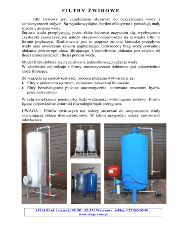 FILTRY ŻWIROWE Filtr żwirowy jest urządzeniem służącym do oczyszczania wody z zanieczyszczeń stałych. Są wysokowydajne, bardzo efektywne i powodują mały spadek ciśnienia wody. Surowa woda przepływając przez złoże żwirowe oczyszcza się, wychwycone cząsteczki zanieczyszczeń należy okresowo odprowadzić na zewnątrz filtru w formie popłuczyn. Realizowane jest to poprzez zmianę kierunku przepływu wody oraz otworzenie zaworu popłucznego. Odwrócony bieg wody powoduje płukanie żwirowego złoża filtrującego. Częstotliwość płukania jest zależna od ilości zanieczyszczeń i ilości poboru wody. Model filtru dobiera się na podstawie jednostkowego zużycia wody. W zależności od rodzaju i formy zanieczyszczeń dobierane jest odpowiednie złoże filtrujące. Ze względu na sposób realizacji procesu płukania wytwarzane są : • filtry z płukaniem ręcznym, sterowane zaworami kulowymi. • filtry bezobsługowe płukane automatycznie, sterowane zaworami hydropneumatycznymi W celu zwiększenia pojemności bądź wydajności wykonujemy zestawy filtrów łącząc odpowiednie zbiorniki równolegle bądź szeregowo. UWAGA : Filtrów żwirowych nie należy stosować do oczyszczania wody zawierającej żelazo dwuwartościowe. W takim przypadku należy zastosować odżelaziacz. OTAGO ul. Jutrzenki 99/101 , 02-231 Warszawa , tel/fax 0.22 863-53-84 , www.otago.com.pl „150” „300” „500” „1000” średnica wejście/wyjście 1” lub 1¼” 1” , 1¼” lub 1½” 1¼” lub 1½” 1½” lub 2” objętość zbiornika filtracyjnego 150 dm3 300 dm3 500 dm3 1000 dm3 objętość złoża filtracyjnego 110 dm3 220 dm3 340 dm3 750 dm3 masa pustego zbiornika 55 kg 80 kg 150 kg 270 kg masa zbiornika ze złożem 275 kg 520 kg 750 kg 1550 kg wymiary zbiornika h1 h2 d L ~ 155 cm ~ 165 cm ~ 45 cm ~ 60 cm ~ 160 cm ~ 170 cm ~ 55 cm ~ 90 cm ~ 190 cm ~ 205 cm ~ 70 cm ~ 110 cm ~ 195 cm ~ 210 cm ~ 90 cm ~ 125 cm ciśnienie robocze 1,8 ÷6 atm. 1,8 ÷ 6 atm. 1,8 ÷ 6 atm. 1,8 ÷ 6 atm. max. przepływ przy pracy ciągłej 6 m3/h 10 m3/h 18 m3/h 27 m3/h Parametry filtrów żwirowych serii MP d L h2 h1 filtr wlot wody surowej wylot wody uzdatnionej popłuczyny filtr Z4 Z1 Z2 Z3 Z5 NORMALNA PRACA FILTRU OTWARTE ZAWORY : Z1 , Z3 ZAMKNIĘTE ZAWORY : Z2 , Z4 , Z5 PŁUKANIE ZŁOŻA FILTRACYJNEGO PŁUKANIE WSTECZNE OTWARTE ZAWORY : Z2 , Z4 ZAMKNIĘTE ZAWORY : Z1 , Z3 , Z5 PŁUKANIE FORMUJĄCE OTWARTE ZAWORY : Z1 , Z5 ZAMKNIĘTE ZAWORY : Z2 , Z3 , Z4 MONTAŻ ZBIORNIKA ZE ZŁOŻEM FILTRACYJNYM Po ustawieniu i zainstalowaniu zbiornika w sieci hydraulicznej należy : - odłączyć orurowanie - odkręcić właz górny z dyszą wlotową - wlać przez górny otwór wodę (ok. 1/3 objętości zbiornika) - wsypać przez górny otwór złoże filtracyjne, rozpoczynając o największej granulacji, a kończąc na najmniejszej - przykręcić właz górny - przyłączyć orurowanie UWAGI : ♦ ♦ ♦ ♦ ♦ zbiornik po zasypaniu można przenosić tylko w pozycji pionowej od momentu zasypania, złoże musi zawsze pozostawać zalane wodą temperatura otoczenia : minimum +4° przewód odprowadzający popłuczyny musi spełniać wymagania : średnica wewnętrzna – min. 32 mm całkowita długość – max. 15 m podczas płukania ciśnienie nie może być niższe od 2,5 atm. NAPEŁNIANIE ZBIORNIKA WODĄ I WSTĘPNE PŁUKANIE ZŁOŻA Zbiornik należy napełniać wodą od dołu, w tym celu należy ustawić zawory w taki sposób, jak podczas płukania złoża. Wodę należy przepuszczać do czasu uzyskania klarowności. Następnie zawory należy przestawić w położenie pracy i odkręcić w dowolnym ujęciu odpływ wody, i zlewać także do uzyskania klarowności. Czynności opisane wyżej (płukanie – praca) należy powtarzać co najmniej trzykrotnie. Przez kilka dni woda może nie uzyskać pełnej czystości. NORMALNA PRACA FILTRU Podczas normalnej pracy urządzenia, woda surowa zawierająca zanieczyszczenia mechaniczne płynie wewnątrz zbiornika z góry do dołu poprzez materiał filtracyjny. Oczyszczona woda wypływa u dołu poprzez zawór wylotowy. Wydajność zależy od maksymalnego dopuszczalnego spadku ciśnienia dla całego układu i maksymalnego dopuszczalnego obciążenia złoża zanieczyszczeniami. OTWARTE ZAWORY : Z1 , Z3 ZAMKNIĘTE ZAWORY : Z2 , Z4 , Z5 PŁUKANIE ZŁOŻA FILTRACYJNEGO Wychwycone na złożu zanieczyszczenia należy okresowo wyrzucić na zewnątrz filtru. Realizowane jest to poprzez zmianę kierunku przepływu wody oraz otwarcie zaworu popłucznego. Podczas płukania wstecznego woda płynie z dołu do góry przez złoże filtracyjne i dzięki temu nie następuje jego zatkanie. Częstotliwość płukania jest zależna od ilości zanieczyszczeń i wielkości poboru wody. OTWARTE ZAWORY : Z2 , Z4 ZAMKNIĘTE ZAWORY : Z1 , Z3 , Z5 Płukanie wsteczne należy prowadzić do uzyskania wody o pełnej klarowności. Następnie należy przeprowadzić płukanie formujące. Proces ten ma na celu odpowiednie ułożenie złoża filtracyjnego oraz odprowadzenie na zewnątrz zanieczyszczeń wprowadzonych podczas płukania wstecznego. Woda płynie przez filtr tak jak podczas trybu normalnej pracy, z tą różnicą, że nie wpływa do instalacji, ale jest odprowadzana na zewnątrz jako popłuczyny. Płukanie formujące odbywa się każdorazowo po zakończeniu płukania wstecznego złoża filtracyjnego. Proces płukania formującego jest krótkotrwały. OTWARTE ZAWORY : Z1 , Z5 ZAMKNIĘTE ZAWORY : Z2 , Z3 , Z4 AKCESORIA DO FILTRÓW ŻWIROWYCH Filtry dyskowe Wielkość zatrzymywanych zanieczyszczeń oraz spadek ciśnienia zależy od rodzaju wkładu : ∗ wkład brązowy – 25 µm, spadek ciśnienia 10%, ∗ wkład niebieski – 70 µm, spadek ciśnienia 6%, ∗ wkład czerwony – 130 µm, spadek ciśnienia 3% Hydrocyklon Jest to urządzenie, które miejscowo wprowadza wodę w ruch wirowy. Powstająca siła odśrodkowa powoduje oddzielenie cząsteczek posiadających określoną masę. Odseparowane