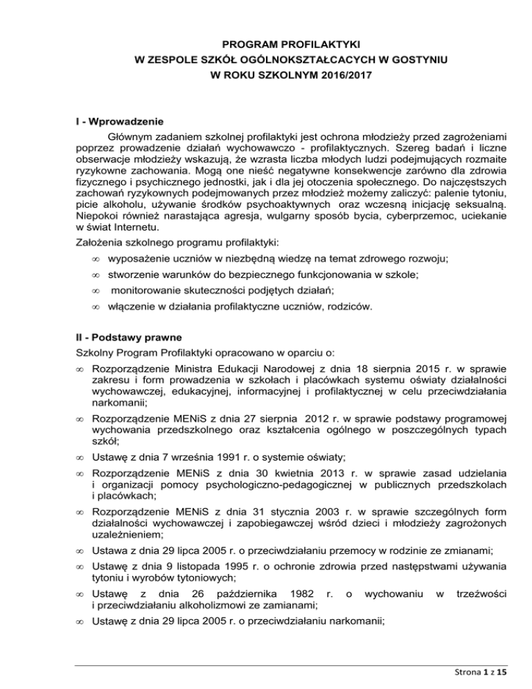 PROGRAM PROFILAKTYKI W ZESPOLE SZKÓŁ OGÓLNOKSZTAŁCACYCH W GOSTYNIU W ROKU SZKOLNYM 2016/2017 I - Wprowadzenie Głównym zadaniem szkolnej profilaktyki jest ochrona młodzieży przed zagrożeniami poprzez prowadzenie działań wychowawczo - profilaktycznych. Szereg badań i liczne obserwacje młodzieży wskazują, że wzrasta liczba młodych ludzi podejmujących rozmaite ryzykowne zachowania. Mogą one nieść negatywne konsekwencje zarówno dla zdrowia fizycznego i psychicznego jednostki, jak i dla jej otoczenia społecznego. Do najczęstszych zachowań ryzykownych podejmowanych przez młodzież możemy zaliczyć: palenie tytoniu, picie alkoholu, używanie środków psychoaktywnych oraz wczesną inicjację seksualną. Niepokoi również narastająca agresja, wulgarny sposób bycia, cyberprzemoc, uciekanie w świat Internetu. Założenia szkolnego programu profilaktyki: • wyposażenie uczniów w niezbędną wiedzę na temat zdrowego rozwoju; • stworzenie warunków do bezpiecznego funkcjonowania w szkole; • monitorowanie skuteczności podjętych działań; • włączenie w działania profilaktyczne uczniów, rodziców. II - Podstawy prawne Szkolny Program Profilaktyki opracowano w oparciu o: • Rozporządzenie Ministra Edukacji Narodowej z dnia 18 sierpnia 2015 r. w sprawie zakresu i form prowadzenia w szkołach i placówkach systemu oświaty działalności wychowawczej, edukacyjnej, informacyjnej i profilaktycznej w celu przeciwdziałania narkomanii; • Rozporządzenie MENiS z dnia 27 sierpnia 2012 r. w sprawie podstawy programowej wychowania przedszkolnego oraz kształcenia ogólnego w poszczególnych typach szkół; • Ustawę z dnia 7 września 1991 r. o systemie oświaty; • Rozporządzenie MENiS z dnia 30 kwietnia 2013 r. w sprawie zasad udzielania i organizacji pomocy psychologiczno-pedagogicznej w publicznych przedszkolach i placówkach; • Rozporządzenie MENiS z dnia 31 stycznia 2003 r. w sprawie szczególnych form działalności wychowawczej i zapobiegawczej wśród dzieci i młodzieży zagrożonych uzależnieniem; • Ustawa z dnia 29 lipca 2005 r. o przeciwdziałaniu przemocy w rodzinie ze zmianami; • Ustawę z dnia 9 listopada 1995 r. o ochronie zdrowia przed następstwami używania tytoniu i wyrobów tytoniowych; • Ustawę z dnia 26 października 1982 r. i przeciwdziałaniu alkoholizmowi ze zamianami; • Ustawę z dnia 29 lipca 2005 r. o przeciwdziałaniu narkomanii; o wychowaniu w trzeźwości Strona 1 z 15 • Ustawę z dnia 26 października 1982 r. o postępowaniu w sprawach nieletnich; • Ustawę z dnia 19 sierpnia 1994 r. o ochronie zdrowia psychicznego; • Rozporządzenie Ministra Zdrowia z dnia 25 czerwca 2003 r. w sprawie zakresu i organizacji profilaktycznej opieki zdrowotnej nad dziećmi i młodzieżą; • Konwencję o Prawach Dziecka uchwaloną przez zgromadzenie Ogólne Narodów Zjednoczonych z dnia 20 listopada 1989 r.; • Akty prawne szkoły (statut, regulaminy, program wychowawczy); • Uchwała rady Ministrów z 7 listopada 2006 r. „W sprawie działań administracji rządowej przeciwko przemocy w szkołach i placówkach oświatowych”. III - Diagnoza obszarów problemowych Program Profilaktyki jest wynikiem diagnozy problemów i potrzeb środowiska uczniów, rodziców i nauczycieli Zespołu Szkół Ogólnokształcących w Gostyniu. Diagnozy dokonano w oparciu o analizę: • rozmów z uczniami na zajęciach lekcyjnych i pozalekcyjnych prowadzonych przez pracowników szkoły; • rozmów z rodzicami; • frekwencji szkolnej uczniów; • informacji zwrotnych uzyskanych w kontakcie z instytucjami takimi jak np. Poradnia Psychologiczno - Pedagogiczna, Powiatowa Komenda Policji w Gostyniu, Ośrodki Pomocy Społecznej; • wnioski z prac Rady Pedagogicznej; • wyników ewaluacji wewnętrznej; • pomysłów podsuwanych przez Samorząd Uczniowski. IV - Cele Programu Profilaktyki szkoły • Podtrzymanie poczucia bezpieczeństwa w szkole występującego u naszych uczniów; • Aktywizacja środowiska szkolnego w zakresie oddziaływań profilaktycznych; • Promowanie zdrowego stylu życia; • Profilaktyka uzależnień; • Kształtowanie właściwego zachowania uczniów; • Utrwalanie postaw i zachowań społecznych warunkujących prawidłowy rozwój takich jak: poczucie własnej wartości, zachowania asertywne, umiejętność wyznaczania celów i podejmowania decyzji; • Podtrzymanie i pogłębienie wzajemnego zaufania w społeczności szkolnej; • Ograniczenie zachowań problemowych występujących u uczniów takich jak: wagary, obniżona motywacja do nauki, brak pomysłu na spędzanie wolnego czasu; • Uzyskanie większego zaangażowania rodziców w sprawy profilaktyki zagrożeń; • Kontynuowanie istniejącej współpracy z instytucjami wspierającymi szkołę w realizacji zadań wychowawczo- profilaktycznych oraz nawiązanie nowych kontaktów. Strona 2 z 15 V - Strategia W szkole skupiamy się na profilaktyce stopnia pierwszego i drugiego, która rozumiana jest w następujący sposób: Profilaktyka pierwszego stopnia polega na promowaniu zdrowego stylu życia, zapobieganiu zagrożeniom, uczeniu określonych umiejętności. Działania te kieruje się do całej społeczności szkolnej. Realizują je wszyscy nauczyciele, pracownicy szkoły i rodzice wspierani przez specjalistów. Profilaktyka drugiego stopnia to działania skierowane do uczniów podwyższonego ryzyka. Celem jest umożliwienie wycofania się z ryzykownych zachowań, poprzez udzielenie wsparcia. Tę formę profilaktyki realizują nauczyciele, pedagog szkolny i specjaliści współpracujący ze szkołą. Profilaktykę prowadzić będziemy według poniżej opisanych strategii: Strategia informacyjna – jej celem jest dostarczenie informacji na temat skutków zachowań ryzykownych i umożliwienie dokonywania dobrego wyboru. Strategia edukacyjna – jej celem jest pomoc w rozwijaniu ważnych umiejętności życiowych, takich jak radzenie sobie ze stresem, rozwiązywan