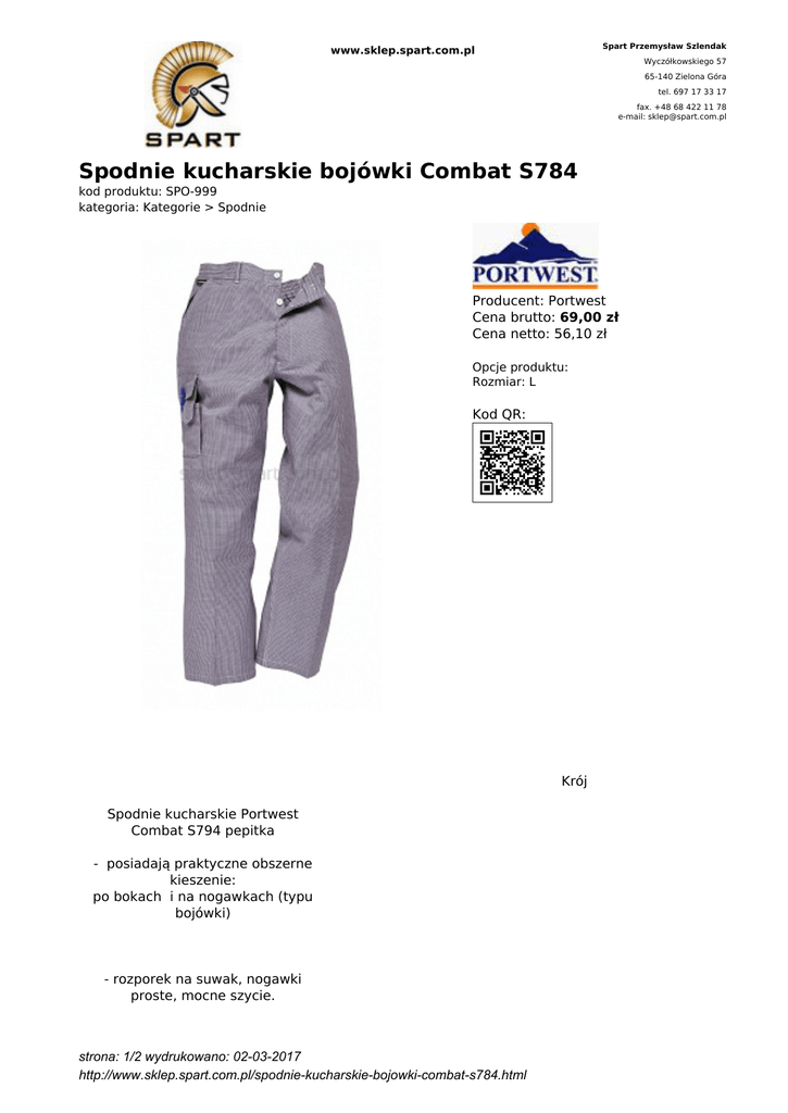 Spart Przemysław Szlendak www.sklep.spart.com.pl Wyczółkowskiego 57 65-140 Zielona Góra tel. 697 17 33 17 fax. +48 68 422 11 78 e-mail: [email protected] Spodnie kucharskie bojówki Combat S784 kod produktu: SPO-999 kategoria: Kategorie > Spodnie Producent: Portwest Cena brutto: 69,00 zł Cena netto: 56,10 zł Opcje produktu: Rozmiar: L Kod QR: Krój Spodnie kucharskie Portwest Combat S794 pepitka - posiadają praktyczne obszerne kieszenie: po bokach i na nogawkach (typu bojówki) - rozporek na suwak, nogawki proste, mocne szycie. strona: 1/2 wydrukowano: 02-03-2017 http://www.sklep.spart.com.pl/spodnie-kucharskie-bojowki-combat-s784.html - elastyczny pas - guma po bokach w tylnej części spodni Skład materiału: Właściwości materiału: Model niestety został wycofany z produkcji Portwest, jego następcą został model C078 Chester - który posiadamy na magazynie. Dobierz szybko swój rozmiar: Ile cm masz w pasie ? obwód pasa: XS 68-72 S 76-80 M 84-88 L 92-96 XL XXL XXXL 100-104 108-112 116-120 strona: 2/2 wydrukowano: 02-03-2017 http://www.sklep.spart.com.pl/spodnie-kucharskie-bojowki-combat-s784.html Wymiary spodni L 49