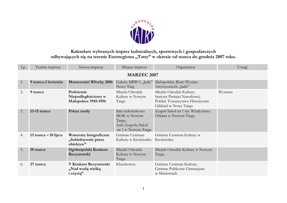 Kalendarz wybranych imprez kulturalnych, sportowych i gospodarczych odbywających się na terenie Euroregionu „Tatry” w okresie od marca do grudnia 2007 roku. Lp. Termin imprezy Nazwa imprezy Miejsce imprezy Organizator Uwagi MARZEC 2007 1. 9 marca-2 kwietnia 2. 9 marca Monteernici Włochy 2006 Galeria MBWA „Jatki” Nowy Targ Podziemie Miejski Ośrodek Niepodległościowe w Kultury w Nowym Małopolsce 1945-1956 Targu 3. 13-15 marca Pokaz mody 4. 13 marca – 10 lipca 5. 19 marca Warsztaty fotograficzne „Subiektywnie przez obiektyw” Ogólnopolski Konkurs Recytatorski 6. 27 marca V Konkurs Recytatorski „Nad wodą wielką i czystą” Małopolskie Biuro Wystaw Artystycznych „Jatki” Miejski Ośrodek Kultury, Instytut Pamięci Narodowej, Polskie Towarzystwo Historyczne Oddział w Nowy Targu Zespół Szkół nr 1 im. Władysława Orkana w Nowym Targu Sala widowiskowa MOK w Nowym Targu, Aula Zespołu Szkół nr 1 w Nowym Targu Gminne Centrum Gminne Centrum Kultury w Kultury w Krościenku Krościenku Miejski Ośrodek Kultury w Nowym Targu Kluszkowce 1 Miejski Ośrodek Kultury w Nowym Targu Gminne Centrum Kultury, Gminne Publiczne Gimnazjum w Maniowach Wystawa 7. 27-28 marca 8. marzec 9. marzec 10. marzec Przegląd Teatrzyków Dziecięcych „Bajkluś” Międzygimnazjalne warsztaty teatralne V Międzynarodowy Turniej Hokeja na Lodzie Wieczór z piosenką i poezją Czarny Dunajec Sromowce NiŜne Miejska Hala Lodowa w Nowym Targu Sala MiejskoGminnego Ośrodka Kultury w Muszynie Centrum Kultury i Promocji w Czarnym Dunajcu Gminne Publiczne Gimnazjum w Sromowcach NiŜnych Szkoła Podstawowa nr 11 im. śołnierzy Armii Krajowej w Nowym Targu Miejsko-Gminny Ośrodek Kultury w Muszynie KWIECIEŃ 2007 11. 1 kwietnia Spotkania z niespodzianką 12. 22 kwietnia 13. 23-27 kwietnia Koncert „Śpiewajmy Panu” Dni Otwarte Szkoły 14. 26 kwietnia 15. 26 kwietnia 16. 17. Konkurs wiedzy o Pieninach Gminne zawody w udzielaniu pierwszej pomocy 29 kwietnia – 5 maja United Europe Jazz Festiwal - IV Zakopiańska Wiosna Jazzowa 30 kwietnia Przegląd Teatrów Dziecięcych „Bajdurek” Miejsko-Gminny Ośrodek Kultury w Piwnicznej Zdroju Stare Bystre Szkoła Podstawowa w Sromowcach NiŜnych Szkoła Podstawowa w Sromowcach NiŜnych Szkoła Podstawowa Suche Miejsko-Gminny Ośrodek Kultury w Piwnicznej Zdroju Szkoła Podstawowa Suche Scena Główna Dolna Rówień Krupowa Miejski Ośrodek Kultury w Nowym 2 Miejski Ośrodek Kultury w Nowym Targu 18. kwiecień Konkurs Ekologiczny „Jestem współodpowiedzialny za stan środowiska” Przegląd Twórczości Plastycznej dzieci i młodzieŜy Yosemite 19. kwiecień 20. kwiecień 21. kwiecień 22. kwiecień 23. kwiecień 24. kwiecień 25. kwiecień Festyn Sienkiewiczowski 26. kwiecień Festyn Targu Gminne Publiczne Gimnazjum w Sromowcach NiŜnych Gminny Ośrodek Kultury w Łopusznej Miejski Ośrodek Kultury w Nowym Targu Wystawa Malarstwa Miejski Ośrodek Radevormwald (Niemcy) Kultury w Nowym Targu Talenty Małopolski Miejski Ośrodek Kultury w Nowym Targu Konkurs Plastyczny „Zabytki Architektury Zakopanego” Wieczór z piosenką i poezją Tatrzański Park Narodowy Sala MiejskoGminnego Ośrodka Kultury w Muszynie Szkoła Podstawowa nr 1 w Szczawnicy Plac przy dolnej stacji kolei linowej „Palenica” w Szczawnicy Miejski Ośrodek Kultury w Nowym Targu Miejski Ośrodek Kultury w Nowym Targu Starostwo Powiatowe w Nowym Targu, Miejski Ośrodek Kultury w Nowym Targu Tatrzański Park Narodowy Miejsko-Gminny Ośrodek Kultury w Muszynie Szkoła Podstawowa nr 1 w Szczawnicy MAJ 2007 27. 1-3 maja VII Wielka Majówka Plac pod Gubałówką 3 Wystawa fotografii Tadeusza Grzegorzewskiego Starostwo Powiatowe w Zakopanem XX Małopolski Festiwal Form Muzycznych i Tanecznych - eliminacje 28. 1-3 maja 29. 1 maja 30. 1 maja 31. 1-3 maja 32. 2 maja 33. 2 maja 34. 2 maja 35. 3 maja 36. 3 maja 37. 5-6 maja 38. 8 maja 39. 9 maja 40. 10 maja Tatrzańska Majówka w Krościenku V Gminny Festyn „U zbiegu trzech kultur – Lindada 2007” Majówka na Stasikówce Zakopane Scena Amfiteatru „Pod Wierzbą” nad Dunajcem Bukowina Tatrzańska Stasikówka Przepatrzowiny Teatrów Czarny Dunajec Regionalnych Małopolski Święto wód Plac Dietla w Szczawnicy Otwarcie sezonu Czorsztyn turystycznego Amatorskie Zawody w Piwniczna Zdrój Kolarstwie Górskim MTB Święto Bacowskie na Małe Ciche Tarasówce Otwarcie sezonu Amfiteatr kulturalnego „Zapopradzie”, Aleja Zdrojowa w Muszynie XV Przednówek Dom Ludowy w w Polanach Kościelisku Bieg Sztafetowy Nowe Bystre MłodzieŜy im. Br. Czecha Olimpiada wiedzy o Czarny Dunajec Europie X Konkurs wiedzy o TPN Małe Ciche Gminne Centrum Kultury w Krościenku Bukowiańskie Centrum Kultury Sołectwo Staszkówka, Szkoła Podstawowa w Stasikówce Centrum Kultury i Promocji w Czarnym Dunajcu Gminne Centrum Kultury, Wójt Gminy Czorsztyn Miejsko-Gminny Ośrodek Kultury w Piwnicznej Zdroju Oddział Związku Podhalan w Małem Cichem Miejsko-Gminny Ośrodek Kultury w Muszynie Związek Podhalan Oddział Kościelisko; współorganizator Gminny Ośrodek Kultury Regionalnej w Kościelisku Zespół Szkół Nowe Bystre Szkoła Podstawowa w Małem 4 Cichem, Tatrzański Park Narodowy 41. 13 maja 42. 22 maja 43. 23 maja 44. 24 maja 45. 24 maja 46. 25-27 maja 47. 26 maja 48. 27 maja Przegląd Góralskiej Pieśni Religijnej – „Bachledówka” Mecz piłki noŜnej w kategoriach trampkarzy Limanowa – Dolny Kubin Gminny konkurs wiedzy o TOPR Czerwienne Przegląd Dziecięcego Teatru Regionalnego Przegląd Piosenki i Poezji Religijnej IV Limanowski Ekstremalny Maraton Pieszy Kierat 2007 XXXII Wojewódzki Konkurs Plastyczny „Matka w Oczach Dziecka” Majówka w Dzianiszu Ratułów Stadion sportowy MKS „Limanovia” Urząd Miasta Limanowa Zespół Szkół w Murzasichlu Zespół Szkół w Murzasichlu, TOPR, Sekcja górska Towarzystwa Gimnastycznego „Sokół” Zakopane Gminny Ośrodek Kultury w Poroninie Trasy Beskidu Wyspowego Miejski Ośrodek Kultury w Nowym 