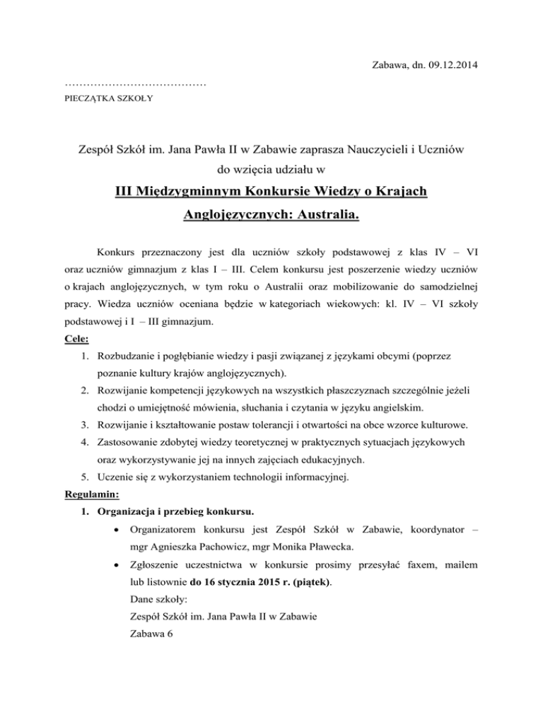 Zabawa, dn. 09.12.2014 ………………………………… PIECZĄTKA SZKOŁY Zespół Szkół im. Jana Pawła II w Zabawie zaprasza Nauczycieli i Uczniów do wzięcia udziału w III Międzygminnym Konkursie Wiedzy o Krajach Anglojęzycznych: Australia. Konkurs przeznaczony jest dla uczniów szkoły podstawowej z klas IV – VI oraz uczniów gimnazjum z klas I – III. Celem konkursu jest poszerzenie wiedzy uczniów o krajach anglojęzycznych, w tym roku o Australii oraz mobilizowanie do samodzielnej pracy. Wiedza uczniów oceniana będzie w kategoriach wiekowych: kl. IV – VI szkoły podstawowej i I – III gimnazjum. Cele: 1. Rozbudzanie i pogłębianie wiedzy i pasji związanej z językami obcymi (poprzez poznanie kultury krajów anglojęzycznych). 2. Rozwijanie kompetencji językowych na wszystkich płaszczyznach szczególnie jeżeli chodzi o umiejętność mówienia, słuchania i czytania w języku angielskim. 3. Rozwijanie i kształtowanie postaw tolerancji i otwartości na obce wzorce kulturowe. 4. Zastosowanie zdobytej wiedzy teoretycznej w praktycznych sytuacjach językowych oraz wykorzystywanie jej na innych zajęciach edukacyjnych. 5. Uczenie się z wykorzystaniem technologii informacyjnej. Regulamin: 1. Organizacja i przebieg konkursu. Organizatorem konkursu jest Zespół Szkół w Zabawie, koordynator – mgr Agnieszka Pachowicz, mgr Monika Pławecka. Zgłoszenie uczestnictwa w konkursie prosimy przesyłać faxem, mailem lub listownie do 16 stycznia 2015 r. (piątek). Dane szkoły: Zespół Szkół im. Jana Pawła II w Zabawie Zabawa 6 33 – 133 Wał – Ruda tel./fax 14 622 60 81 e- mail: [email protected] Konkurs jest jednoetapowy i odbędzie się: - dla szkół podstawowych 11 lutego 2015 r. (środa) o godzinie 9.00 w budynku Zespołu Szkół w Zabawie; - dla szkół gimnazjalnych 12 lutego 2015r. (czwartek) o godzinie 9.00 w budynku Zespołu Szkół w Zabawie. . Uczniowie klas IV – VI szkoły podstawowej i I – III gimnazjum, maksymalnie dwie osoby z danej szkoły, odpowiadają na pytania z wiedzy indywidualnie, pisemnie. Planowany czas trwania pisania: 60 minut. Wręczenie dyplomów i rozdanie nagród odbędzie się po zakończeniu konkursu. Nauczyciele otrzymają podziękowania za przygotowanie uczniów do konkursu. Szczegółowe informacje można uzyskać pisząc zapytanie na adres e-mail: [email protected] lub pod nr telefonu: 146226081 (sekretariat). 2. Zakres wymagań konkursowych: Państwo i ludzie - położenie geograficzne, powierzchnia, ludność, podział polityczny, narodowości, regiony, stolice, symbole narodowe, flaga, hymn narodowy. Historia - ważniejsi władcy i postacie historyczne, ważniejsze wydarzenia historyczne np. : Odkrycie Australii, Panowanie Wielkiej Brytanii, Uzyskanie niepodległości. Geografia - klimat, środowisko, fauna i flora, rzeki, góry, wzniesienia, morza, jeziora, itp., regiony geograficzne, miasta. Ustrój polityczny. Edukacja - system szkolny. Jedzenie- zwyczaje żywieniowe, narodowe potrawy, napoje. Sport - sporty narodowe, słynni sportowcy, wydarzenia sportowe. Sztuka - galerie i muzea, najsłynniejsze zabytki, teatry, kina, filmy, aktorzy, muzyka, zespoły, piosenkarze, słynne utwory literackie i pisarze. Święta - święta religijne i narodowe, tradycje narodowe i regionalne, dni wolne od pracy. Religia. Ciekawostki: słynne miejsca, budynki, ludzie: aktorzy, wykonawcy, pisarze, naukowcy. 3. Pytania konkursowe sformułowane będą w oparciu o informacje zawarte w następujących książkach: „Australia” – autor Cheryl Striveildi, „Australia” – autor Terry G. Jordan-Bychkov (głównie szkoły gimnazjalne) oraz informacje zamieszczone w Internecie. Obydwie publikacje można pobrać w formacie PDF ze strony internetowej szkoły: www.zszabawa.pl ……………………………….. KOORDYNATOR …………………………………… PIECZĄTKA SZKOŁY ……….………………………… PIECZATKA DYR. SZKOŁY …………………………… DATA Zgłoszenie uczestnictwa w III Międzygminnym Konkursie Wiedzy o Krajach Anglojęzycznych: Australia KL. IV – VI NAZWA SZKOŁY: ………………………………………………………………………………………………… NAZWISKO OPIEKUNA: ………………………………………………………………………………………………… TELEFON KONTAKTOWY: ………………………………………………………………………………………………….. ADRES E-MAIL: ………………………………………………………………………………………………… NAZWISKO UCZESTNIKA, KLASA: 1. …………………………………………………………………………………….. 2. …………………………………………………………………………………….. ………………………………………………. …………………………………… PODPIS OPIEKUNA PIECZATKA DYR. SZKOŁY …………………………………… PIECZĄTKA SZKOŁY …………………………… DATA Zgłoszenie uczestnictwa w III Międzygminnym Konkursie Wiedzy o Krajach Anglojęzycznych: Australia KL. GIMNAZJALNE NAZWA SZKOŁY: ………………………………………………………………………………………………… NAZWISKO OPIEKUNA: ………………………………………………………………………………………………… TELEFON KONTAKTOWY: ………………………………………………………………………………………………….. ADRES E-MAIL: ………………………………………………………………………………………………… NAZWISKO UCZESTNIKA, KLASA: 1. …………………………………………………………………………………….. 2. …………………………………………………………………………………….. …………
