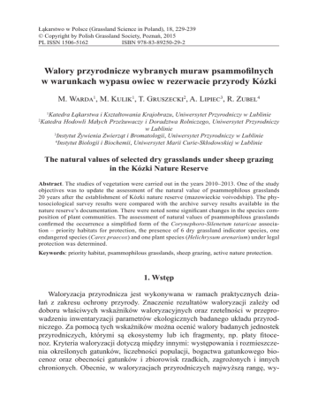 Łąkarstwo w Polsce (Grassland Science in Poland), 18, 229-239 © Copyright by Polish Grassland Society, Poznań, 2015 PL ISSN 1506-5162 ISBN 978-83-89250-29-2 Walory przyrodnicze wybranych muraw psammofilnych w warunkach wypasu owiec w rezerwacie przyrody Kózki M. Warda1, M. Kulik1, T. Gruszecki2, A. Lipiec3, R. Zubel4 1 Katedra Łąkarstwa i Kształtowania Krajobrazu, Uniwersytet Przyrodniczy w Lublinie Katedra Hodowli Małych Przeżuwaczy i Doradztwa Rolniczego, Uniwersytet Przyrodniczy w Lublinie 3 Instytut Żywienia Zwierząt i Bromatologii, Uniwersytet Przyrodniczy w Lublinie 4 Instytut Biologii i Biochemii, Uniwersytet Marii Curie-Skłodowskiej w Lublinie 2 The natural values of selected dry grasslands under sheep grazing in the Kózki Nature Reserve Abstract. The studies of vegetation were carried out in the years 2010–2013. One of the study objectives was to update the assessment of the natural value of psammophilous grasslands 20 years after the establishment of Kózki nature reserve (mazowieckie voivodship). The phytosociological survey results were compared with the archive survey results available in the nature reserve’s documentation. There were noted some significant changes in the species composition of plant communities. The assessment of natural values of psammophilous grasslands confirmed the occurrence a simplified form of the Corynephoro-Silenetum tataricae association – priority habitats for protection, the presence of 6 dry grassland indicator species, one endangered species (Carex praecox) and one plant species (Helichrysum arenarium) under legal protection was determined. Keywords: priority habitat, psammophilous grasslands, sheep grazing, active nature protection. 1. Wstęp Waloryzacja przyrodnicza jest wykonywana w ramach praktycznych działań z zakresu ochrony przyrody. Znaczenie rezultatów waloryzacji zależy od doboru właściwych wskaźników waloryzacyjnych oraz rzetelności w przeprowadzeniu inwentaryzacji parametrów ekologicznych badanego układu przyrodniczego. Za pomocą tych wskaźników można ocenić walory badanych jednostek przyrodniczych, którymi są ekosystemy lub ich fragmenty, np. płaty fitocenoz. Kryteria waloryzacji dotyczą między innymi: występowania i rozmieszczenia określonych gatunków, liczebności populacji, bogactwa gatunkowego biocenoz oraz obecności gatunków i zbiorowisk rzadkich, zagrożonych i innych chronionych. Obecnie, w waloryzacjach przyrodniczych najwyższą rangę, wy- 230 M. Warda, M. Kulik, T. Gruszecki, A. Lipiec, R. Zubel nikającą z prawa międzynarodowego posiadają gatunki umieszczone w załącznikach II i IV Dyrektywy Siedliskowej (Zalewska i wsp., 2013). Rezerwat przyrody Kózki, zlokalizowany na terenie Parku Krajobrazowego „Podlaski Przełom Bugu”, jest jednym z chronionych obszarów w ramach programu Natura 2000 („Ostoja Nadbużańska” – PLH140011). Cechą charakterystyczną krajobrazu są tu płaty piaszczystych muraw, powstałych z osadów naniesionych przez rzekę. Skutkiem zaniechania użytkowania runi tych muraw jest odkładanie martwej, nierozłożonej materii organicznej oraz stopniowe zacienienie gleby. To sprzyja pojawianiu się siewek drzew i krzewów, które zacieniają murawy i powodują ustępowanie gatunków skrajnie sucho- i światłolubnych, a przenikanie – gatunków łąkowych (Kulik i wsp., 2013). Naturalnym i efektywnym sposobem zapobiegania zmianom zagrażającym istnieniu zbiorowisk murawowych jest wypas zwierząt, którego następstwem jest ograniczenie zachwaszczenia oraz zahamowanie sukcesji wtórnej (Ceynowa-Giełdon, 1986; Zarzycki i Misztal 2010; Warda i Kulik, 2012). W ostatnich latach są w tym celu wykorzystywane stare rasy przeżuwaczy, np. rodzima rasa owiec – świniarka, co jednocześnie przyczynia się do ochrony zagrożonych zasobów genetycznych zwierząt w rolnictwie oraz siedlisk cennych przyrodniczo (Gruszecki i wsp., 2011). W związku z tym, na terenie rezerwatu Kózki podjęto badania w ramach interdyscyplinarnego projektu – „Czynna ochrona wybranych siedlisk Natura 2000 z wykorzystaniem rodzimej rasy owiec” (projekt MNiSzW – NN305 411038). Jednym z celów przeprowadzonych badań była aktualizacja oceny walorów przyrodniczych muraw napiaskowych po ponad 20 latach istnienia rezerwatu Kózki. 2. Materiał i metody Rezerwat przyrody Kózki znajduje się przy trasie Łosice-Siemiatycze, w północnej części gminy Sarnaki (ryc. 1). W regionalizacji fizyczno-geograficznej, według Kondrackiego (2009), rezerwat Kózki znajduje się w prowincji Nizin Środkowopolskich, w makroregionie – Nizina Południowopodlaska i mezoregionie – Wysoczyzna Siedlecka. Od północy, granicę rezerwatu stanowi koryto rzeki Bug, a od południa jej starorzecza. Granicę wyznacza również styk muraw rezerwatu z gruntami ornymi (Dombrowski i Wereszczyńska, 1991). Zbiorowiska roślinne, występujące w rezerwacie Kózki są reprezentowane przez zwarte murawy, tworzące tzw. wydmę szarą oraz luźne murawy, kształtujące tzw. wydmę białą, porośniętą przez kępkową roślinność, z rozległymi, niezadarnionymi powierzchniami odkrytego piasku. Murawy napiaskowe są objęte ochroną prawną jako siedlisko nr 6120, wymienione w I Załączniku Dy© PTŁ, Łąkarstwo w Polsce, 18, 2015 Walory przyrodnicze wybranych muraw psammofilnych w warunkach wypasu owiec... 231 Rycina 1. Lokalizacja rezerwatu przyrody Kózki (opracowanie M. Kulik) Figure 1. Localization of the Kózki Nature Reserve (elaboration by M. Kulik) rektywy Siedliskowej UE. W przeszłości, te murawy były ekstensywnie użytkowane przez wypas, jednak obecnie obserwuje się najczęściej brak lub znaczne ograniczenie ich użytkowania. Próba przywrócenia ekstensywnego użytkowania pastwiskowego jest tu ważnym działaniem w zakresie pielęgnacji krajobrazu przyrodniczego oraz ochrony różnorodności zbiorowisk i zapewnienia właściwego stanu siedlisk Natura 2000 (Warda i Rogalski, 2004