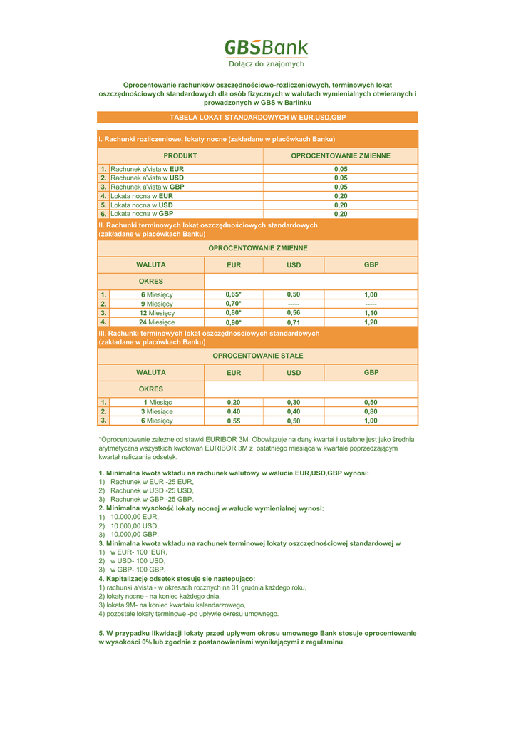 Oprocentowanie rachunków oszczędnościowo-rozliczeniowych, terminowych lokat oszczędnościowych standardowych dla osób fizycznych w walutach wymienialnych otwieranych i prowadzonych w GBS w Barlinku TABELA LOKAT STANDARDOWYCH W EUR,USD,GBP I. Rachunki rozliczeniowe, lokaty nocne (zakładane w placówkach Banku) OPROCENTOWANIE ZMIENNE PRODUKT 1. 2. 3. 4. 5. 6. Rachunek a'vista w EUR Rachunek a'vista w USD Rachunek a'vista w GBP Lokata nocna w EUR Lokata nocna w USD Lokata nocna w GBP 0,05 0,05 0,05 0,20 0,20 0,20 II. Rachunki terminowych lokat oszczędnościowych standardowych (zakładane w placówkach Banku) OPROCENTOWANIE ZMIENNE WALUTA EUR USD GBP 0,65* 0,70* 0,80* 0,90* 0,50 ----0,56 0,71 1,00 ----1,10 1,20 OKRES 1. 2. 3. 4. 6 Miesięcy 9 Miesięcy 12 Miesięcy 24 Miesięce III. Rachunki terminowych lokat oszczędnościowych standardowych (zakładane w placówkach Banku) OPROCENTOWANIE STAŁE WALUTA EUR USD GBP 0,20 0,40 0,55 0,30 0,40 0,50 0,50 0,80 1,00 OKRES 1. 2. 3. 1 Miesiąc 3 Miesiące 6 Miesięcy *Oprocentowanie zależne od stawki EURIBOR 3M. Obowiązuje na dany kwartał i ustalone jest jako średnia arytmetyczna wszystkich kwotowań EURIBOR 3M z ostatniego miesiąca w kwartale poprzedzającym kwartał naliczania odsetek. 1. Minimalna kwota wkładu na rachunek walutowy w walucie EUR,USD,GBP wynosi: 1) Rachunek w EUR -25 EUR, 2) Rachunek w USD -25 USD, 3) Rachunek w GBP -25 GBP. 2. Minimalna wysokość lokaty nocnej w walucie wymienialnej wynosi: 1) 10.000,00 EUR, 2) 10.000,00 USD, 3) 10.000,00 GBP. 3. Minimalna kwota wkładu na rachunek terminowej lokaty oszczędnościowej standardowej w 1) w EUR- 100 EUR, 2) w USD- 100 USD, 3) w GBP- 100 GBP. 4. Kapitalizację odsetek stosuje się nastepująco: 1) rachunki a'vista - w okresach rocznych na 31 grudnia każdego roku, 2) lokaty nocne - na koniec każdego dnia, 3) lokata 9M- na koniec kwartału kalendarzowego, 4) pozostałe lokaty terminowe -po upływie okresu umownego. 5. W przypadku likwidacji lokaty przed upływem okresu umownego Bank stosuje oprocentowanie w wysokości 0% lub zgodnie z postanowieniami wynikającymi z regulaminu.
