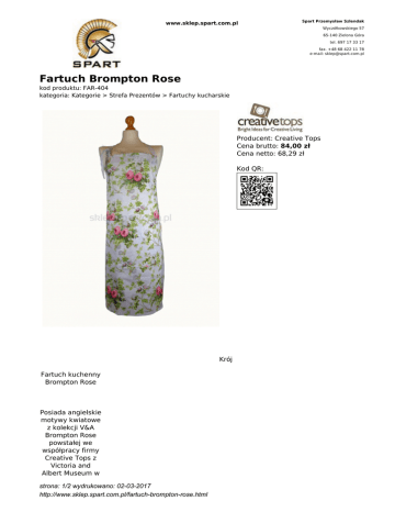 www.sklep.spart.com.pl Spart Przemysław Szlendak Wyczółkowskiego 57 65-140 Zielona Góra tel. 697 17 33 17 fax. +48 68 422 11 78 e-mail: [email protected] Fartuch Brompton Rose kod produktu: FAR-404 kategoria: Kategorie > Strefa Prezentów > Fartuchy kucharskie Producent: Creative Tops Cena brutto: 84,00 zł Cena netto: 68,29 zł Kod QR: Krój Fartuch kuchenny Brompton Rose Posiada angielskie motywy kwiatowe z kolekcji V&A Brompton Rose powstałej we współpracy firmy Creative Tops z Victoria and Albert Museum w strona: 1/2 wydrukowano: 02-03-2017 http://www.sklep.spart.com.pl/fartuch-brompton-rose.html Londynie. Skład materiału: 100% Ba wymiary: Kwintesencja i elegancja angielskiego wzornictwa. Fartuch posiada regulowany pasek na szyję i szeroką pojemną kieszeń. V&A (Victoria and Albert Museum) jest największym muzeum dekoracji i designu artystycznego na świecie. Nie ma sobie równych pod względem zakresu i różnorodności zbiorów. Idealny na prezent, do kuchennego królestwa. strona: 2/2 wydrukowano: 02-03-2017 http://www.sklep.spart.com.pl/fartuch-brompton-rose.html 70