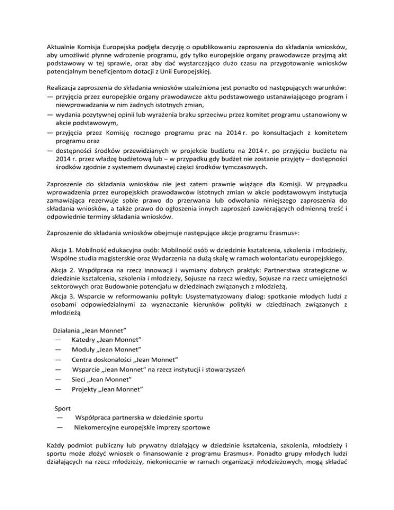 Aktualnie Komisja Europejska podjęła decyzję o opublikowaniu zaproszenia do składania wniosków, aby umożliwić płynne wdrożenie programu, gdy tylko europejskie organy prawodawcze przyjmą akt podstawowy w tej sprawie, oraz aby dać wystarczająco dużo czasu na przygotowanie wniosków potencjalnym beneficjentom dotacji z Unii Europejskiej. Realizacja zaproszenia do składania wniosków uzależniona jest ponadto od następujących warunków: — przyjęcia przez europejskie organy prawodawcze aktu podstawowego ustanawiającego program i niewprowadzania w nim żadnych istotnych zmian, — wydania pozytywnej opinii lub wyrażenia braku sprzeciwu przez komitet programu ustanowiony w akcie podstawowym, — przyjęcia przez Komisję rocznego programu prac na 2014 r. po konsultacjach z komitetem programu oraz — dostępności środków przewidzianych w projekcie budżetu na 2014 r. po przyjęciu budżetu na 2014 r. przez władzę budżetową lub – w przypadku gdy budżet nie zostanie przyjęty – dostępności środków zgodnie z systemem dwunastej części środków tymczasowych. Zaproszenie do składania wniosków nie jest zatem prawnie wiążące dla Komisji. W przypadku wprowadzenia przez europejskich prawodawców istotnych zmian w akcie podstawowym instytucja zamawiająca rezerwuje sobie prawo do przerwania lub odwołania niniejszego zaproszenia do składania wniosków, a także prawo do ogłoszenia innych zaproszeń zawierających odmienną treść i odpowiednie terminy składania wniosków. Zaproszenie do składania wniosków obejmuje następujące akcje programu Erasmus+: Akcja 1. Mobilność edukacyjna osób: Mobilność osób w dziedzinie kształcenia, szkolenia i młodzieży, Wspólne studia magisterskie oraz Wydarzenia na dużą skalę w ramach wolontariatu europejskiego. Akcja 2. Współpraca na rzecz innowacji i wymiany dobrych praktyk: Partnerstwa strategiczne w dziedzinie kształcenia, szkolenia i młodzieży, Sojusze na rzecz wiedzy, Sojusze na rzecz umiejętności sektorowych oraz Budowanie potencjału w dziedzinach związanych z młodzieżą. Akcja 3. Wsparcie w reformowaniu polityk: Usystematyzowany dialog: spotkanie młodych ludzi z osobami odpowiedzialnymi za wyznaczanie kierunków polityki w dziedzinach związanych z młodzieżą Działania „Jean Monnet” — Katedry „Jean Monnet” — Moduły „Jean Monnet” — Centra doskonałości „Jean Monnet” — Wsparcie „Jean Monnet” na rzecz instytucji i stowarzyszeń — Sieci „Jean Monnet” — Projekty „Jean Monnet” Sport — Współpraca partnerska w dziedzinie sportu — Niekomercyjne europejskie imprezy sportowe Każdy podmiot publiczny lub prywatny działający w dziedzinie kształcenia, szkolenia, młodzieży i sportu może złożyć wniosek o finansowanie z programu Erasmus+. Ponadto grupy młodych ludzi działających na rzecz młodzieży, niekoniecznie w ramach organizacji młodzieżowych, mogą składać wnioski o finansowanie mobilności edukacyjnej młodych ludzi i osób pracujących z młodzieżą oraz o finansowanie partnerstw strategicznych w dziedzinach związanych z młodzieżą. Całkowity budżet przeznaczony na konkurs szacuje się na 1 507,3 mln EUR: Kształcenie i szkolenie : 1 305,3 mln EUR Młodzież : 174,2 mln EUR Działania „Jean Monnet” : 11,2 mln EUR Sport : 16,6 mln EUR Poziom przyznanych dotacji oraz czas trwania projektów są różne w zależności od takich czynników, jak rodzaj projektu i liczba zaangażowanych partnerów. Erasmus+ Terminy składania wniosków w roku 2015 Akcja 1. Mobilność osób w dziedzinie młodzieży – 4 lutego 2015 r. Mobilność osób w dziedzinie kształcenia i szkolenia – 4 marca 2015 r. Mobilność osób w dziedzinie młodzieży – 30 kwietnia 2015 r. Mobilność osób w dziedzinie młodzieży – 1 października 2015 r. Wspólne studia magisterskie Erasmus Mundus – 4 marca 2015 r. Wydarzenia na dużą skalę w ramach wolontariatu europejskiego – 3 kwietnia 2015 r. Akcja 2. Partnerstwa strategiczne w dziedzinie młodzieży – 4 lutego 2015 r. Partnerstwa strategiczne w dziedzinie kształcenia, szkolenia i młodzieży – 30 kwietnia 2015 r. Partnerstwa strategiczne w dziedzinie młodzieży – 1 października 2015 r. Sojusze na rzecz wiedzy, sojusze na rzecz umiejętności sektorowych – 26 lutego 2015 r. Budowanie potencjału w dziedzinie szkolnictwa wyższego – 10 lutego 2015 r. Budowanie potencjału w dziedzinie młodzieży – 3 kwietnia 2015 r., 2 września 2015 r. Akcja 3. Spotkanie młodych ludzi z osobami odpowiedzialnymi za wyznaczanie kierunków polityki w dziedzinach związanych z młodzieżą – 4 lutego 2015 r., 30 kwietnia 2015 r., 1 października 2015 r. Działania „Jean Monnet” Katedry, moduły, centra doskonałości, wsparcie dla instytucji i stowarzyszeń, sieci, projekty – 26 lutego 2015 r. Działania w dziedzinie sportu Współpraca partnerska w dziedzinie sportu związana wyłącznie z Europejskim Tygodniem Sportu 2015 – 22 stycznia 2015 r. Współpraca partnerska w dziedzinie sportu niepowiązana z Europejskim Tygodniem Sportu 2015 – 14 maja 2015 r. Niekomercyjne europejskie imprezy sportowe związane wyłącznie z Europejskim Tygodniem Sportu 2015 – 22 stycznia 2015 r. Niekomercyjne europejskie imprezy sportowe niepowiązane z Europejskim Tygodniem Sportu 2015 – 14 maja 2015 r. Szczegółowe informacje o zasadach wnioskowania w roku 2015 Komisja Europejska opublikuje w „Przewodniku po programie Erasmus+ 2015″, o którego ukazaniu się Narodowa Agencja Programu Erasmus+ Młodzież niezwłocznie poinformuje na swojej stronie: erasmusplus.org.pl.