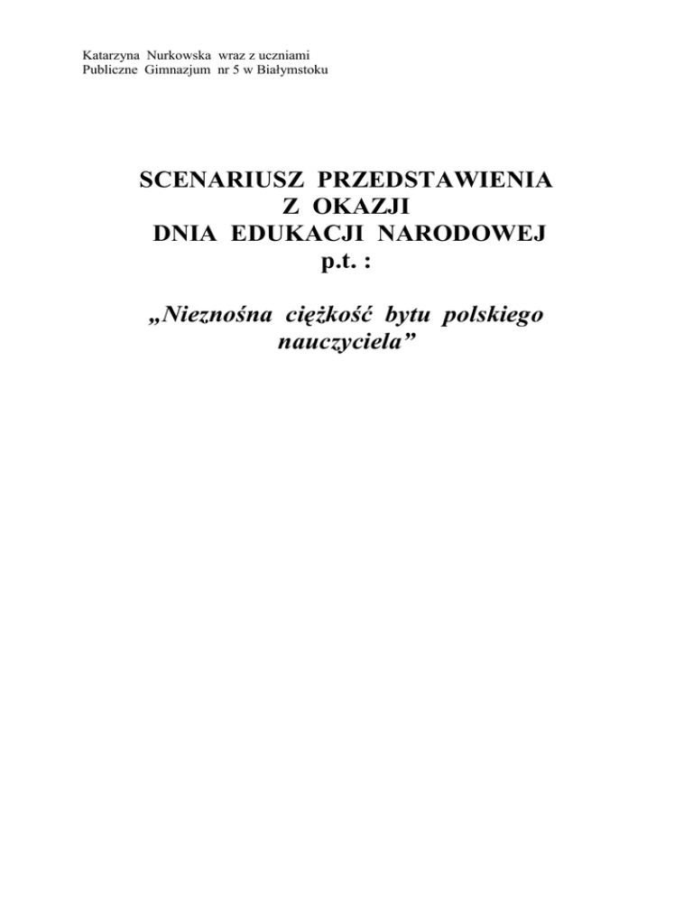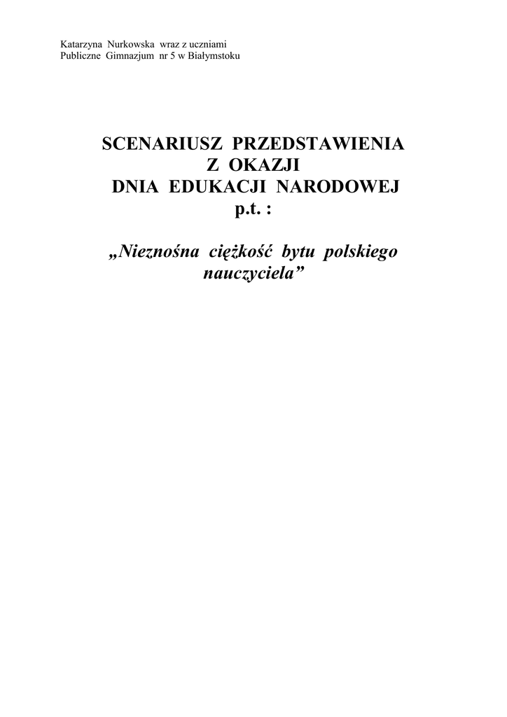 Katarzyna Nurkowska wraz z uczniami Publiczne Gimnazjum nr 5 w Białymstoku SCENARIUSZ PRZEDSTAWIENIA Z OKAZJI DNIA EDUKACJI NARODOWEJ p.t. : „Nieznośna ciężkość bytu polskiego nauczyciela” DZIEŃ EDUKACJI NARODOWEJ OSOBY : - Nauczyciel - Dyrektorka - Prezydent miasta - Prezes Związku Wszelakiego Wsparcia - Uczeń 1 - Uczeń 2 - Uczeń 3 - Uczeń 4 - Psychiatra - Minister oświaty- Pani Halinka (woźna) SCENARIUSZ MUZYKA 1. Scena : w szpitalu. /Nauczyciel leży w łóżku z podłączoną kroplówką, wyraźnie widać, że nie jest zdrowy./ Psychiatra – No panie magistrze, jak się dziś czujemy? Nauczyciel – (zdezorientowany) Eeee... a był już dzwonek na lekcje? Psychiatra – Tylko spokojnie, proszę się nie denerwować. Uczyliśmy się już tego, pełne opanowanie. Proszę policzyć do dziesięciu i uspokoić się.( odliczanie po rosyjsku …) Pamięta pan na czym wczoraj skończyliśmy? Nauczyciel – A... tak! Rozporządzenie Ministra Edukacji Narodowej z 3 sierpnia 2000r. w sprawie… Psychiatra –(przerywa) Może przypomnijmy sobie, co jest powodem pańskiego pobytu u nas. Pamięta pan stare, ciężkie i niezwykle trudne czasy, które są powodem pana dzisiejszej choroby...? MUZYKA 2. Scena : spotkanie komisji ze stażystą Nauczyciel- (wchodzi z małą teczką, speszony) Dzień dobry. (drżący głos) Opiekun stażu : Pani dyrektor, przez 9 miesięcy byłem opiekunem stażu mego kolegi magistra wychowania do życia w rodzinie Gerwazego Piątki, mam nadzieję ,ze udowodni on, że zasłużył na tytuł nauczyciela kontraktowego. Dyrektorka- Witam ( podaje rękę). 9 miesięcy szybko minęło, oj szybko. Bardzo proszę przedstawić swoje osiągnięcia . Nauczyciel- No tak, ten, tego, uczyłem wychowania do życia w rodzinie…, starałem się często robić klasówki… Dyrektorka- Dobra, dobra, a Pan bardziej praktyk czy teoretyk? Nauczyciel- Pauperyzacja mojego umysłu nie o b l i g u j e mnie do odpowiedzi na to pytanie Opiekun stażu - O obligacjach to innym razem Dyrektorka - (przegląda papiery) O widzę zdjęcie gazetki, tak… i zaświadczenie od sołtysa z Bociek, pięknie i zdjęcia z dworca PKP. Podróżnik z pana. Nauczyciel- Człowiek ciekawy świata. Dyrektorka - A propos punktu 4 rozporządzenia ,który brzmi : „znajomość organizacji i zasad funkcjonowania szkoły”. Gdzie w naszej szkole zlokalizowane jest pomieszczenie, w którym codziennie odbywają się filozoficzne rozmowy na temat problemów egzystencjalnych człowieka? Nauczyciel- (zakłopotany) Opiekun stażu- (podpowiada) Kaczy dół (palarnia) Nauczyciel- Kaczy dół Dyrektorka- Gratuluję. Właśnie otrzymał pan stopień nauczyciela kontraktowego. Konferansjer składa życzenia i zapowiada piosenkę dla nauczycieli stażystów Piosenka 3. Scena : Próba zdobycia tytułu Nauczyciela Mianowanego a) Zamieszanie w klasie /Bardzo zdenerwowany nauczyciel wpada do klasy pełnej uczniów, próbuje szybko wydrukować ważne dokumenty ,jednak nie jest zorientowany w oprogramowaniu i ma duże trudności z komputerem. Z pomocą przychodzi mu uczeń./ Nauczyciel – (bardzo zdenerwowany) Do jasnej Anielki! Jak mam to wydrukować?! Do czego podobny jest ten Linux?! Nic nie można w nim zrobić! Nie zdobędę tego mianowania! Może Wy macie pojęcie w jaki sposób można to wydrukować? Uczeń 1 – (Podchodzi powoli, luzacko) To może ja spróbuje...w końcu należałam kiedyś do koła linuxowego (prezentuje koszulkę, podchodzi, drukuje ) Nauczyciel – (Nieco odetchnął) Dziękuję ci, uratowałaś mnie przed pożarciem komisji . Została mi tylko ta nudna dokumentacja. Dzieciaki, pomożecie mi? Uczeń 2 – A dostaniemy plusy? Wie pan, nic za darmo... Nauczyciel – (zdesperowany) Wszystko dostaniecie, tylko mi pomóżcie, szybko! Uczeń 3 – (na luzie) Robi się panie psorze. Spoko majonez! Uczeń 2 – Hej, Kaśka zapodaj ta teczkę tutaj. Uczeń 3 - Sie robi ziomalu. Już leci. muzyka (Uczniowie pomagają nauczycielowi przygotować dokumentacje, składają segregatory, albumy, papiery) b)Egzamin członkowie komisji popijają kawę, czytają kolorowe czasopisma, może grają w karty /Nauczyciel wpada przed komisję zdyszany – ledwie zdążył przygotować dokumentację, wita się z komisją i podaje swoje papiery./ Prezydent miasta – (przeglądając dokumentacje przygotowana przez nauczyciela) Wnioskujemy ze złożonych przez pana dokumentów, że spełnił pan wymagania umożliwiające uzyskanie awansu na stopień nauczyciela mianowanego. Doskonale poradził sobie pan z nawiązaniem dobrego kontaktu z młodzieżą. Może pan to przybliżyć? Jak pan się realizował w sferze wychowawczej? Nauczyciel – Myślę, że dotarłem do współczesnej młodzieży. Starałem się wizualnie upodobnić do moich dzieciaków, kupiłem dresy na Buenos Madros. A swoją drogą wie pan, Panie Prezydencie, że dają tam czwarty pasek zupełnie za darmo? W dodatku nauczyłem się slangu, uczniowie wyjaśnili mi znaczenie używanych przez nich słów. Jestem pełen podziwu dla ich twórczości. Zaś na lekcjach poruszaliśmy problemy dotyczące narkotyków i alkoholu, odróżnialiśmy mąkę od kokainy… Przewodnicząca ZWW – Chciałabym sprawdzić nabytą przez pana wiedzę. Mógłby pan wyjaśnić nam znaczenie słowa „ziomal”? Nauczyciel – Oczywiście. Oznacza tyle co "kumpel". W kulturze hip-hopowej słowo to oznacza kogoś, kto wychował się na tym samym podwórku albo jest członkiem tego samego składu (grupy). Przewodnicząca ZWW – A „jednokomórkowiec”? Nauczyciel – (tryumfalnie) Posiadacz telefonu komórkowego, ostentacyjnie się z nim obnoszący. Dyrektorka – No to wporzo. Sferę wychowawczą ma pan zaliczoną, teraz przejdźmy do sfery osobistej. Nauczyciel – Jest dobrze. Od 2-óch dni mam narzeczoną. Dyrektorka – A sfera organizacyjna? Nauczyciel – No... pojutrze bierzemy ślub. A jeśli chodzi o sferę dydaktyczna to miałem już olimpijczyka w swej karierze. Prezy
