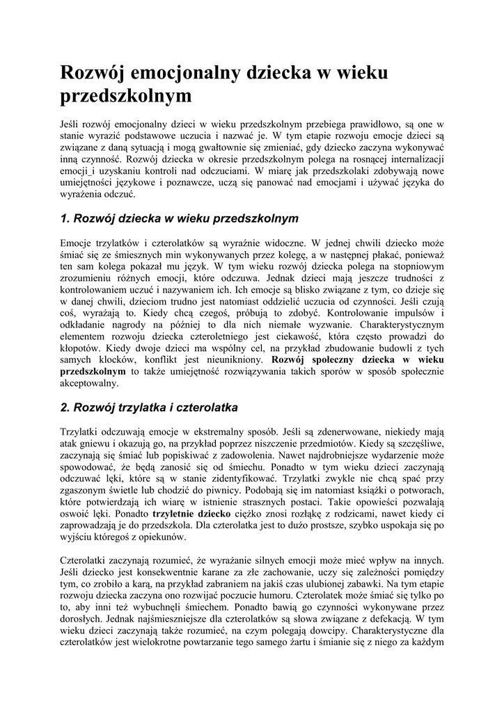 Rozwój emocjonalny dziecka w wieku przedszkolnym Jeśli rozwój emocjonalny dzieci w wieku przedszkolnym przebiega prawidłowo, są one w stanie wyrazić podstawowe uczucia i nazwać je. W tym etapie rozwoju emocje dzieci są związane z daną sytuacją i mogą gwałtownie się zmieniać, gdy dziecko zaczyna wykonywać inną czynność. Rozwój dziecka w okresie przedszkolnym polega na rosnącej internalizacji emocji i uzyskaniu kontroli nad odczuciami. W miarę jak przedszkolaki zdobywają nowe umiejętności językowe i poznawcze, uczą się panować nad emocjami i używać języka do wyrażenia odczuć. 1. Rozwój dziecka w wieku przedszkolnym Emocje trzylatków i czterolatków są wyraźnie widoczne. W jednej chwili dziecko może śmiać się ze śmiesznych min wykonywanych przez kolegę, a w następnej płakać, ponieważ ten sam kolega pokazał mu język. W tym wieku rozwój dziecka polega na stopniowym zrozumieniu różnych emocji, które odczuwa. Jednak dzieci mają jeszcze trudności z kontrolowaniem uczuć i nazywaniem ich. Ich emocje są blisko związane z tym, co dzieje się w danej chwili, dzieciom trudno jest natomiast oddzielić uczucia od czynności. Jeśli czują coś, wyrażają to. Kiedy chcą czegoś, próbują to zdobyć. Kontrolowanie impulsów i odkładanie nagrody na później to dla nich niemałe wyzwanie. Charakterystycznym elementem rozwoju dziecka czteroletniego jest ciekawość, która często prowadzi do kłopotów. Kiedy dwoje dzieci ma wspólny cel, na przykład zbudowanie budowli z tych samych klocków, konflikt jest nieunikniony. Rozwój społeczny dziecka w wieku przedszkolnym to także umiejętność rozwiązywania takich sporów w sposób społecznie akceptowalny. 2. Rozwój trzylatka i czterolatka Trzylatki odczuwają emocje w ekstremalny sposób. Jeśli są zdenerwowane, niekiedy mają atak gniewu i okazują go, na przykład poprzez niszczenie przedmiotów. Kiedy są szczęśliwe, zaczynają się śmiać lub popiskiwać z zadowolenia. Nawet najdrobniejsze wydarzenie może spowodować, że będą zanosić się od śmiechu. Ponadto w tym wieku dzieci zaczynają odczuwać lęki, które są w stanie zidentyfikować. Trzylatki zwykle nie chcą spać przy zgaszonym świetle lub chodzić do piwnicy. Podobają się im natomiast książki o potworach, które potwierdzają ich wiarę w istnienie strasznych postaci. Takie opowieści pozwalają oswoić lęki. Ponadto trzyletnie dziecko ciężko znosi rozłąkę z rodzicami, nawet kiedy ci zaprowadzają je do przedszkola. Dla czterolatka jest to dużo prostsze, szybko uspokaja się po wyjściu któregoś z opiekunów. Czterolatki zaczynają rozumieć, że wyrażanie silnych emocji może mieć wpływ na innych. Jeśli dziecko jest konsekwentnie karane za złe zachowanie, uczy się zależności pomiędzy tym, co zrobiło a karą, na przykład zabraniem na jakiś czas ulubionej zabawki. Na tym etapie rozwoju dziecka zaczyna ono rozwijać poczucie humoru. Czterolatek może śmiać się tylko po to, aby inni też wybuchnęli śmiechem. Ponadto bawią go czynności wykonywane przez dorosłych. Jednak najśmieszniejsze dla czterolatków są słowa związane z defekacją. W tym wieku dzieci zaczynają także rozumieć, na czym polegają dowcipy. Charakterystyczne dla czterolatków jest wielokrotne powtarzanie tego samego żartu i śmianie się z niego za każdym razem. Jeśli chodzi o lęki, dzieci zaczynają rozumieć różnicę pomiędzy rzeczywistością a bajkami lub snami. Rozwój dziecka w wieku przedszkolnym to także dostrzeganie, że inne osoby także doświadczają emocji. Zaczyna pojawiać się wówczas empatia i zrozumienie cudzych uczuć. 3. Rozwój dziecka pięcioletniego Rozwój dziecka w okresie przedszkolnym na etapie piątego roku życia charakteryzuje się początkami kontroli nad emocjami i nazywaniem ich. Ponadto pięciolatki stopniowo oddzielają uczucia od czynności, co pozwala im wyrażać emocje w sposób, który jest społecznie akceptowalny. Typowa dla dzieci w tym wieku jest umiejętność czekania na swoją kolej, także podczas rozmowy. Poza tym pięciolatki przyswajają sobie zachowania, na które jest przyzwolenie społeczne. Jeśli chcą coś dostać, proszą o to, zamiast brać bez pytania. Także ich wrodzona ciekawość jest nieco utemperowana, podobnie jak agresja fizyczna i wybuchy gniewu. Pięciolatki lepiej radzą sobie ze słownym wyrażaniem emocji, co często prowadzi do tak zwanego „przezywania” kolegów, których nie lubią. Ponadto dzieci w tym wieku znają większą liczbę uczuć i są w stanie je nazwać. Rozwój dziecka w wieku przedszkolnym jest niezwykle interesujący. Dzieci stopniowo uczą się radzić sobie z emocjami i kontrolować je. Jeśli rozwój dziecka w okresie przedszkolnym przebiega prawidłowo, łatwiej jest mu odnaleźć się w rzeczywistości szkolnej, a następnie w dorosłym życiu.