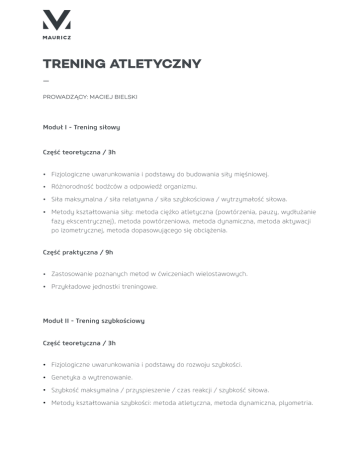 TRENING ATLETYCZNY _ PROWADZĄCY: MACIEJ BIELSKI Moduł I - Trening siłowy Część teoretyczna / 3h • Fizjologiczne uwarunkowania i podstawy do budowania siły mięśniowej. • Różnorodność bodźców a odpowiedź organizmu. • Siła maksymalna / siła relatywna / siła szybkościowa / wytrzymałość siłowa. • Metody kształtowania siły: metoda ciężko atletyczna (powtórzenia, pauzy, wydłużanie fazy ekscentrycznej), metoda powtórzeniowa, metoda dynamiczna, metoda aktywacji po izometrycznej, metoda dopasowującego się obciążenia. Część praktyczna / 9h • Zastosowanie poznanych metod w ćwiczeniach wielostawowych. • Przykładowe jednostki treningowe. Moduł II - Trening szybkościowy Część teoretyczna / 3h • Fizjologiczne uwarunkowania i podstawy do rozwoju szybkości. • Genetyka a wytrenowanie. • Szybkość maksymalna / przyspieszenie / czas reakcji / szybkość siłowa. • Metody kształtowania szybkości: metoda atletyczna, metoda dynamiczna, plyometria. Część praktyczna / 9h • Mechanika kroku biegowego (praca ramion, synchronizacja, elementy kroku biegowego, skipy, przebieżki, sprint). • Plyometria (skoki, rzuty, reaktywność). • Przykładowe jednostki treningowe. Moduł III - Trening mocy Część teoretyczna / 3h • Fizjologiczne uwarunkowania i podstawy do rozwoju mocy. • Siła jako podstawa / szybkość jako niezbędnik. • Moc – zastosowanie. Część praktyczna / 9h • Trening transferowy. • Aktywacja post izometryczna. • Przykładowe jednostki treningowe Moduł IV - Trening kondycyjny Część teoretyczna / 3h • Fizjologiczne uwarunkowania i podstawy do rozwoju obydwu szlaków metabolicznych. • Metabolizm tlenowy – podstawa. • Metabolizm beztlenowy – super silnik. • Wydolność jako baza do poprawy innych wyników. • Metody kształtowania: Interwał (intensywny / ekstensywny), ciągła, powtórzeniowa. Część praktyczna / 9h • Trening kondycyjny w warunkach plenerowych a zamknięty obiekt. • Interwał – złoty środek. • Niekonwencjonalne metody kształtowania wydolności. • Przykładowe jednostki treningowe. Moduł V – Hipertrofia funkcjonalna Część teoretyczna / 3h • Fizjologiczne uwarunkowania i podstawy rozwoju masy mięśniowej. • Przekrój poprzeczny a gęstość mięśnia. • Rodzaje włókien a odpowiedź na bodziec. • Metody kształtowania: hipertrofia indukowana uszkodzeniami mięśniowymi, hipertrofia indukowana przez hipoksje. Część praktyczna / 9h • Ćwiczenia wielostawowe. • Ćwiczenia gimnastyczne. • Ćwiczenia nietypowe. • Przykładowe jednostki treningowe.