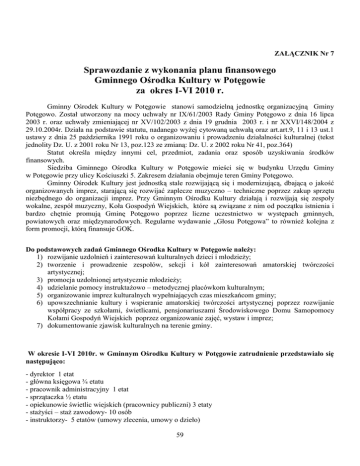 ZAŁĄCZNIK Nr 7 Sprawozdanie z wykonania planu finansowego Gminnego Ośrodka Kultury w Potęgowie za okres I-VI 2010 r. Gminny Ośrodek Kultury w Potęgowie stanowi samodzielną jednostkę organizacyjną Gminy Potęgowo. Został utworzony na mocy uchwały nr IX/61/2003 Rady Gminy Potęgowo z dnia 16 lipca 2003 r. oraz uchwały zmieniającej nr XV/102/2003 z dnia 19 grudnia 2003 r. i nr XXVI/148/2004 z 29.10.2004r. Działa na podstawie statutu, nadanego wyżej cytowaną uchwałą oraz art.art.9, 11 i 13 ust.1 ustawy z dnia 25 października 1991 roku o organizowaniu i prowadzeniu działalności kulturalnej (tekst jednolity Dz. U. z 2001 roku Nr 13, poz.123 ze zmianą: Dz. U. z 2002 roku Nr 41, poz.364) Statut określa między innymi cel, przedmiot, zadania oraz sposób uzyskiwania środków finansowych. Siedziba Gminnego Ośrodka Kultury w Potęgowie mieści się w budynku Urzędu Gminy w Potęgowie przy ulicy Kościuszki 5. Zakresem działania obejmuje teren Gminy Potęgowo. Gminny Ośrodek Kultury jest jednostką stale rozwijającą się i modernizującą, dbającą o jakość organizowanych imprez, starającą się rozwijać zaplecze muzyczno – techniczne poprzez zakup sprzętu niezbędnego do organizacji imprez. Przy Gminnym Ośrodku Kultury działają i rozwijają się zespoły wokalne, zespół muzyczny, Koła Gospodyń Wiejskich, które są związane z nim od początku istnienia i bardzo chętnie promują Gminę Potęgowo poprzez liczne uczestnictwo w występach gminnych, powiatowych oraz międzynarodowych. Regularne wydawanie „Głosu Potęgowa” to również kolejna z form promocji, którą finansuje GOK. Do podstawowych zadań Gminnego Ośrodka Kultury w Potęgowie należy: 1) rozwijanie uzdolnień i zainteresowań kulturalnych dzieci i młodzieży; 2) tworzenie i prowadzenie zespołów, sekcji i kół zainteresowań amatorskiej twórczości artystycznej; 3) promocja uzdolnionej artystycznie młodzieży; 4) udzielanie pomocy instruktażowo – metodycznej placówkom kulturalnym; 5) organizowanie imprez kulturalnych wypełniających czas mieszkańcom gminy; 6) upowszechnianie kultury i wspieranie amatorskiej twórczości artystycznej poprzez rozwijanie współpracy ze szkołami, świetlicami, pensjonariuszami Środowiskowego Domu Samopomocy Kołami Gospodyń Wiejskich poprzez organizowanie zajęć, wystaw i imprez; 7) dokumentowanie zjawisk kulturalnych na terenie gminy. W okresie I-VI 2010r. w Gminnym Ośrodku Kultury w Potęgowie zatrudnienie przedstawiało się następująco: - dyrektor 1 etat - główna księgowa ¾ etatu - pracownik administracyjny 1 etat - sprzątaczka ½ etatu - opiekunowie świetlic wiejskich (pracownicy publiczni) 3 etaty - stażyści – staż zawodowy- 10 osób - instruktorzy- 5 etatów (umowy zlecenia, umowy o dzieło) 59 Hale sportowe W okresie I-VI 2010 r. GOK w Potęgowie udostępniał mieszkańcom gminy sale sportową w Potęgowie na bezpłatne zajęcia popołudniowe. Odbywały się tam zajęcia sportowe a także były organizowane imprezy okolicznościowe. Koszty związane z zatrudnieniem osoby sprzątającej i nadzorującej, z opłatami za zużyty prąd, wodę, odprowadzone ścieki, zużyte środki czystości oraz naprawy drobnych awarii zaistniałych podczas użytkowania, poniesione były z budżetu GOK w podanym okresie. Świetlice GOK Gminny Ośrodek Kultury w Potęgowie w okresie I-VI 2010 r. nadzorował 10 świetlic wiejskich, znajdujących się w następujących miejscowościach: Rzechcino, Żochowo, Czerwieniec, Wieliszewo, Głuszynko, Malczkowo, Grąbkowo, Dąbrówno, Nowa Dąbrowa, Łupawa. Gminny Ośrodek Kultury musiał zabezpieczyć środki finansowe na utrzymanie w/w obiektów. Poniósł koszty związane z: - opłatą za energię elektryczną, - ubezpieczeniem świetlic, - opłatą za wodę i ścieki, - wywozem nieczystości, - aktualizacją książek obiektów, - zakupem opału, - zakupem materiałów plastycznych i środków czystości, - a ponadto wykonane były drobne remonty i naprawy wynikające z całorocznego użytkowania obiektów. Zespoły, koła zainteresowań, Koła Gospodyń Wiejskich. W ramach stałych form pracy GOK prowadzone były zajęcia muzyczne dla zespołów wokalnych „Potęgowianki”, „Wiśta-Wio”, „Chanter”, „Trio”, zespołu instrumentalnego „Jazz Team” oraz solistów, którym GOK zapewnia pomoc instruktażowo-metodyczną. Koło Gospodyń Wiejskich „Dolina Łupawy” w Łupawie, Koło Gospodyń Wiejskich w Żochowie oraz Klub Seniora w Potęgowie w pierwszej połowie 2010 r. chętnie uczestniczyli w przedsięwzięciach GOK- u promując działalność kulturalną gminy. „Głos Potęgowa” wydany został 3 razy w ciągu pierwszego półrocza 2010 r. po 1000 sztuk nakład. 60 IMPREZY GMINNEGO OŚRODKA KULTURY W POTĘGOWIE OD STYCZNIA DO CZERWCA 2010r. (w tym konkursy) Realizując zadania statutowe w Gminnym Ośrodku Kultury w Potęgowie okresie I-VI 2010r. zorganizowano następujące imprezy kulturalne i konkursy: Lp. Termin imprezy Nazwa imprezy 1. 2. 3. 10.01.2010r 22.01.- 6.02.2010r. 22.01.2010r 4. 23.01.2010r. 5. 24.01.2010r. 6. 30.01.2010r. 7. 31.01.2010r. 8. 5.02.2010r. 9. 6.02.2010r. 10. 11. 12. 13. 14. 15. 16. 17. 18. 19. 29.01.2010r 13.02.2010r 26.02.2010r 27.02.2010r. 27.02.2010r. 06.03.2010r. 01.04.2009r. 24.04.2010r 01.05.2010r 08.05.2010r.15.05.2010r.15.05.2010r.29.05.2010r XVIII Finał WOŚP. Karnawał z GOK-iem- cykl imprez w świetlicach wiejskich Gry, zabawy, dyskoteka, karaoke dla dzieci i młodzieży w świetlicy w Wieliszewie Gry, zabawy, dyskoteka, karaoke dla dzieci i młodzieży w świetlicy w Łupawie Gry, zabawy, dyskoteka, karaoke dla dzieci i młodzieży w świetlicy w Grąbkowie Gry, zabawy, dyskoteka, karaoke dla dzieci i młodzieży w świetlicy w Żochowie Gry, zabawy, dyskoteka, karaoke dla dzieci i młodzieży w świetlicy w Dąbrównie Gry, zabawy, dyskoteka, karaoke dla dzieci i młodzieży w świetlicy w Głuszynku Gry, zabawy, dyskoteka, karaoke dl