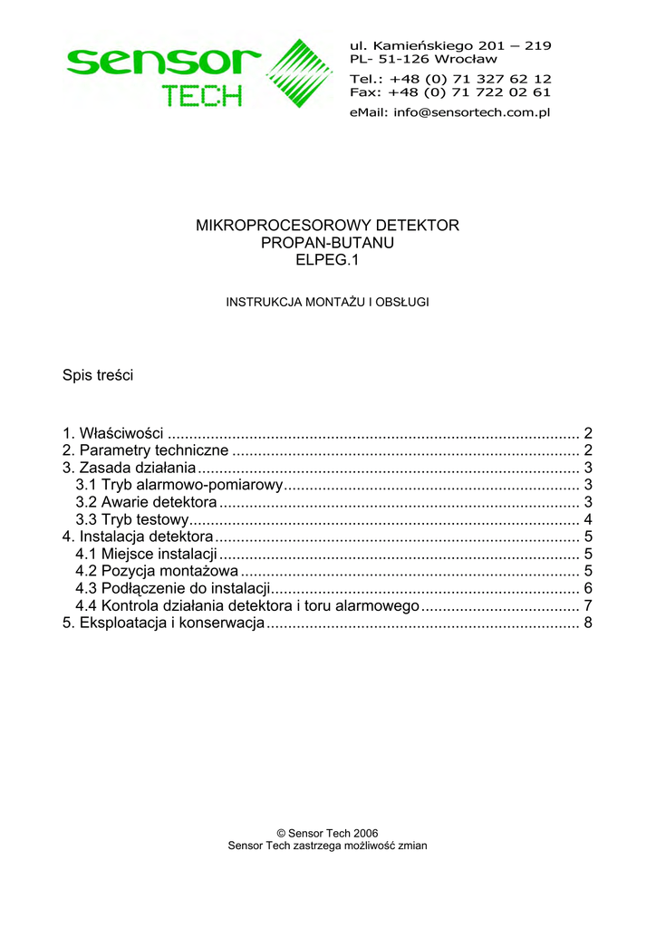 ul. Kamieńskiego 201 – 219 PL- 51-126 Wrocław Tel.: +48 (0) 71 327 62 12 Fax: +48 (0) 71 722 02 61 eMail: [email protected] MIKROPROCESOROWY DETEKTOR PROPAN-BUTANU ELPEG.1 INSTRUKCJA MONTAŻU I OBSŁUGI Spis treści 1. Właściwości ................................................................................................ 2 2. Parametry techniczne ................................................................................. 2 3. Zasada działania......................................................................................... 3 3.1 Tryb alarmowo-pomiarowy..................................................................... 3 3.2 Awarie detektora .................................................................................... 3 3.3 Tryb testowy........................................................................................... 4 4. Instalacja detektora..................................................................................... 5 4.1 Miejsce instalacji .................................................................................... 5 4.2 Pozycja montażowa ............................................................................... 5 4.3 Podłączenie do instalacji........................................................................ 6 4.4 Kontrola działania detektora i toru alarmowego ..................................... 7 5. Eksploatacja i konserwacja ......................................................................... 8 © Sensor Tech 2006 Sensor Tech zastrzega możliwość zmian 1. Właściwości Detektory serii ELPEG.1 są nowoczesnymi, mikroprocesorowymi urządzeniami detekcyjnymi, przeznaczonymi do wykrywania obecności propan-butanu (LPG) w powietrzu, w obiektach użyteczności publicznej, a w szczególności w garażach zamkniętych. Obecność propan-butanu w powietrzu wykrywana jest za pomocą specjalnej konstrukcji czujnika elektrochemicznego. Połączenie dobrej jakości czujnika i techniki mikroprocesorowej, umożliwiającej m.in. wprowadzenie układu kompensacji temperaturowej, skutkuje wysoką odpornością na czynniki środowiskowe, takie jak: temperatura, wilgotność czy obecność gazów zakłócających. Produkt dedykowany jest do sterowania wentylacją w parkingach i garażach podziemnych (wersja z zasilaniem 230VAC) lub za pośrednictwem dodatkowych centralek alarmowych (wersja z zasilaniem 12VAC/DC). Detektor posiada dwa niezależnie progi alarmowe: “ALARM 1” oraz “ALARM 2” kalibrowane na etapie produkcji zgodnie z obowiązującym rozporządzeniem Ministra Gospodarki i Pracy oraz w oparciu o obowiązujące normy. Układ dodatkowo wyposażony jest w przekaźnik alarmowy “AWARIA” informujący o uszkodzeniu lub braku zasilania detektora. Dodatkowe cechy eksploatacyjne urządzenia to: – funkcja wezwania użytkownika do powtórnej kalibracji detektora, – prosta powtórna kalibracja detektora przez wymianę płytki głowicy czujnika – skrócenie czasu kalibracji, – układ skompensowany termicznie - odporny na zmienne warunki pracy, – estetyczna obudowa z tworzywa sztucznego, – ochrona przeciwwłamaniowa – detekcja otwarcia obudowy (opcja), – piętrowe, podwójne złącza umożliwiające proste łączenie urządzeń w system “od detektora do detektora”, – przycisk “TEST” kontrolujący poprawność montażu urządzenia w systemie wentylacyjno-alarmowym. 2. Parametry techniczne 1 Napięcie zasilania 230VAC (-15%, +10%) / 10-18 VDC / 8-13VAC 2 Pobór mocy 4VA 3 Rodzaj czujnika elektrochemiczny 4 Mierzone gazy wybuchowe Propan-butan (LPG), metan (LNG) 5 Jednostka pomiarowa % DGW 5 Zakres pomiarowy 0 – 30% DGW 6 Gazy zakłócające pracę Wodór 7 Progi alarmowe “ALARM 1” , “ALARM 2” 8 Okres powtórnej kalibracji 36 miesięcy optyczna, diodami LED: 9 Sygnalizacja alarmowa “ALARM 1”,”ALARM 2”- diody czerwone; “AWARIA”- diody żółta stykowe SPDT, przełączne, niezależne dla każdego z alarmów: “AWARIA” 10 Wyjścia sygnałów alarmowych “ALARM 1” ”ALARM 2” Tabela 1 Strona 2 z 8 3. Zasada działania Rys. 1. Panel czołowy urządzenia. Rys. 2. Widok po zdjęciu pokrywy, pozycja montażowa detektora. Sygnał wyjściowy detektora stanowią trzy przekaźniki alarmowe o obciążalności: 5A: AWARIA, ALARM 1 i ALARM 2. sygnalizujące awarię lub przekroczenie progów alarmowego stężenia LPG. Stany alarmowe sygnalizowane są optycznie za pomocą diod LED na płycie czołowej urządzenia. 3.1 Tryb alarmowo-pomiarowy Po podłączeniu detektora do napięcia zasilającego układ przez 30 sekund wygrzewa czujnik – sygnalizuje to migająca z częstotliwością co 1 sekundę żółta dioda LED “AWARIA”. W czasie wygrzewania ignorowane są wszelkie alarmy pochodzące od pomiaru stężenia propan-butanu. Po wygrzaniu czujnika układ przechodzi w tryb alarmowo-pomiarowy. UWAGA! Pełną sprawność pomiarową detektor uzyskuje po około 72 godzinach nieprzerwanego zasilania. Przejście układu w tryb alarmowy następuje po przekroczeniu skalibrowanego stężenia progowego propan-butanu. Pełną sekwencję alarmową od momentu osiągnięcia stężenia progowego propan-butanu opisuje tabela: 1. Aktywacja alarmu 2. Przewietrzanie dioda „ALARM” świeci światłem ciągłym tak długo, jak długo stężenie LPG utrzymuje się powyżej progu alarmowego, załączony styk przekaźnika COM-NO dioda „ALARM” świeci światłem ciągłym w czasie 30 sek. (zwłoka zapobiegająca niestabilnej pracy wentylacji), załączony styk przekaźnika COM-NO Tabela 2 W przypadku ponownego przekroczenia stężenia progowego następuje powrót do fazy alarmowej. Cykl alarmowy dla progu drugiego przebiega analogicznie, jak przy pierwszym progu. Oba cykle alarmowe działają niezależnie od siebie wg scenariusza ujętego w tabeli. 3.2 Awarie detektora W czasie pracy detektora cyklicznie dokonywana jest autokontrola układu celem wychwycenia nieprawidłowości w działaniu. Stany