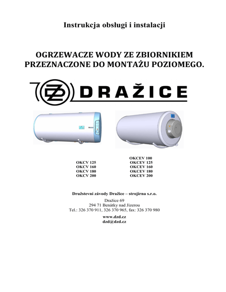 Instrukcja obsługi i instalacji OGRZEWACZE WODY ZE ZBIORNIKIEM PRZEZNACZONE DO MONTAŻU POZIOMEGO. OKCEV 100 OKCEV 125 OKCEV 160 OKCEV 180 OKCEV 200 OKCV 125 OKCV 160 OKCV 180 OKCV 200 Družstevní závody Dražice – strojírna s.r.o. Dražice 69 294 71 Benátky nad Jizerou Tel.: 326 370 911, 326 370 965, fax: 326 370 980 www.dzd.cz [email protected] Przed instalacją ogrzewacza należy uważnie przeczytać niniejszą instrukcję! Szanowny kliencie, Spółdzielcze Zakłady Dražice-strojírna Sp. z o.o. dziękują Ci za decyzję korzystania z produktu naszej marki. Producent zastrzega sobie prawo do technicznej zmiany produktu. Produkt przeznaczony jest do stałego kontaktu z pitną wodą. Spis treści instrukcji 1. 2. 3. 4. 5. 6. 7. 8. 9. 10. 11. 12. 13. 14. 15. 16. Opis funkcji . . . . . . Informacje dla użytkownika . . . . . Opis techniczny . . . . . . Czynność robocza . . . . . . Obsługa . . . . . . . Montaż na ścianie . . . . . . Instalacja wodociągowa. . . . . . Podłączenie kombinowanego ogrzewacza do systemu grzewczego. Instalacja elektryczna . . . . . . Uruchomienie ogrzewacza . . . . . Czyszczenie ogrzewacza i wymiana pręta anodowego. . . Ważne ostrzeżenia . . . . . . Przepisy pożarowe . . . . . . Przepisy instalacyjne . . . . . . Najczęstsze usterki funkcji i ich przyczyny . . . Akcesoria produktu. . . . . . . Tabelka danych technicznych . . . . . Rysunki . . . . . . . . . . . . . . . . . . . . . . . . . 2 3 3 3 4 5 5 5 6 6 6 6 7 7 8 8 9 10 Rodzaj otoczenia: Zalecamy używać produktu we wnętrzach o temperaturze powietrza +2 do 45 °C i wilgotności względnej powietrza maks. 80%. 1. OPIS FUNKCJI Ogrzewacz jest przeznaczony do tzw. akumulacyjnego ogrzewania wody użytkowej przy użyciu energii elektrycznej albo też cieplnej za pośrednictwem wymiennika (tylko w przypadku wykonania kombinowanego). Wodę ogrzewa grzałka elektryczna (albo wymiennik ciepła) w emaliowanym odizolowanym cieplnie zbiorniku w czasie określonym przez dostawcę energii elektrycznej. Grzałka jest w trakcie ogrzewania kontrolowana przez termostat, na którym można płynnie ustawić wymaganą temperaturę (w rozpięciu 5 do 80°C). Po osiągnięciu ustawionej temperatury ogrzewanie zostaje automatycznie przerwane. Do zużycia jest później wykorzystywana woda nagromadzona w zbiorniku. W zbiorniku panuje nieustannie ciśnienie z rozrządu wodociągowego. W przypadku otworzonego wentyla ciepłej wody baterii mieszającej woda wycieka z ogrzewacza wypychana przez ciśnienie zimnej wody z rozrządu wodociągowego. Ciepła woda wycieka przez górną część a wciekająca woda pozostaje w dolnej części ogrzewacza. Zasada ciśnienia umożliwia pobór wody w dowolnym miejscu od ogrzewacza (rys. 1 ). 2. INFORMACJE DLA UŻYTKOWNIKA Zużycie ciepłej wody Zużycie ciepłej wody w gospodarstwie domowym jest zależne od ilości osób, ilości wyposażenia sanitarnego, długości, średnicy i izolacji instalacji wodociągowej w mieszkaniu lub domu oraz od indywidualnych przyzwyczajeń użytkowników. Najtańszym sposobem ogrzewania wody jest jej ogrzewanie w czasie obniżonej taryfy energii elektrycznej. Proszę stwierdzić, w jakich odstępach czasowych dostawca energii oferuje Państwu obniżoną taryfę i na tej podstawie proszę wybrać adekwatną objętość i pobór mocy ogrzewacza, aby zapas ciepłej wody pokrył zużycie Państwa domu. 2 Oszczędzanie energii Zbiornik ciepłej wody użytkowej jest izolowany przy użyciu jakościowej poliuretanowej pianki bez freonów. Temperaturę na termostacie należy nastawić tylko na takim poziomie, który jest koniecznie potrzebny dla codziennego funkcjonowania gospodarstwa domowego. W ten sposób obniżą Państwo zużycie energii elektrycznej, ilość wapiennych osadów na ścianach zbiornika oraz na wnęce grzałki elektrycznej. Zużycie energii elektrycznej w trybie oczekiwania Także w przypadku, że ze zbiornika nie jest pobierana ogrzana woda, dochodzi do pewnej niewielkiej straty ciepła. Strata ta jest mierzona przez 24 godziny przy temperaturze 65°C w ogrzewaczu i 20°C w jego otoczeniu. Obliczona wartość podawana jest w kWh/24h i oznacza ilość energii potrzebną do utrzymania ustawionej temperatury. Karta informacyjna zgodnie z obwieszcz. 442/2004 Dz.U. i aneksu nr 7 Typy ogrzewaczy OKCV 100 OKCV 125 OKCV 160 OKCV 180 OKCV 200 3. ; ; ; ; ; k lasa energe tyczna OKCEV 100 OKCEV 125 OKCEV 160 OKCEV 180 OKCEV 200 C C C C B straty ciepła obję tość Wh/24h/ l znam ionowa (l) 100 125 152 180 200 8.8 8.7 8.7 7.7 7 czas ogrze wania obj. (godz.) zużycie el. na ogrzew. zawart. z 15oC na 65oC v kWh straty c iepła k Wh/24h 3 3.8 5 5 5.5 6 7.5 9.5 10.6 12 0.88 1.09 1.33 1.39 1.4 OPIS TECHNICZNY Zbiornik ogrzewacza jest wyprodukowany ze stalowej blachy i testowany przy użyciu nadciśnienia 0,9 MPa. Wnętrze naczynia jest emaliowane. Wnętrze zbiornika jest emaliowane. Do dolnego dna zbiornika przyspawany jest kołnierz, do którego przyśrubowane jest wieko kołnierza. Między wieko kołnierza a kołnierz włożony jest pierścień uszczelniający. W wieku kołnierza są wnęki do umieszczenia grzałki oraz czujników termostatu regulacyjnego i zabezpieczającego. Na gwincie M8 zamontowany jest pręt anodowy. Zbiornik wody jest izolowany przy użyciu twardej pianki poliuretanowej. Instalacja elektryczna jest umieszczona pod plastikową zdejmowaną pokrywą. Temperaturę wody można ustawić przy pomocy termostatu. W przypadku ogrzewaczy kombinowanych w zbiorniku ciśnieniowym został przyspawany wymiennik ciepła. Wymiennik ten jest przeznaczony tylko dla obiegu grzewczego. 4. CZYNNOŚĆ ROBOCZA a) ogrzewanie wody użytkowej przez energię elektryczną Po podłączeniu ogrzewacza do sieci elektrycznej grzałka ogrzewa wodę. Wyłączanie i włączanie grzałki reguluje termostat. Po osiągnięciu ustawionej temperatury termostat odłączy prąd elektryczny, przez co przerwie ogrzewanie wody. Dioda kontrolna sygnalizuje działającą grzałk