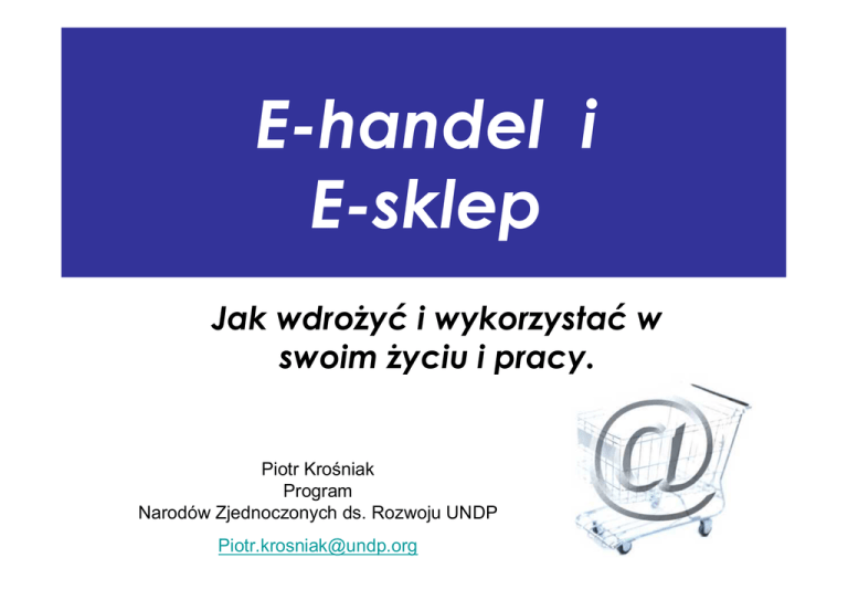 E-handel i E-sklep Jak wdroŜyć i wykorzystać w swoim Ŝyciu i pracy. Piotr Krośniak Program Narodów Zjednoczonych ds. Rozwoju UNDP [email protected] Plan warsztatu Handel elektroniczny – co to jest, jak moŜna zastosować w swoim Ŝyciu i pracy, ile osób i co kupuje w sklepach internetowych. Jakie są uwarunkowania prawne i podatkowe. Sklep Internetowy- jak załoŜyć i prowadzić sklep internetowy. Jakie narzędzie do tego wykorzystać co trzeba wiedzieć na początku. E-handel i E-sklep - Jak wdroŜyć i wykorzystać w swoim Ŝyciu i pracy ☺ Sklep z produktami ekologicznymi E-handel i E-sklep - Jak wdroŜyć i wykorzystać w swoim Ŝyciu i pracy ☺ Internet jako medium Handel elektroniczny (e-commerce), to rozmaite procedury wykorzystujące środki i urządzenia elektroniczne (telefon, faks, Internet, telewizję) w celu zawarcia transakcji finansowej. Najbardziej popularną metodą handlu elektronicznego jest handel internetowy, gdzie występują transakcje handlowe pomiędzy sprzedającymi a kupującymi. Najbardziej powszechną formą handlu elektronicznego są sklepy internetowe. (Wikipedia) E-handel i E-sklep - Jak wdroŜyć i wykorzystać w swoim Ŝyciu i pracy ☺ Handel elektroniczny moŜna podzielić na O charakterze bezpośrednim -cała transakcja odbywa się wyłącznie poprzez sieć, od zamówienia poprzez płatność do dostawy (np. muzyka, filmy, oprogramowanie). O charakterze pośrednim -gdy część transakcji odbywa się za pomocą sieci, a część drogą tradycyjną (np. zamówienie jest złoŜone przez sieć, natomiast dostawa odbywa się poprzez kuriera). E-handel i E-sklep - Jak wdroŜyć i wykorzystać w swoim Ŝyciu i pracy ☺ E- handel to nie tylko sklep internetowy aukcje internetowe sklepy internetowe serwisy usługowe (www.e-prawnik.pl, www.tlumaczenia.pl) dostarczanie własnych produktów do istniejących sklepów serwisy ogłoszeniowe (www.gratka.pl) telepraca w tym przypadku „towarem” jest nasza praca serwisy nic nie sprzedające, utrzymujące się wyłącznie z reklam (np. Gadu-Gadu) gry online serwisy informacyjne, pobierające opłaty za dostęp do informacji (www.reuters.pl) inne, które mają status sklepów internetowych, ale sprzedające nietypowe usługi – np. pisanie listów miłosnych. Przygotowano na podstawie E-HANDEL, Marcin Mastykarz, Fundacja Wspomagania Wsi 2004) E-handel i E-sklep - Jak wdroŜyć i wykorzystać w swoim Ŝyciu i pracy ☺ Sklep z rękodziełem E-handel i E-sklep - Jak wdroŜyć i wykorzystać w swoim Ŝyciu i pracy ☺ E-handel w liczbach Od 2005 r. liczba internautów, którzy dokonali kiedykolwiek zakupu w internecie, wzrosła o blisko jedna trzecia, z 41 proc. do 55 proc. (Badania Gemius) E-handel i E-sklep - Jak wdroŜyć i wykorzystać w swoim Ŝyciu i pracy ☺ Co kupujemy w sklepach interentowych Największym zainteresowa niem cieszą się księgarnie internetowe (24,99 proc.). Potem sklepy wielobranŜo we (17,20 proc.), i sklepy specjalistycz ne (17,14 proc.). E-handel i E-sklep - Jak wdroŜyć i wykorzystać w swoim Ŝyciu i pracy ☺ www.sklep.sprawiedliwyhandel.pl E-handel i E-sklep - Jak wdroŜyć i wykorzystać w swoim Ŝyciu i pracy ☺ Prawo i podatki w e-handlu Prowadzenie działalności handlowej w Internecie jest zwyczajnym prowadzeniem działalności gospodarczej i podlega takim samym prawom, jak działalność zwykłych sklepów. Nawet jeŜeli nasza działalność odbywa się na aukcjach Internetowych, ale jest działalnością gospodarczą, naleŜy odprowadzać podatki, uiszczać opłaty. Przygotowano na podstawie E-HANDEL, Marcin Mastykarz, Fundacja Wspomagania Wsi 2004 E-handel i E-sklep - Jak wdroŜyć i wykorzystać w swoim Ŝyciu i pracy ☺ Co kiedy sprzedajemy na aukcjach internetowych ? Nie zapłacisz podatku, ani dochodowego, ani od czynności cywilnoprawnych, jeŜeli: sprzedałeś rzecz uŜywaną ponad 6 miesięcy, na aukcji internetowej. Nie masz teŜ wtedy obowiązku doliczania dochodu do rocznego PIT-u. E-handel i E-sklep - Jak wdroŜyć i wykorzystać w swoim Ŝyciu i pracy ☺ Podsumowanie I części Czym jest e-handel Ile osób Kupuje w Internecie Jakie produkty najlepiej się sprzedają w Internecie Czy sprzedając w Internecie trzeba płacić podatki Zapraszam na II cześć po przerwie ☺ E-handel i E-sklep - Jak wdroŜyć i wykorzystać w swoim Ŝyciu i pracy ☺ E-handel i E- sklep cześć II Jak wdroŜyć i wykorzystać w swoim Ŝyciu i pracy. Piotr Krośniak [email protected] Jak zacząć prowadzić własny sklep internetowy ? Co jest nam potrzebne do rozpoczęcia działalności Co będziemy sprzedawać Jak zdobędziemy i utrzymamy klientów W jaki sposób będziemy prowadzić wysyłkę W co będziemy pakować produkty W jaki sposób będą przekazywane pieniądze E-handel i E-sklep - Jak wdroŜyć i wykorzystać w swoim Ŝyciu i pracy ☺ Co jest nam potrzebne do rozpoczęcia działalności Serwer, na którym zamieszczona zostanie witryna sklepu oraz domenę np. www.wiejskierarytasy.pl System który obsługuje sklep (koszyk produktów, dokonywania płatności i obsługi klienta Procedurę realizacji zamówień i wysyłki przedmiotów. No i oczywiście dobry produkt ! E-handel i E-sklep - Jak wdroŜyć i wykorzystać w swoim Ŝyciu i pracy ☺ Co będziemy sprzedawać Propozycje Rezerwacja miejsc w gospodarstwach agroturystycznych Produkty ekologiczne – miód, soki, warzywa i inne Rękodzieło i sztukę ludową SprzedaŜ swoich produktów do innych sklepów internetowych i platform branŜowych E-handel i E-sklep - Jak wdroŜyć i wykorzystać w swoim Ŝyciu i pracy ☺ Jak zdobędziemy i utrzymamy klientów Jak zdobyć klienta Pozycjonowanie Wyszukiwarka Reklama tradycyjna Współpraca z serwisem tematycznym Banery Dodatkowo Porównywarka cen E-handel i E-sklep - Jak wdroŜyć i wykorzystać w swoim Ŝyciu i pracy ☺ Jak zdobędziemy i utrzymamy klientów Jak utrzymać klienta? Newslettery Promocje Rabaty dla stałych klientów śyczenia na urodziny i święta 