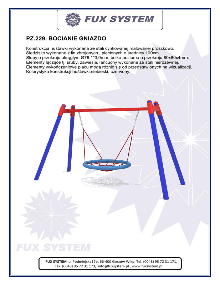 PZ.229. BOCIANIE GNIAZDO Konstrukcja huśtawki wykonana ze stali cynkowanej malowanej proszkowo. Siedzisko wykonane z lin zbrojonych , plecionych o średnicy 100cm. Słupy o przekroju okrągłym Ø76,1*3,0mm, belka pozioma o przekroju 80x80x4mm. Elementy łączące tj. śruby, zawiesia, łańcuchy wykonane ze stali nierdzewnej. Elementy wykończeniowe placu mogą różnić się od przedstawionych na wizualizacji. Kolorystyka konstrukcji huśtawki:niebieski, czerwony. FUX SYSTEM ul.Podmiejska17b, 66-400 Gorzów Wlkp. Tel. (0048) 95 72 31 171, Fax. (0048) 95 72 31 173, [email protected] , www.fuxsystem.pl Dane techniczne: długość: 401 cm, szerokość: 172 cm, wysokość: 250 cm, wysokość swobodnego upadku: 125 cm, strefa upadku: 401x720cm. normy bezpieczeństwa PN-EN 1176-1; PN-EN 1176-2, Materiały: elementy metalowe ze stali potrójnie zabezpieczonej antykorozyjnie poprzez cynkowanie ogniowe, chromianowanie i malowanie proszkowe powłoką poliestrową zapewniające dużą odporność na działanie warunków atmosferycznych, odbarwienia w promieniach UV, siedzisko huśtawki wykonane z lin polipropylenowych na oplocie stalowym, łańcuch stalowy ocynkowany ogniowo o średnicy Ø6 mm, o oczku posiadającym wewnętrzny wymiar w jednej osi nie większy niż 8 mm, zgodnie z PN-EN 1176, zakończenie słupów wykonane z tworzywa. Zabezpieczenia: stal cynkowana, chromianowana i malowana proszkowo powłoką poliestrową. śruby ze stali nierdzewnej. FUX SYSTEM ul.Podmiejska17b, 66-400 Gorzów Wlkp. Tel. (0048) 95 72 31 171, Fax. (0048) 95 72 31 173, [email protected] , www.fuxsystem.pl