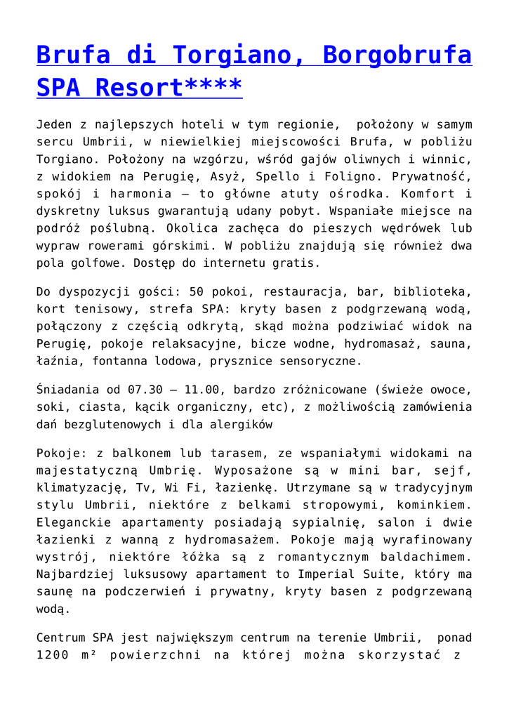Brufa di Torgiano, Borgobrufa SPA Resort**** Jeden z najlepszych hoteli w tym regionie, położony w samym sercu Umbrii, w niewielkiej miejscowości Brufa, w pobliżu Torgiano. Położony na wzgórzu, wśród gajów oliwnych i winnic, z widokiem na Perugię, Asyż, Spello i Foligno. Prywatność, spokój i harmonia – to główne atuty ośrodka. Komfort i dyskretny luksus gwarantują udany pobyt. Wspaniałe miejsce na podróż poślubną. Okolica zachęca do pieszych wędrówek lub wypraw rowerami górskimi. W pobliżu znajdują się również dwa pola golfowe. Dostęp do internetu gratis. Do dyspozycji gości: 50 pokoi, restauracja, bar, biblioteka, kort tenisowy, strefa SPA: kryty basen z podgrzewaną wodą, połączony z częścią odkrytą, skąd można podziwiać widok na Perugię, pokoje relaksacyjne, bicze wodne, hydromasaż, sauna, łaźnia, fontanna lodowa, prysznice sensoryczne. Śniadania od 07.30 – 11.00, bardzo zróżnicowane (świeże owoce, soki, ciasta, kącik organiczny, etc), z możliwością zamówienia dań bezglutenowych i dla alergików Pokoje: z balkonem lub tarasem, ze wspaniałymi widokami na majestatyczną Umbrię. Wyposażone są w mini bar, sejf, klimatyzację, Tv, Wi Fi, łazienkę. Utrzymane są w tradycyjnym stylu Umbrii, niektóre z belkami stropowymi, kominkiem. Eleganckie apartamenty posiadają sypialnię, salon i dwie łazienki z wanną z hydromasażem. Pokoje mają wyrafinowany wystrój, niektóre łóżka są z romantycznym baldachimem. Najbardziej luksusowy apartament to Imperial Suite, który ma saunę na podczerwień i prywatny, kryty basen z podgrzewaną wodą. Centrum SPA jest największym centrum na terenie Umbrii, ponad 1200 m² powierzchni na której można skorzystać z indywidualnych zabiegów, na bazie naturalnych, wysokiej jakości produktów, które wytwarzane są na miejscu, tj. oliwa, wino czy czekolada. Goście mogą skorzystać z bogatej oferty Spa, istnieją specjalne pakiety dla par. 07/01-17/04 22/04-03/05 01/01-06/01 04/05-07/08 08/08-30/08 18/04-21/04 31/08-04/12 20/12-28/12 05/12-07/12 08/12-19/12 03/01-06/01 29/12-02/01 Pokój 2 os classic, niedziela-czwartek 494 644 644 644 644 644 Dopłata do kolacji a la carte 99 174 174 Dziecko na dostawce 0-3 lata 100 100 100 Pokój 2 osobowy, classic, piątek-sobota Cena w PLN obejmuje: pobyt osoby w pokoju 2 osobowym, typu classic, śniadanie typu bufet, wejście do centrum wellness, kryty basen podgrzewany, basen zewnętrzny, łaźnię fińską, biosaunę, łaźnęa turecką, hydromasaże, pokój fitness, strefę relaksu, szlafrok, ręczniki i klapki, kort tenisowy, Uwaga: */ dopłata do kolacji koszt przy rezerwacji */ dziecko 3-16 lat na dostawce, zniżka 50% */dostawka dla os pow 16 lat zniżka 20% Castiglione del Lago, Dom Aba (6+2 os) Willa, zbudowana z kamienia, należy do kompleksu domów wakacyjnych, Villa Marty i Villa Susanna, każda z własnym ogrodem i basenem. Kompleks położony na granicy Toskanii i Umbrii, w pobliżu starożytnych, etruskich miast Cortona i Arezzo, gdzie znajdują się arcydzieła namalowane przez Piero della Francesca. Można odwiedzić stąd średniowieczne miasteczka Montepulciano, Pienzę i Lucignano, wybrać się nad Jezioro Trasimeno czy do Perugii. Posiadłość oddalona jest ok 4 km od miejscowości Castiglion del Lago, gdzie znajduje się imponujący zamek oraz liczne sklepy i restauracje. Wokół willi jest duży ogród z basenem (wymiary 5×10 m, głębokość 1,50 m), z meblami ogrodowymi i grillem, placem zabaw dla dzieci, stołem do tenisa stołowego Powierzchnia 120 m2. PARTER 2 sypialnie, 1 pokój z rozkładaną kanapą 2-os 3 łazienki pokój dzienny z jadalnią z aneksem kuchennym i kominkiem weranda wyposażona w stół i krzesła PIĘTRO: pokój dwuosobowy z łazienką z prysznicem i małym tarasem 19/04-26/04 04/01-19/04 31/05-05/07 26/04-31/05 05/07-30/08 30/08-27/09 27/09-20/12 20/12-03/01 4000 5500 9000 Cena w PLN obejmuje: wynajęcie domu na tydzień, od soboty do soboty, opłaty za wodę, gaz i prąd. Cena nie obejmuje: taksy klimatycznej (płatnej na miejscu). Kaucja zwrotna 200 Euro. Uwaga: Basen czynny jest od 26/04 do 04/10. Zwierzęta domowe są dozwolone za opłatą 30 Euro/tydzień. Na zapytanie ręczniki kąpielowe wypożyczenie opłata 3 Euro/sztuka. Orvieto, Dom Casabassa (10 os) Stary dom wiejski, odrestaurowany z zachowaniem oryginalnych elementów, o powierzchni 220 m 2, położony ok 5 km od Orvieto. Położony na niewielkim wzgórzu, w samym sercu Umbrii, z pięknym widokiem na wzgórza pokryte winnicami, gajami oliwnymi i polami pszenicy – jest prawdziwą oazą spokoju. Basen ( o wymiarach 4 x 8 m, głębokość 1,20-1,80 ) znajduje się w dużym ogrodzie pełnym kwiatów. Powierzchnia 220 m2 (10 osób) 5 sypialni (1 na parterze, 4 na piętrze) 3 łazienki ( w tym 1 na parterze przystosowana dla niepełnosprawnych) na parterze: pokój dzienny z jadalnią i aneksem kuchennym w pełni wyposażonym na piętrze: pokój dzienny z kominkiem, kuchnia, jadalnia Wyposażenie: kuchenka mikrofalowa, żelazko i deska do prasowania, zamrażarka, pralka, zmywarka, Tv Sat, kuchenka, radio z CD, ekspres do kawy, czajnik, mikser, odkurzacz . 19/04-26/04 31/05-05/07 26/04-31/05 05/07-30/08 30/08-27/09 27/09-20/12 20/12-03/01 04/01-19/04 6000 7750 11250 Cena w PLN obejmuje: wynajęcie domu na tydzień, od soboty do soboty, opłaty za wodę, gaz i prąd. Cena nie obejmuje: taksy klimatycznej (płatnej na miejscu). Kaucja zwrotna 200 Euro. Uwaga: Basen otwarty od 26/04 do 27/09. Zwierzęta domowe są akceptowane za opłatą 30 Euro/tydzień. Ręczniki kąpielowe dostępne na życzenie, bezpłatnie. Castiglione del Lago, Dom la Pineta (18 + 2 os) Willa położona wśród zielonych wzgórz, otoczony gajem piniowym, 3 km od Castiglione del Lago i jeziora Trasimeno, 40 km od Perugii. Do dyspozycji jest basen (o wymiarach 12 x 6 m), kort tenisowy, plac zabaw dla dzieci, stół do tenisa, oraz miejsce do spożywania posiłków z mebla
