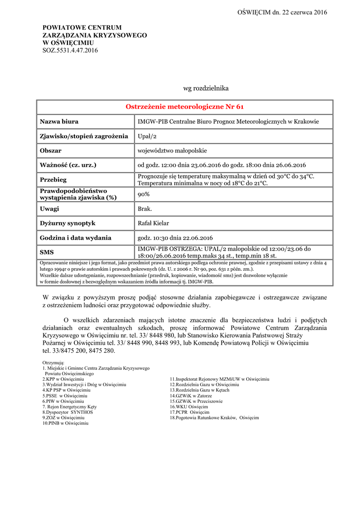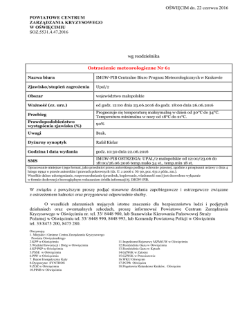 OŚWIĘCIM dn. 22 czerwca 2016 POWIATOWE CENTRUM ZARZĄDZANIA KRYZYSOWEGO W OŚWIĘCIMIU SOZ.5531.4.47.2016 wg rozdzielnika Ostrzeżenie meteorologiczne Nr 61 Nazwa biura IMGW-PIB Centralne Biuro Prognoz Meteorologicznych w Krakowie Zjawisko/stopień zagrożenia Upał/2 Obszar województwo małopolskie Ważność (cz. urz.) od godz. 12:00 dnia 23.06.2016 do godz. 18:00 dnia 26.06.2016 Przebieg Prognozuje się temperaturę maksymalną w dzień od 30°C do 34°C. Temperatura minimalna w nocy od 18°C do 21°C. Prawdopodobieństwo wystąpienia zjawiska (%) 90% Uwagi Brak. Dyżurny synoptyk Rafał Kielar Godzina i data wydania godz. 10:30 dnia 22.06.2016 SMS IMGW-PIB OSTRZEGA: UPAL/2 malopolskie od 12:00/23.06 do 18:00/26.06.2016 temp.maks 34 st., temp.min 18 st. Opracowanie niniejsze i jego format, jako przedmiot prawa autorskiego podlega ochronie prawnej, zgodnie z przepisami ustawy z dnia 4 lutego 1994r o prawie autorskim i prawach pokrewnych (dz. U. z 2006 r. Nr 90, poz. 631 z późn. zm.). Wszelkie dalsze udostępnianie, rozpowszechnianie (przedruk, kopiowanie, wiadomość sms) jest dozwolone wyłącznie w formie dosłownej z bezwzględnym wskazaniem źródła informacji tj. IMGW-PIB. W związku z powyższym proszę podjąć stosowne działania zapobiegawcze i ostrzegawcze związane z ostrzeżeniem ludności oraz przygotować odpowiednie służby. O wszelkich zdarzeniach mających istotne znaczenie dla bezpieczeństwa ludzi i podjętych działaniach oraz ewentualnych szkodach, proszę informować Powiatowe Centrum Zarządzania Kryzysowego w Oświęcimiu nr. tel. 33/ 8448 980, lub Stanowisko Kierowania Państwowej Straży Pożarnej w Oświęcimiu tel. 33/ 8448 990, 8448 993, lub Komendę Powiatową Policji w Oświęcimiu tel. 33/8475 200, 8475 280. Otrzymują: 1. Miejskie i Gminne Centra Zarządzania Kryzysowego Powiatu Oświęcimskiego 2.KPP w Oświęcimiu 3.Wydział Inwestycji i Dróg w Oświęcimiu 4.KP PSP w Oświęcimiu 5.PSSE w Oświęcimiu 6.PIW w Oświęcimiu 7. Rejon Energetyczny Kęty 8.Dyspozytor SYNTHOS 9.ZOZ w Oświęcimiu 10.PINB w Oświęcimiu 11.Inspektorat Rejonowy MZMiUW w Oświęcimiu 12.Rozdzielnia Gazu w Oświęcimiu 13.Rozdzielnia Gazu w Kętach 14.GZWiK w Zatorze 15.GZWiK w Przeciszowie 16.WKU Oświęcim 17.PCPR Oświęcim 18.Pogotowia Ratunkowe Kraków, Oświęcim
