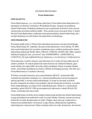 STUDIUM PRZYPADKU Firma Budowlana OPIS KLIENTA Firma Budowlana sp. z o.o. jest firmą-córką firmy Firma Budowlana Bratysława SA , operującej na obszarze Centralnej i Wschodniej Europie. Zajmuje się produkcją chemii budowlanej. Produktem podstawowym są domieszki do betonu, które zresztą zainicjowały powstanie polskiej spółki. Wraz gwałtownym rozwojem firmy w latach 90-tych Firma Budowlana zwiększała asortyment produkcji chemii budowlanej, jak i zaczęła ekspansję na rynki krajów dawnego bloku wschodniego. OPIS PROBLEMU Powstanie spółki-córki w Polsce było naturalnym procesem rozwoju terytorialnego Firmy Budowlanej SA. Jednakże, decyzja ta była spóźniona o dwie dekady. W 2008 roku rynek budowlany był szczelnie wypełniony przez wielkich producentów chemii budowlanej (takich jak BASF, SIKA, GRACE, CHRYSO, MAPEI, MC, HB) i małych lokalnymi będącymi tam „od zawsze” (np. ANDROIMPEX, ADMITEKS czy LUBANTA). Do tego nadchodził kryzys finansowy, a za nim kryzys w budownictwie. Doświadczenia z rynków małych, typu Słowacja czy Czechy nie były adekwatne do realiów polskich. W małych państwach żaden koncern nie zbudował fabryki, gdyż rynek lokalny nie zapewniłby zbytu dla całości produkcji. Zatem wszystkie lokalne marki, prowadzące produkcję na miejscu zdobyły dominującą pozycję. Tak stało się z Firmą Budowlaną w Czechach i Słowacji. W Polsce wszystkie koncerny, poza amerykańskim GRACE i niemieckim HB, wybudowały potrzebne instalacje i to z mocami produkcyjnymi przewyższającymi obecną sprzedaż, w hossie rynku budowlanego. Z uwagi na stosunek wysokich kosztów transportu do niskiej ceny produktu, jak jest domieszka do betonu, wszystkie firmy nieprodukujące na miejscu były niekonkurencyjne. Widać to w statystykach sprzedaży, gdzie GRACE i HB, po początkowych sukcesach w latach 90-tych XX wieku, systematycznie tracą rynek. Firma Budowlana zwróciła się do małego miejscowego producenta chemii budowlanej za jego pośrednictwem próbowała wejść na rynek lokalny. Niestety cena przywożonej domieszki nie była akceptowalna na rynku. Podjęto zatem decyzję o połączeniu z miejscowym producentem i inwestycji w jego obecny zakład (pomoc kapitałowa, technologiczna i maszynowa). Mimo szerokiej oferty nie tylko domieszek, ale również chemii budowlanej do zapraw, preparatów impregnujących do drewna itp., nadal nie doszło do zwiększenia udziału w rynku. ROZWIĄZANIE W 2009 roku zostałem zatrudniony jako Dyrektor Zarządzający i Prokurent. W ten sposób dano mi możliwość istotnego wpływania na wszystkie decyzje zarządu i jednocześnie ich egzekucję w codziennej pracy firmy. Przez pierwszy rok pracy, poza uporządkowaniem podstawowych spraw w firmie, przyglądałem się funkcjonowaniu rynku budowlanego i uczyłem specyfiki produkcji chemii budowlanej. Rok 2010, po niezbędnych korektach pracy firmy, był już rokiem na plusie. Zdawałem sobie jednakże sprawę, że przy gwałtownym spadku potencjału rynku budowlanego w następnych latach, nie będziemy mieli szans. Postanowiłem więc wdrożyć nowe struktury, w jakich Firma Budowlana miała szansę odnosić największe sukcesy. Tak, jak w książce Ala Riesa, na nowe motto wybraliśmy: „Koncentruj się”. W myśl tej idei zrezygnowałem z całego rynku detalicznego pozyskanego przez wejście Firmy Budowlanej w firmę lokalnego przedsiębiorcy. Skoncentrowałem całe siły i środki na tym, co firma robiła najlepiej, czyli na produktach do betonu towarowego. Zadałem sobie podstawowe pytanie dla każdej firmy: dlaczego klient miałby kupić nasze produkty? Wiedziałem, że musimy zbudować przewagę rynkową, bo inaczej staniemy się jednym z wielu nierozpoznawalnych producentów wszystkiego. Chemia budowlana jest pojęciem niezwykle ogólnym, gdzie w grę wchodzą setki tysięcy produktów i tysiące producentów. Zdałem sobie sprawę, że nie mogę konkurować z wielkimi koncernami na wszystkich możliwych frontach. Firma Budowlana nie miała ani takiego potencjału finansowego, ani marketingowego czy technologicznego. Co było jej mocną stroną, to doskonała kadra w laboratorium betonu i dwadzieścia parę lat doświadczeń w produkcji najbardziej zaawansowanych technologicznie domieszek do betonu, tzw. polimerów. Postawiłem zatem na produkcje bardzo innowacyjnych produktów na indywidualne zlecenia klientów. Takie „szycie na miarę” pozwalające maksymalnie optymalizować koszty. Wykorzystując posiadaną technologie, laboratorium i świetnych technologów, zaczęliśmy więc nie tyle produkować, co świadczyć usługę rozwiązywania technologicznych problemów klienta. Podejmując taką decyzję, ryzykowaliśmy bardzo dużo. Naszymi odbiorcami byli wtedy bowiem głównie klienci detaliczni (wykres 1). 2000 sprzedaż detaliczna sprzedaż domieszek 1500 1000 500 0 Wykres 1: Sprzedaż Firmy Budowlanej w 2010 roku Świadomie zrezygnowałem z 80% sprzedaży firmy i skoncentrowałem się na niewielkiej w owym czasie sprzedaży domieszek. Rozbudowałem dział technologii betonu w Laboratorium i od podstaw zbudowałem zespół handlowy o specjalistycznych kompetencjach. Zbudowanie zespołu handlowego, samo w sobie jest już trudnym zadaniem, a zbudowanie zespołu składającego się z inżynierów ze specjalizacją chemii w betonie zajmuje zazwyczaj lata. Nie mogliśmy także posłużyć się działającymi na rynku technologami, na stawki których nie było nas stać. Musieliśmy zatem zwerbować młodych inżynierów, najczęściej po AGH, którzy mieli zainteresowania chemiczne, a następnie przeszkolić ich zarówno w technologii betonu, jak i kompetencjach handlowych. W szybkim czasie wykształciliśmy doskonałych technologów, gotowych na kontakt bezpośredni z klientem i rozwiązywanie jego problemów bezpośrednio na węźle betoniarskim, jak i laboratorium. Na efekty nie trzeba było długo czekać. 10000 7500 5000 2500 0 Całkowita sprzedaż w 2010