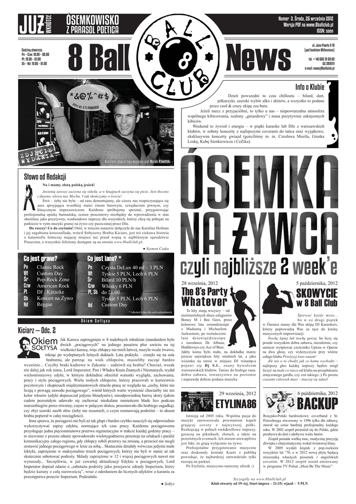WKRÓTCE Numer 3. Środa, 26 września 2012 Wersja PDF na www.8ballclub.pl ISSN: soon Z PARASOL POETICA ul. Jana Pawła II 10 (pod bankiem Millennium) Godziny otwarcia: Pn – Czw: 18.00 – 00.00 Pt: 19.00 – 01:00 Sb – Nd: 19.00 – 01.00 tel. + 48 666 19 69 69 GG 3810111 e-mail: [email protected] Info o Klubie *&@%^#$ p at Dzień powszedni to czas chilloutu – bilard, dart, piłkarzyki, szeroki wybór alko i drinów, a wszystko to podane przez cool & crazy ekipę zza baru. Jeżeli mecz z przyjaciółmi, to tylko u nas – niepowtarzalna atmosfera wspólnego kibicowania, szalony „gniazdowy” i masa pozytywnie zakręconych kibiców. Weekend to żywioł i energia – w piątki karaoke lub DJe z warszawskich klubów, w soboty koncerty z najlepszymi coverami do tańca oraz wyjątkowe, ekskluzywne koncerty gwiazd (gościliśmy m. in. Czesława Mozila, Gienka Loskę, Kubę Sienkiewicza i CeZika). r z str . 2 EL KO N KU R S O Słowo od Redakcji No i mamy złotą polską jesień! Jesienią zawsze zaczyna się szkoła, a w knajpach zaczyna się picie. Jest tłoczno i duszno, olewa nas Mycha. I tak skończymy o świcie! Świt – żeby nie było – od razu dementujemy, ale cieszy nas rozpoczynająca się aura sprzyjająca wszelkiej maści ćmom barowym, szwędaczom piwnym, czy klasycznym imprezowiczom. Każdemu spróbujemy sprostać, przygotowując profesjonalną opiekę barmańską, zestaw procentowy niezbędny do wprowadzenia w stan określany jako pozytywny, weekendowe imprezy dla wszystkich, którzy chcą się pobujać na parkiecie w rytm muzyki granej na żywo czy puszczanej przez DJa. Do rzeczy! Co do czytania! Otóż, w trzecim numerze dołączyła do nas Karolina Hofman i jej zagubiona kotoszuflada, wrócił Sołtysowy Hrabia Kiciarz, jest też ciekawa historia o katastrofie lotniczej mającej miejsce tuż przed wojną w najbliższym sąsiedztwie Piaseczna, a wszystkie felietony dostępne są na stronie www.8ballclub.pl. ● Szymon Czaka Co jest grane? Pn Wt Śr Czw Pt Sb Nd Classic Rock Custom Day Pop-Rock Zone American Rock DJ / Karaoke Koncert na Żywo Reggae Co jest lane? * Pn Wt Śr Czw Pt, Sb Nd Czysta DeLux 40 ml – 3 PLN Tyskie 5 PLN, Lech 6 PLN Bilard 10 PLN/h Whisky 6 PLN do 21:00 Tyskie 5 PLN, Lech 6 PLN Custom Day * Alkohol tylko dla osób pełnoletnich Okiem Sołtysa Kiciarz — Odc. 2 Jak Karoca zaprzęgnięta w 8 nadobnych młodzian (standardem było dwóch „pociągowych” na jednego pasażera plus sześciu na tej wielkości karocę, więc chłopcy nie mieli łatwo), ruszyła wcale żwawo, mknąc po wydeptanych leśnych duktach. Lata praktyki – cisnęło się na usta hrabiemu, ale patrząc na wiek chłopców, musieliby zacząć bardzo wcześnie... Czyżby braki kadrowe w Zakonie – zadziwił się hrabia? Chociaż, wszak nie dalej jak rok temu, Lord Imperator, Pan i Władca Krain Znanych i Nieznanych, wydał wielostronicowy edykt, w którym dokładnie określał warunki wyglądu, zachowania, pracy i stylu pociągowych. Wielu rosłych chłopców, którzy pracowali w kurierstwie pocztowym i ekspresach międzymiastowych straciło pracę ze względu na „cechy, które nie licują z powagą zawodu pociągowego”, wśród których warto wymienić chociażby nie ten kolor włosów (edykt dopuszczał jedynie blondynów), nieodpowiednią barwę skóry (jakim cudem pozostałym udawało się zachować nieskalane rumieńcem blade lico podczas marszobiegów przez równiny, często w palącym słońcu, pozostawało dla hrabiego zagadką), czy zbyt szeroki zasób słów (żeby nie rozumieli, o czym rozmawiają podróżni – to akurat hrabia popierał w całej rozciągłości). Inna sprawa, że pociągowi nie byli aż tak głupi i bardzo szybko nauczyli się odpowiednio wykorzystywać zapisy edyktu, normujące ich czas pracy. Każdemu pociągowemu przysługuje jedna pięciominutowa przerwa regeneracyjna w trakcie każdej godziny pracy – to niewinne z pozoru zdanie spowodowało wielotygodniowe przestoje na szlakach i paraliż komunikacyjny całego regionu, gdy chłopcy robili przerwy na zmianę, a przecież nie mogli zostawić jednego pociągowego w lesie za sobą... Skutecznie działały wówczas jedynie małe lektyki, zaprzężone w maksymalnie trzech pociągowych, którzy nie byli w stanie aż tak skutecznie sabotować podroży. Składy zaprzężone w 12 i więcej pociągowych nawet nie wyruszały... Szczęśliwie, w już czwartej aktualizacji Edyktu o pociągowych, Lord Imperator dopisał zdanie o „sabotażu podróży jako przejawie zdrady Imperium, który będzie karany z całą surowością”, wraz z odesłaniem do licznych edyktów o karaniu za przestępstwa przeciw Imperium. Podziałało. ● Sołtys 28 września, 2012 5 października, 2012 Whatever w 8 Ball Club The 8’s Party SKOWYCIE Te hity znają wszyscy − od nieśmiertelnych disco szlagierów Boney M i Bee Gees, przez kolorowe lata osiemdziesiąte z Madonną i Michaelem Jacksonem, po roztańczone la ta dz ie w ię ć dz iesi ąt e z eurodance Dr. Albana, Haddawaya czy Ace of Base. Jakby komu było mało, na dokładkę mamy jeszcze największe hity ostatnich lat, a jako wisienka na torcie w miejsce DJ winamp-a pojawi się Dj S.I., znany bywalcom warszawskich klubów. Taniec do białego rana, dobra zabawa, towarzystwo na poziomie i naprawdę dobrze podana muzyka. Śpiewać każdy może... bo w co dr ugi pi ąt ek w Ósemce mamy dla Was ekipę DJ Karaokers, którzy poprowadzą Was za ręce do krainy muzycznych improwizacji. Trochę lepiej lub trochę gorzej, bo liczy się przede wszystkim dobra zabawa, niezależnie, czy umiecie wyśpiewać czyściutko Upiora w Operze na dwa głosy, czy wykrzyczycie przy wtórze całego klubu Przeżyyyj tooo saaam! Ale nie o to chodzi jak co komu wychodzi – najlepszy głos każdej imprezy będzie mógł liczyć na małe co nieco od klubu na przepłukanie zmęczonego gardła, czy coś takiego ;) Po prostu czasami człowiek musi – inaczej się udusi! 29 września, 2012 