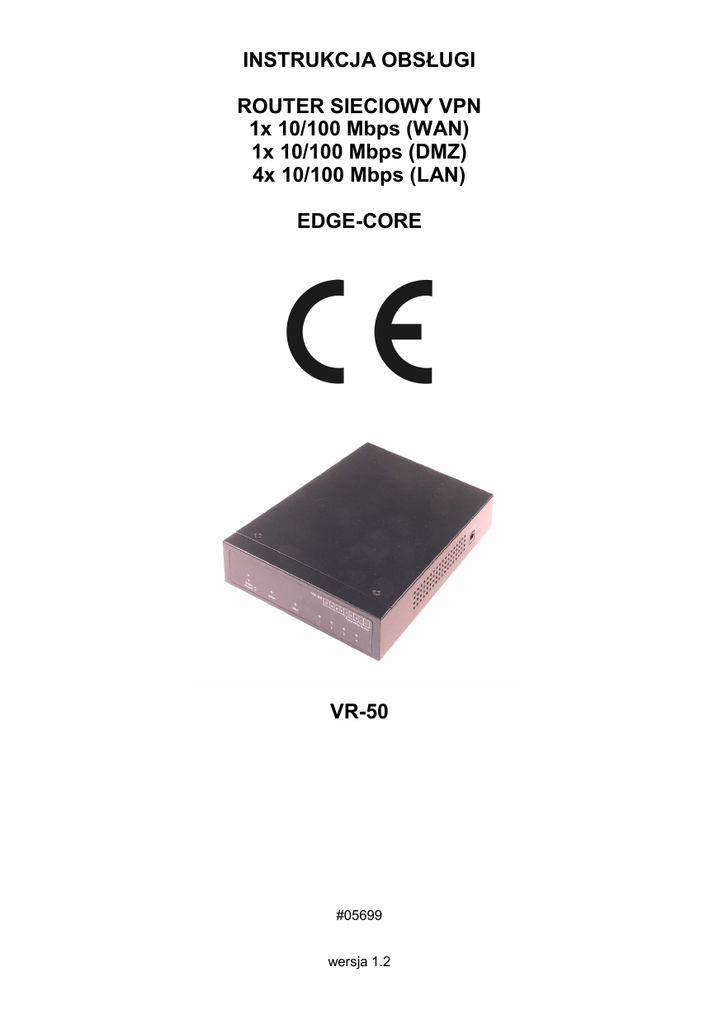 INSTRUKCJA OBSŁUGI ROUTER SIECIOWY VPN 1x 10/100 Mbps (WAN) 1x 10/100 Mbps (DMZ) 4x 10/100 Mbps (LAN) EDGE-CORE VR-50 #05699 wersja 1.2 Wstęp VR-50 jest wysokowydajnym routerem sieciowym dedykowanym dla małych i średnich sieci korporacyjnych. Zapewnia bezpieczeństwo przesyłanych danych implementując sprzętowe VPN, zaawansowany firewall, automatyczną ochronę przed atakami, DoS, NAT i odwrotny NAT. OstrzeŜenie NaleŜy zapewnić bezpieczne warunki pracy urządzenia. Dokonanie przez uŜytkownika jakichkolwiek własnych zmian w urządzeniu moŜe spowodować jego nieprawidłowe funkcjonowanie. Bezpieczeństwo uŜytkowania. Bezpieczeństwo uŜytkowania Urządzenie zostało zaprojektowane i wyprodukowane z najwyŜszą starannością o bezpieczeństwo osób instalujących i uŜytkujących. Dla zapewnienia bezpieczeństwa pracy, naleŜy stosować się do wszelkich wskazań zawartych w tej instrukcji jak i instrukcjach obsługi urządzeń towarzyszących (np. komputera PC). 1. Zawartość opakowania - router VR-50, - zasilacz sieciowy, - patch cord, - płyta CD z instrukcją obsługi w języku angielskim, - niniejsza instrukcja obsługi. Podczas dostawy naleŜy upewnić się, Ŝe opakowanie nie jest uszkodzone. W przypadku stwierdzonych uszkodzeń naleŜy niezwłocznie skontaktować się z dostawcą. Prosimy równieŜ o sprawdzenie zgodności zawartości opakowania z powyŜej zamieszczoną listą. 2. Zawartość instrukcji Instrukcja ta zawiera opis routera sieciowego VR-50 z odpowiednimi procedurami instalacji, konfiguracji i uŜytkowania. Przed przystąpieniem do instalacji urządzenia naleŜy dokładnie przeczytać całość tej instrukcji, w szczególności zaś punkty poświęcone bezpieczeństwu. 3. Zasady bezpieczeństwa Router sieciowy VR-50 jest zgodny z przepisami w zakresie bezpieczeństwa uŜytkowania urządzeń elektrycznych. - gniazdo sieciowe musi być uziemione zgodnie z obowiązującymi przepisami, - przed przeniesieniem lub wykonywaniem innych operacji technicznych urządzenie naleŜy odłączyć od zasilania, - nie stosować uszkodzonych lub zuŜytych przewodów zasilania, gdyŜ powodują one znaczne zagroŜenie dla bezpieczeństwa uŜytkownika, - prace instalacyjne muszą być wykonywane przez odpowiednio przeszkolony personel techniczny, - nie stosować urządzenia w miejscach występowania substancji łatwopalnych, - zabezpieczyć urządzenie przed dostępem dzieci lub osób niepowołanych, - upewnić się, Ŝe urządzenie zostało odpowiednio zamocowane, - urządzenie jest wyłączone dopiero po odłączeniu przewodów zasilania oraz przewodów łączących je z innymi urządzeniami, - jeśli urządzenie zostanie przeniesione z miejsca chłodnego do ciepłego, w jego wnętrzu moŜe skroplić się para wodna uniemoŜliwiając prawidłowe funkcjonowanie. NaleŜy wówczas odczekać, aŜ wilgoć odparuje. 2 4. Instalacja sprzętu 4.1. Zasilanie Router sieciowy VR-50 jest zasilany z zewnętrznego zasilacza. Zasilacz naleŜy podłączyć do sieci 230V, a następnie do routera. 4.2. Oprogramowanie Do prawidłowego oprogramowania. funkcjonowania routera nie jest wymagane instalowanie dodatkowego 4.3. Środowisko pracy Router VR-50 moŜe być montowany na ścianie lub pracować na powierzchniach poziomych, w tym przypadku nie naleŜy poddawać obudowy routera zbyt duŜym obciąŜeniom. NaleŜy zadbać, aby urządzenie umieszczone było w sposób zapewniający dobry przepływ powietrza i łatwy dostęp do portów. Powietrze powinno być wolne od zanieczyszczeń, a urządzenie nie powinno znajdować się w bezpośredniej bliskości źródeł ciepła (piece, grzejniki, bezpośrednie nasłonecznienie) bądź urządzeń generujących zakłócenia elektromagnetyczne (silniki, telewizory itp.). 4.4. Wskaźniki LED Router sieciowy VR-50 naleŜy umieścić w taki sposób, by było widać diody kontrolne umieszczone na przednim panelu urządzenia. Opis diod LED (w niektórych wersjach urządzeń nie występują wszystkie wymienione wskaźniki LED). POWER Świecenie ciągłe w kolorze zielonym oznacza włączone zasilanie. DIAG Świecenie w kolorze pomarańczowym oznacza wykonywanie testu. Dioda zgaszona oznacza, Ŝe nie wykryto błędów i router jest gotowy do pracy. DMZ Świecenie ciągłe w kolorze zielonym oznacza zestawienie prawidłowego połączenia na porcie DMZ; dioda gaśnie, gdy przez port przesyłane są dane. WAN Dioda świecąca w kolorze zielonym oznacza prawidłowe zestawienie połączenia na porcie WAN; dioda gaśnie, gdy przez port przesyłane są dane. Porty 1 .. 4 Świecenie ciągłe w kolorze zielonym oznacza zestawienie prawidłowego połączenia. Migotanie diod oznacza aktywność. Zgaszona dioda oznacza brak połączenia. 5. Instalacja okablowania Dla połączenia routera z innymi urządzeniami sieciowymi zaleca się stosowanie przyłączy odpowiednich dla typu wbudowanych weń portów. Specyfikacja przyłączy UTP: - router sieciowy obsługuje funkcje automatycznego krosowania MDI/MDI-X, z tego powodu do podłączenia elementów sieci aktywnych i pasywnych moŜna wykorzystać przyłącza krosowanie (cross-over) i niekrosowane (straight-through), - do połączenia urządzeń sieciowych do routera zaleca się wykorzystać przyłącze UTP kat. 5 lub wyŜszej, - maksymalna długość zastosowanego przyłącza UTP 100 metrów. 3 6. Praca z routerem VR-50 Po podłączeniu zasilania urządzenie przeprowadza serię standardowych samo-diagnostycznych testów. Po wpisaniu do przeglądarki internetowej adresu: 192.168.1.1 pojawi się okno logowania. Standardowa nazwa uŜytkownika i hasło brzmi „admin”. W celu zresetowania ustawień routera, naleŜy wcisnąć przycisk reset przez 4 sekundy (pomarańczowa dioda zacznie powoli migać). W celu przywrócenia ustawień fabrycznych naleŜy wcisnąć przycisk reset przez 10 sekund (pomarańczowa dioda zacznie szybko migać). Router VR-50 implementuje poniŜsze funkcjonalności: - Firewall do 100Mbps o obu kierunkach, - Fil