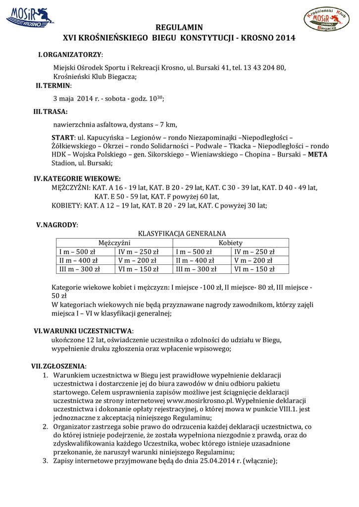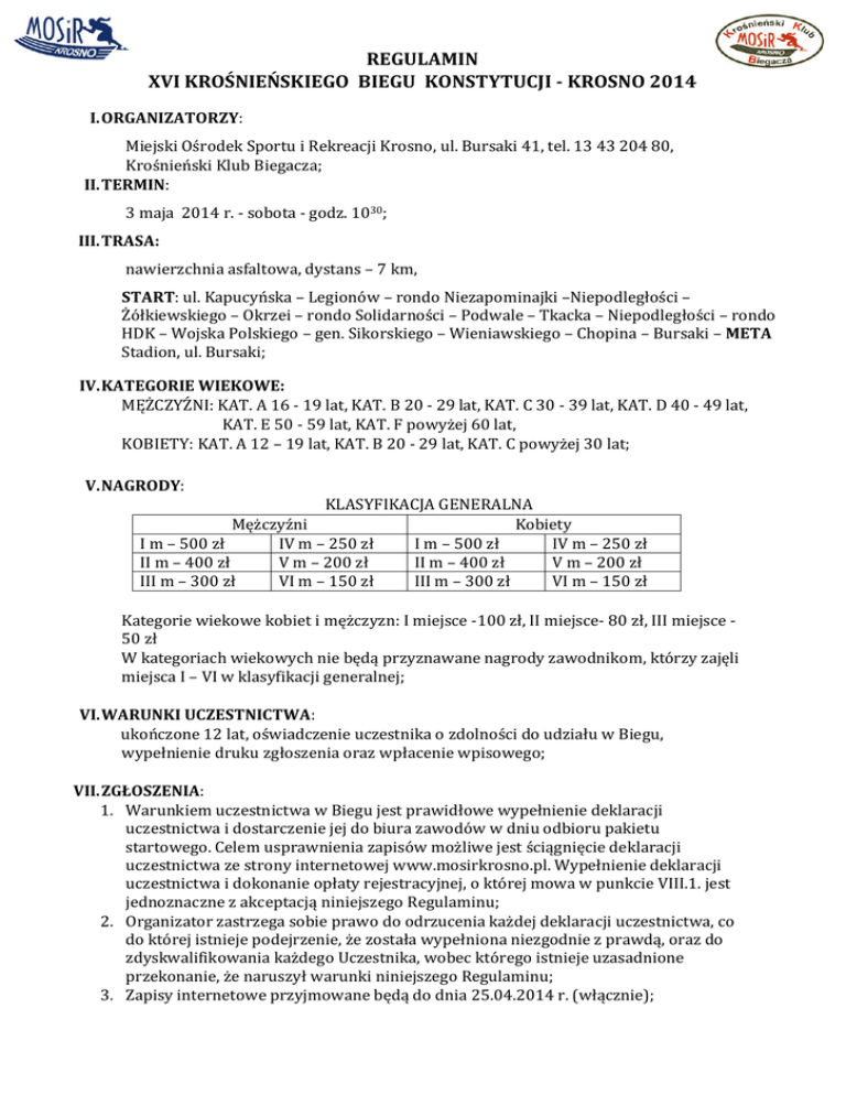 REGULAMIN XVI KROŚNIEŃSKIEGO BIEGU KONSTYTUCJI - KROSNO 2014 I. ORGANIZATORZY: Miejski Ośrodek Sportu i Rekreacji Krosno, ul. Bursaki 41, tel. 13 43 204 80, Krośnieński Klub Biegacza; II. TERMIN: 3 maja 2014 r. - sobota - godz. 1030; III. TRASA: nawierzchnia asfaltowa, dystans – 7 km, START: ul. Kapucyńska – Legionów – rondo Niezapominajki –Niepodległości – Żółkiewskiego – Okrzei – rondo Solidarności – Podwale – Tkacka – Niepodległości – rondo HDK – Wojska Polskiego – gen. Sikorskiego – Wieniawskiego – Chopina – Bursaki – META Stadion, ul. Bursaki; IV. KATEGORIE WIEKOWE: MĘŻCZYŹNI: KAT. A 16 - 19 lat, KAT. B 20 - 29 lat, KAT. C 30 - 39 lat, KAT. D 40 - 49 lat, KAT. E 50 - 59 lat, KAT. F powyżej 60 lat, KOBIETY: KAT. A 12 – 19 lat, KAT. B 20 - 29 lat, KAT. C powyżej 30 lat; V. NAGRODY: KLASYFIKACJA GENERALNA Mężczyźni Kobiety I m – 500 zł IV m – 250 zł I m – 500 zł IV m – 250 zł II m – 400 zł V m – 200 zł II m – 400 zł V m – 200 zł III m – 300 zł VI m – 150 zł III m – 300 zł VI m – 150 zł Kategorie wiekowe kobiet i mężczyzn: I miejsce -100 zł, II miejsce- 80 zł, III miejsce 50 zł W kategoriach wiekowych nie będą przyznawane nagrody zawodnikom, którzy zajęli miejsca I – VI w klasyfikacji generalnej; VI. WARUNKI UCZESTNICTWA: ukończone 12 lat, oświadczenie uczestnika o zdolności do udziału w Biegu, wypełnienie druku zgłoszenia oraz wpłacenie wpisowego; VII. ZGŁOSZENIA: 1. Warunkiem uczestnictwa w Biegu jest prawidłowe wypełnienie deklaracji uczestnictwa i dostarczenie jej do biura zawodów w dniu odbioru pakietu startowego. Celem usprawnienia zapisów możliwe jest ściągnięcie deklaracji uczestnictwa ze strony internetowej www.mosirkrosno.pl. Wypełnienie deklaracji uczestnictwa i dokonanie opłaty rejestracyjnej, o której mowa w punkcie VIII.1. jest jednoznaczne z akceptacją niniejszego Regulaminu; 2. Organizator zastrzega sobie prawo do odrzucenia każdej deklaracji uczestnictwa, co do której istnieje podejrzenie, że została wypełniona niezgodnie z prawdą, oraz do zdyskwalifikowania każdego Uczestnika, wobec którego istnieje uzasadnione przekonanie, że naruszył warunki niniejszego Regulaminu; 3. Zapisy internetowe przyjmowane będą do dnia 25.04.2014 r. (włącznie); 4. Biuro zawodów będzie mieścić się na Stadionie Lekkoatletycznym MOSiR Krosno, ul. Bursaki 41 i będzie czynne w dniu zawodów od godz. 800, zapisy przyjmowane będą do godz. 1000; 5. Uczestnicy, którzy dokonają wpłaty wpisowego drogą internetową mogą odebrać pakiety startowe w Biurze Zawodów na wydzielonym stanowisku w dniu Biegu. VIII. OPŁATY: 1. Opłata startowa za udział w Biegu wynosi: do dnia 25 kwietnia - piątek – (włącznie) -10 zł. od dnia 26 kwietnia do 3 maja – 15 zł. 2. Opłata raz uiszczona nie podlega zwrotowi. 3. Opłat można dokonywać: gotówką w Biurze Zawodów w dniu Biegu; przelewem na konto nr 15 8642 1083 2002 8306 5314 0001 w terminie 2 dni od zgłoszenia. Po przekroczeniu tego terminu zgłoszenie zostanie usunięte z bazy danych. Dyspozycja przelewu zawierać musi: imię, nazwisko i rok urodzenia uczestnika oraz dopisek „Opłata startowa XVI Bieg Konstytucji”. 4. Odbiór pakietu startowego będzie możliwy tylko i wyłącznie po okazaniu dowodu wpłaty potwierdzonego przez bank, z wyłączeniem przypadku odnotowania wpłaty na konto MOSiR i zaznaczenia tego faktu przez organizatora w internetowej liście uczestników. IX. ZASADY FINANSOWANIA: Koszty uczestnictwa w zawodach pokrywają uczestnicy we własnym zakresie, pozostałe koszty pokrywa organizator. X. POSTANOWIENIA KOŃCOWE: Uczestnicy Biegu otrzymują numer startowy, który należy przypiąć na piersiach, tak aby był widoczny. Po Biegu głównym w dniu 03.05.2014r. od godz. 1215 rozegrane będą biegi dzieci i młodzieży w następujących kategoriach: o przedszkolaki 3 - 4 lata - 80 m, o przedszkolaki 5 - 6 lat - 100 m, o dzieci kl. I - II - 250 m, o dzieci kl. III - IV 300 m, o dzieci kl. V - VI 650 m, o gimnazja 800 m, o szkoły ponadpodstawowe 1000 m; Organizator zabezpiecza: opiekę medyczną, szatnie i natryski oraz napoje i gorący posiłek. Uczestnicy biegu ubezpieczają się we własnym zakresie. Wszelkie protesty dot. klasyfikacji końcowej przyjmowane będą do 15 minut od chwili wywieszenia wyników. W dniu Biegu odbędą się również zawody Nordic Walking - szczegóły na stronie www.krosnochodzi.pl Patronat medialny: