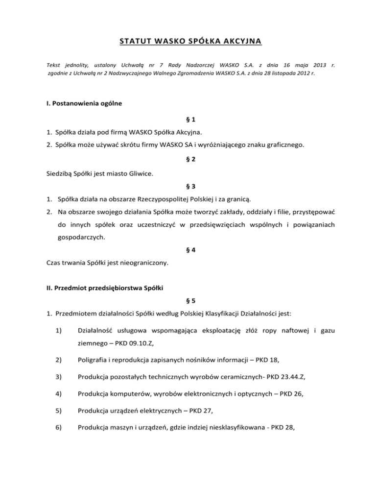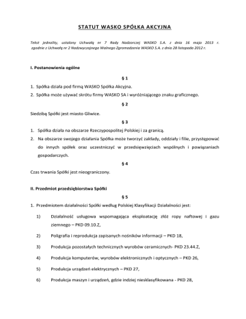 STATUT WASKO SPÓŁKA AKCYJNA Tekst jednolity, ustalony Uchwałą nr 7 Rady Nadzorczej WASKO S.A. z dnia 16 maja 2013 r. zgodnie z Uchwałą nr 2 Nadzwyczajnego Walnego Zgromadzenia WASKO S.A. z dnia 28 listopada 2012 r. I. Postanowienia ogólne §1 1. Spółka działa pod firmą WASKO Spółka Akcyjna. 2. Spółka może używać skrótu firmy WASKO SA i wyróżniającego znaku graficznego. §2 Siedzibą Spółki jest miasto Gliwice. §3 1. Spółka działa na obszarze Rzeczypospolitej Polskiej i za granicą. 2. Na obszarze swojego działania Spółka może tworzyć zakłady, oddziały i filie, przystępować do innych spółek oraz uczestniczyć w przedsięwzięciach wspólnych i powiązaniach gospodarczych. §4 Czas trwania Spółki jest nieograniczony. II. Przedmiot przedsiębiorstwa Spółki §5 1. Przedmiotem działalności Spółki według Polskiej Klasyfikacji Działalności jest: 1) Działalność usługowa wspomagająca eksploatację złóż ropy naftowej i gazu ziemnego – PKD 09.10.Z, 2) Poligrafia i reprodukcja zapisanych nośników informacji – PKD 18, 3) Produkcja pozostałych technicznych wyrobów ceramicznych- PKD 23.44.Z, 4) Produkcja komputerów, wyrobów elektronicznych i optycznych – PKD 26, 5) Produkcja urządzeń elektrycznych – PKD 27, 6) Produkcja maszyn i urządzeń, gdzie indziej niesklasyfikowana - PKD 28, 7) Produkcja wyposażenia elektrycznego i elektronicznego do pojazdów silnikowych PKD 29.31.Z, 8) Naprawa, konserwacja i instalowanie maszyn i urządzeń – PKD 33, 9) Instalowanie maszyn przemysłowych, sprzętu i wyposażenia- PKD 33.20 Z, 10) Dystrybucja energii elektrycznej – PKD 35.13.Z, 11) Handel energią elektryczną – PKD 35.14.Z, 12) Dystrybucja paliw gazowych w systemie sieciowym – PKD 35.22.Z, 13) Handel paliwami gazowymi w systemie sieciowym – PKD 35.23.Z, 14) Demontaż wyrobów zużytych – PKD 38.31.Z, 15) Roboty budowlane związane ze wznoszeniem budynków – PKD 41, 16) Roboty związane z budową obiektów inżynierii lądowej i wodnej – PKD 42, 17) Roboty budowlane specjalistyczne – PKD 43, 18) Handel hurtowy, z wyłączeniem handlu pojazdami samochodowymi – PKD 46, 19) Sprzedaż detaliczna komputerów, urządzeń peryferyjnych i oprogramowania prowadzona w wyspecjalizowanych sklepach - PKD 47.41.Z, 20) Sprzedaż detaliczna sprzętu telekomunikacyjnego prowadzona w wyspecjalizowanych sklepach - PKD 47.42.Z, 21) Sprzedaż detaliczna mebli, sprzętu oświetleniowego i pozostałych artykułów użytku domowego prowadzona w wyspecjalizowanych sklepach - PKD 47.59.Z, 22) Sprzedaż detaliczna książek prowadzona w wyspecjalizowanych sklepach - PKD 47.61.Z, 23) Sprzedaż detaliczna gazet i artykułów piśmiennych prowadzona w wyspecjalizowanych sklepach - PKD 47.62.Z, 24) Sprzedaż detaliczna artykułów używanych prowadzona w wyspecjalizowanych sklepach – PKD 47.79.Z, 25) Sprzedaż detaliczna prowadzona przez domy sprzedaży wysyłkowej lub Internet PKD 47.91.Z, 26) Pozostała sprzedaż detaliczna prowadzona poza siecią sklepową, straganami i targowiskami – PKD 47.99.Z, 27) Transport rurociągami paliw gazowych - PKD 49.50.A, 28) Transport rurociągowy pozostałych towarów - PKD 49.50.B, 29) Działalność wydawnicza - PKD 58, 30) Nadawanie programów telewizyjnych ogólnodostępnych i abonamentowych - PKD 60.20.Z, 31) Telekomunikacja - PKD 61, 32) Działalność związana z oprogramowaniem i doradztwem w zakresie informatyki oraz działalność powiązana - PKD 62, 33) Działalność usługowa w zakresie informacji - PKD 63, 34) Działalność holdingów finansowych- PKD 64.20. Z, 35) Pozostałe formy udzielania kredytów- PKD 64.92 Z, 36) Pozostała finansowa działalność usługowa, gdzie indziej niesklasyfikowana, z wyłączeniem ubezpieczeń i funduszy emerytalnych - PKD 64. 99. Z, 37) Działalność wspomagająca usługi finansowe oraz ubezpieczenia i fundusze emerytalne - PKD 66, 38) Kupno i sprzedaż nieruchomości na własny rachunek - PKD 68.10.Z, 39) Wynajem i zarządzanie nieruchomościami własnymi lub dzierżawionymi - PKD 68.20.Z, 40) Pośrednictwo w obrocie nieruchomościami - PKD 68.31.Z, 41) Działalność rachunkowo-księgowa - PKD 69.20.Z, 42) Działalność w zakresie architektury i inżynierii; badania i analizy techniczne - PKD 71, 43) Badania naukowe i prace rozwojowe w dziedzinie pozostałych nauk przyrodniczych i technicznych - PKD 72.19.Z, 44) Reklama, badanie rynku i opinii publicznej – PKD 73, 45) Pozostała działalność profesjonalna, naukowa i techniczna - PKD 74, 46) Wynajem i dzierżawa pozostałych maszyn, urządzeń oraz dóbr materialnych, gdzie indziej niesklasyfikowane - PKD 77.39.Z, 47) Dzierżawa własności intelektualnej i podobnych produktów, z wyłączeniem prac chronionych prawem autorskim - PKD 77.40.Z, 48) Działalność detektywistyczna i ochroniarska - PKD 80, 49) Pozostała działalność wspomagająca prowadzenie działalności gospodarczej, gdzie indziej niesklasyfikowana - PKD 82.99.Z, 50) Ochrona przeciwpożarowa - PKD 84.25.Z, 51) Pozaszkolne formy edukacji sportowej oraz zajęć sportowych i rekreacyjnych - PKD 85.51.Z, 2. 52) Nauka języków obcych – PKD 85.59.A, 53) Pozostałe pozaszkolne formy edukacji, gdzie indziej niesklasyfikowane - PKD 85.59.B, 54) Działalność wspomagająca edukację - PKD 85.60.Z, 55) Naprawa i konserwacja komputerów i urządzeń peryferyjnych- PKD 95.11.Z, 56) Naprawa i konserwacja sprzętu telekomunikacyjnego- PKD 95.12.Z, 57) Pozostała działalność usługowa, gdzie indziej niesklasyfikowana - PKD 96.09.Z. Wszelka działalność wymagająca zezwoleń lub koncesji prowadzona będzie po ich uzyskaniu. §6 1. Zmiana przedmiotu przedsiębiorstwa Spółki jest możliwa bez wykupu akcji od akcjonariuszy, którzy nie zgadzają się na zmianę. 2. Uchwała Walnego Zgromadzenia Akcjonariuszy podjęta w przedmiocie określonym w ust. 1 wymaga dla swej ważności większości 2/3 głosów oddanych, przy obecności akcjonariusz
