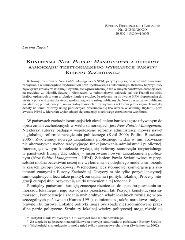 Studia Regionalne i Lokalne Nr 2(36)/2009 ISSN 1509–4995 Lucyna Rajca* Koncepcja New Public Management a reformy samorządu terytorialnego wybranych państw Europy Zachodniej Reformy inspirowane New Public Management (NPM) przyczyniły się do wprowadzenia zasad zarządzania w samorządzie terytorialnym oraz urynkowienia i outsourcingu. Reformy te przyniosły największe zmiany w Wielkiej Brytanii, ale wprowadzono je też w innych państwach europejskich, na przykład w: Irlandii, Szwecji, Niemczech, w najmniejszym zakresie zaś we Francji (spośród krajów opisanych w tym artykule). Istnieje ryzyko, że reformy inspirowane NPM doprowadzą do utraty z pola widzenia ukrytego, społecznego celu usług publicznych. Nowe zarządzanie publiczne nie stało się jednak nowym, uniwersalnym modelem zarządzania sektorem publicznym. Tematyka debaty na temat reformy usług publicznych przesunęła się (zwłaszcza w Wielkiej Brytanii) poza kwestie NPM w kierunku wyłaniającej się koncepcji sieciowego zarządzania wspólnotą. W państwach zachodnioeuropejskich określeniem bardzo często używanym do opisu zmian zachodzących w wielu samorządach jest New Public Management. Niektórzy autorzy badający współczesne reformy administracji mówią nawet o globalnej reformie zarządzania publicznego (Kettl 2000; Pollitt, Bouckaert 2005). Zwolennicy nowego zarządzania publicznego widzą w nim rozwiązanie alternatywne wobec tradycyjnego funkcjonowania administracji publicznej. Interesujące w tym kontekście wydają się reformy samorządu terytorialnego w państwach Europy Zachodniej – inspirowane nowym zarządzaniem publicznym (New Public Management – NPM). Zdaniem Pawła Swianiewicza w przyszłości można oczekiwać raczej nie wyłonienia się odrębnego modelu samorządu w krajach Europy Środkowej i Wschodniej, lecz stopniowej konwergencji z systemami znanymi z Europy Zachodniej. Dotyczy to nie tylko pozycji instytucji samorządowych, lecz także praktyk zarządzania i polityki lokalnej. Procesy integracji europejskiej przyczynią się do umocnienia tej tendencji1. Pomiędzy państwami istnieją znaczące różnice co do sposobu powstania samorządu lokalnego i jego rozwoju na przestrzeni lat. Pozycja konstytucyjna samorządu, kompetencje i zadania wybieralnych władz lokalnych różnią się w poszczególnych państwach (Humes 1991), odmienne są także narodowe tradycje prawne i kulturowe. Lokalne polityki mogą być (bądź nie) zdominowane przez silne partie polityczne. Struktury lokalnej władzy politycznej mogą różnić się * Instytut Nauk Politycznych, Uniwersytet Jana Kochanowskiego. 1 Ze względu na jeszcze nieustabilizowaną pozycję samorządu w państwach Europy Środkowej i Wschodniej stwierdzenie to może mieć tylko tymczasowy charakter (Swianiewicz 2002). Koncepcja New Public Management… 73 znacznie nawet w ramach jednego państwa. Oznacza to, że ryzykowne są zbyt swobodne uogólnienia na temat międzynarodowych trendów w reformowaniu samorządu, w tym zarządzania – stwierdzające istnienie jednego międzynarodowego programu modernizacji samorządu lokalnego. 1. Charakterystyka nowego zarządzania publicznego Reformy inspirowane nowym zarządzaniem publicznym (NPM) wywodzą się z różnych, częściowo sprzecznych koncepcji (Aucoin 1990), których wspólną podstawą jest sektor prywatny i jego zorientowane na rynek zasady organizacyjne i operacyjne. Ich zastosowanie w sektorze publicznym ma przezwyciężyć „porażki (opiekuńczego) państwa” i „niepowodzenia administracji publicznej”. Zdaniem Johna Stewarta i Kierona Walsha (Stewart, Walsh 1992) głównym celem nowego zarządzania publicznego jest poprawa gospodarności, efektywności i skuteczności sektora publicznego oraz wzrost jakości świadczonych usług. Realizacji tego celu mają służyć: 1) zorientowanie organizacji publicznych na osiąganie wyników, 2) wykorzystanie planowania i zarządzania strategicznego, 3) rozdzielenie ról nabywcy od dostawcy usług, 4) tworzenie stosunków rynkowych i organizowanie konkurencji w procesie świadczenia usług2, 5) zorientowanie działań na klienta, 6) uelastycznienie warunków zatrudnienia, pracy, płacy, 7) odpolitycznienie zarządzania poprzez rozdzielenie polityki publicznej od zarządzania operacyjnego, 8) wprowadzenie mierników i standardów usług (Zalewski 2007a, s. 29). Christopher Hood (Hood 1991) wymienił siedem głównych elementów składających się na nowe zarządzanie publiczne: 1) wprowadzenie profesjonalnego (menedżerskiego) zarządzania w sektorze publicznym, 2) jasno określone standardy i mierniki działalności, 3) większy nacisk na kontrolę wyników działalności, 4) nastawienie na dezagregację jednostek sektora publicznego (podział na mniejsze jednostki organizacyjne, zgrupowane według rodzajów usług), 5) wprowadzenie konkurencji do sektora publicznego, 6) nacisk na wykorzystanie w sektorze publicznym metod i technik zarządzania stosowanych w sektorze prywatnym, 7) nacisk na większą dyscyplinę i oszczędność w wykorzystywaniu zasobów. 2 Do realizacji tego celu wykorzystuje się następujące elementy: prywatyzację przedsiębiorstw publicznych; kontraktowanie usług na podstawie przetargów; tworzenie rynków wewnętrznych (wyodrębnienie różnych wykonawców publicznych i stworzenie systemu finansowego nagradzającego gospodarność, skuteczność i efektywność); tworzenie agencji (do realizacji funkcji, które nie mogły być wystawione na przetarg i jeśli nie było możliwe utworzenie rynków wewnętrznych); opłaty za usługi (Bailey 1995). 74 Lucyna Rajca Według Hellmuta Wollmanna (Wollmann 2004, s. 641–642) w wariancie NPM osadzonym w dyskursie polityki neoliberalnej uwaga kieruje się w stronę redukcji sektora publicznego, uznawanego za nadmiernie rozrośnięty we wcześniejszym „socjaldemokratycznym” okresie państwa opiekuńczego, oraz w stronę „szczupłego państwa” (lean state) 