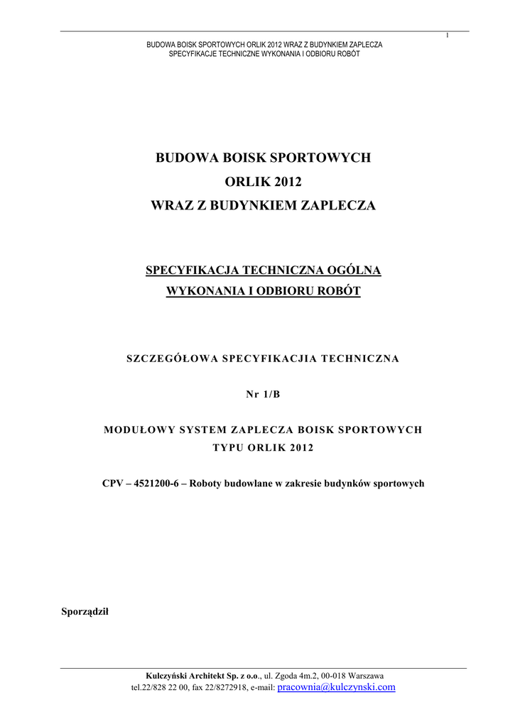 1 BUDOWA BOISK SPORTOWYCH ORLIK 2012 WRAZ Z BUDYNKIEM ZAPLECZA SPECYFIKACJE TECHNICZNE WYKONANIA I ODBIORU ROBÓT BUDOWA BOISK SPORTOWYCH ORLIK 2012 WRAZ Z BUDYNKIEM ZAPLECZA SPECYFIKACJA TECHNICZNA OGÓLNA WYKONANIA I ODBIORU ROBÓT SZCZEGÓŁOWA SPECYFIKACJIA TECHNICZNA Nr 1/B MODUŁOWY SYSTEM ZAPLECZA BOISK SPORTOWYCH TYPU ORLIK 2012 CPV – 4521200-6 – Roboty budowlane w zakresie budynków sportowych Sporządził Kulczyński Architekt Sp. z o.o., ul. Zgoda 4m.2, 00-018 Warszawa tel.22/828 22 00, fax 22/8272918, e-mail: [email protected] 2 BUDOWA BOISK SPORTOWYCH ORLIK 2012 WRAZ Z BUDYNKIEM ZAPLECZA SPECYFIKACJE TECHNICZNE WYKONANIA I ODBIORU ROBÓT Spis treści specyfikacji technicznych 1. Szczegółowe specyfikacje techniczne Gr.452 – Konstrukcje 1/B.01. – CPV - 45262210-6 - Fundamenty, elementy prefabrykowane 1/B.02. – CPV - 45261100-5 - Konstrukcje drewniana 1/B.03. – CPV - 45261210-9 - Pokrycia dachowe 2. Szczegółowe specyfikacje techniczne Gr.454 – Roboty wykończeniowe 1/B.04. – CPV - 45442100-8 - Malowanie 1/B.05. – CPV - 45432120-1 - Posadzki 3. Szczegółowe specyfikacje techniczne Gr.453 – Instalacje budowlane 1/B.06. – CPV - 45332000-3 - Instalacje sanitarne wod-kan 1/B.07. – CPV - 45311000-0 - Instalacje elektryczne 4. Szczegółowe specyfikacje techniczne Gr.454 – Roboty wykończeniowe 1/B.08. – CPV - 45422100-2 Stolarka drewniana, ślusarka Kulczyński Architekt Sp. z o.o., ul. Zgoda 4m.2, 00-018 Warszawa tel.22/828 22 00, fax 22/8272918, e-mail: [email protected] 3 BUDOWA BOISK SPORTOWYCH ORLIK 2012 WRAZ Z BUDYNKIEM ZAPLECZA SPECYFIKACJE TECHNICZNE WYKONANIA I ODBIORU ROBÓT SZCZEGÓLOWA SPECYFIKACJA TECHNICZNA 1/B.01 FUNDAMENTY – PREFABRYKATY ŻELBETOWE CPV 45262210-6 WSTĘP Przedmiot SST Przedmiotem niniejszej szczegółowej specyfikacji technicznej są wymagania dotyczące wykonywania i montażu prefabrykatów żelbetowych używanych przy wykonaniu fundamentów pod budynek modułowy zaplecza sportowego typu Orlik 2012 Zakres stosowania SST Szczegółowa specyfikacja techniczna jest stosowana jako dokument przetargowy i kontraktowy przy zlecaniu i realizacji robót wymienionych w pkt. 1.1. Zakres robót objętych SST Roboty, których dotyczy specyfikacja, obejmują wszystkie czynności umożliwiające i mające na celu wykonanie i montaż prefabrykatów żelbetowych i betonowych stanowiących fundamenty budynku : a) kręgi żelbetowe studni fundamentowych fi.60cm h-60cm ( po 2 szt na studnię ) b) podwaliny żelbetowe -20x25cm c) stopnie betonowe -15x35x100cm przy wejściach Określenia podstawowe Określenia podane w niniejszej SST są zgodne z obowiązującymi odpowiednimi normami. Ogólne wymagania dotyczące robót Kulczyński Architekt Sp. z o.o., ul. Zgoda 4m.2, 00-018 Warszawa tel.22/828 22 00, fax 22/8272918, e-mail: [email protected] 4 BUDOWA BOISK SPORTOWYCH ORLIK 2012 WRAZ Z BUDYNKIEM ZAPLECZA SPECYFIKACJE TECHNICZNE WYKONANIA I ODBIORU ROBÓT Wykonawca robót jest odpowiedzialny za jakość ich wykonania oraz za zgodność z dokumentacją projektową, SST i poleceniami Inspektora nadzoru. MATERIAŁY Wszystkie elementy prefabrykowane dostarczane na budowę powinny być trwale oznakowane. Poszczególne partie elementów tego samego typu powinny posiadać świadectwo jakości (atest). Studnie fundamentowe: Z kręgów żelbetowych średnicy 60 cm i wys.60cm gr.ścianki 10cm odpowiadających wymaganiom PN-EN 1917, Tolerancje wymiarowe elementów: – dla grubości 2 mm, – dla szerokości i wysokości 2 mm – dla długości 2 mm Prefabrykaty gotowe do wbudowania muszą uzyskać projektowaną wytrzymałość i posiadać atest wytwórni. Grunty do wykonania podkładu –zasypki studni i dekiel betonowy a) Do wykonania zasypki studni należy stosować pospółki żwirowo-piaskowe. Wymagania dotyczące pospółek: – uziarnienie do 50 mm, – łączna zawartość frakcji kamiennej i żwirowej do 50%, – zawartość frakcji pyłowej do 2%, – zawartość cząstek organicznych do 2%. b) Beton B20 na spód studni gr.20cm i dekiel gr.15cm Belki prefabrykowane –podwaliny ; stopnie betonowe Charakterystyka belek: – wysokość 25 cm – szerokość 20 cm Carakterystyka stopni schodowych : – wysokośc 15,0 cm , szerokośc 35cm a) Wymagania: Kulczyński Architekt Sp. z o.o., ul. Zgoda 4m.2, 00-018 Warszawa tel.22/828 22 00, fax 22/8272918, e-mail: [email protected] 5 BUDOWA BOISK SPORTOWYCH ORLIK 2012 WRAZ Z BUDYNKIEM ZAPLECZA SPECYFIKACJE TECHNICZNE WYKONANIA I ODBIORU ROBÓT Belki winny być wykonane zgodnie z projektem. – Tolerancje wymiarowe. Odchyłki od wymiarów projektowanych nie powinny przekraczać: w długości do 6 mm; w wysokości do 4 mm; w grubości do 3 mm. – Dopuszczalne wady i uszkodzenia. – skrzywienie belki w poziomie – do 5 mm – skrzywienie belki w pionie – nie dopuszcza się – szczerby i uszkodzenia krawędzi – głębokość: do 5 mm – długość: do 30 mm – ilość: 3 szt/mb. Klasa odporności ogniowej „B”. b) Zbrojenie 4x ø12, strzemiona ø6 co 20cm, beton B20 Papa asfaltowa na tkaninie technicznej Papa asfaltowa na tkaninie technicznej składa się z tkaniny asfaltem PS40/175, z obustronną powłoką asfaltową PS-85 i posypką mineralną. Wymagania wg PN-B-27617/A1:1997 SPRZĘT Roboty mogą być wykonane ręcznie lub mechanicznie. Roboty można wykonać przy użyciu dowolnego typu sprzętu min.. żurawi budowlanych samochodowych, koparek podsiębiernych, Transport Składowanie belek Belki należy składować na równym podłożu, na podkładkach grubości co najmniej 80 mm ułożonych poziomo w odległości 1/5 długości od ich końców. Następne warstwy układać na podkładkach umieszczonych nad podkładkami dolnymi. Liczba warstw nie większa od 5. Transport belek Kulczyński Architekt Sp. z o.o., ul. Zgoda 4m.2, 00-018 Warszawa tel.22/828 22 00, fax 22/8272918, e-mail: [email protected] 6 BUDOWA BOISK SPORTOWYCH ORLIK 2012 WRAZ Z BUDYNKIEM ZAPLECZA SPECYFIKACJE TECHNICZNE WYKO