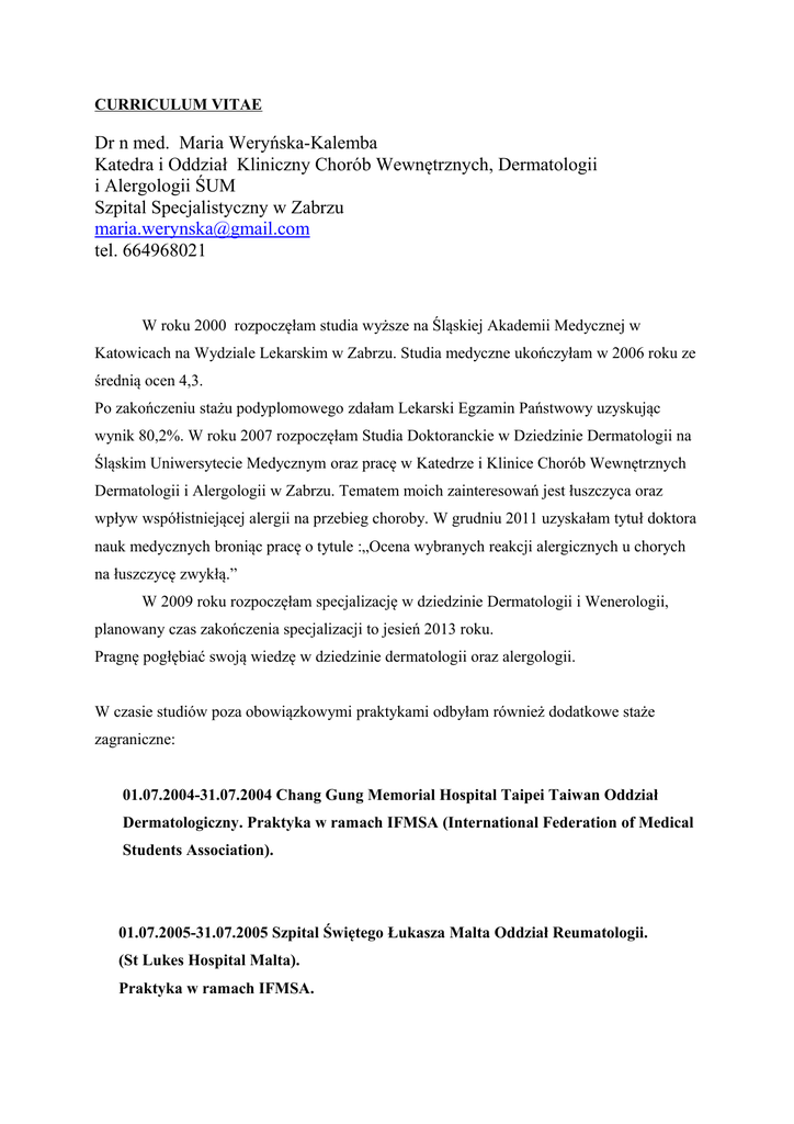 CURRICULUM VITAE Dr n med. Maria Weryńska-Kalemba Katedra i Oddział Kliniczny Chorób Wewnętrznych, Dermatologii i Alergologii ŚUM Szpital Specjalistyczny w Zabrzu [email protected] tel. 664968021 W roku 2000 rozpoczęłam studia wyższe na Śląskiej Akademii Medycznej w Katowicach na Wydziale Lekarskim w Zabrzu. Studia medyczne ukończyłam w 2006 roku ze średnią ocen 4,3. Po zakończeniu stażu podyplomowego zdałam Lekarski Egzamin Państwowy uzyskując wynik 80,2%. W roku 2007 rozpoczęłam Studia Doktoranckie w Dziedzinie Dermatologii na Śląskim Uniwersytecie Medycznym oraz pracę w Katedrze i Klinice Chorób Wewnętrznych Dermatologii i Alergologii w Zabrzu. Tematem moich zainteresowań jest łuszczyca oraz wpływ współistniejącej alergii na przebieg choroby. W grudniu 2011 uzyskałam tytuł doktora nauk medycznych broniąc pracę o tytule :„Ocena wybranych reakcji alergicznych u chorych na łuszczycę zwykłą.” W 2009 roku rozpoczęłam specjalizację w dziedzinie Dermatologii i Wenerologii, planowany czas zakończenia specjalizacji to jesień 2013 roku. Pragnę pogłębiać swoją wiedzę w dziedzinie dermatologii oraz alergologii. W czasie studiów poza obowiązkowymi praktykami odbyłam również dodatkowe staże zagraniczne: 01.07.2004-31.07.2004 Chang Gung Memorial Hospital Taipei Taiwan Oddział Dermatologiczny. Praktyka w ramach IFMSA (International Federation of Medical Students Association). 01.07.2005-31.07.2005 Szpital Świętego Łukasza Malta Oddział Reumatologii. (St Lukes Hospital Malta). Praktyka w ramach IFMSA. W czasie Studiów Doktoranckich byłam laureatem dwóch grantów dla młodych członków Polskiego Towarzystwa Dermatologicznego i Polskiego Towarzystwa Alergologicznego: - Uczestnictwo w III Konferencji Szkoleniowej „ Choroby alergiczne od Pediatrii do Geriatrii” Wisła 21 kwietnia 2010 w ramach grantu Polskiego Towarzystwa Alergologicznego. - European Academy of Dermatology and Venereology Congress in Gothenburg Sweden 0611 October 2010 udział w kongresie w ramach grantu Polskiego Towarzystwa Dermatologicznego. W okresie studiów byłam członkiem Studenckich Kół Naukowych : − Koło STN przy Katedrze i Oddziale Klinicznym Chorób Wewnętrznych, Dermatologii i Alergologii ŚLAM w latach 2004-2006 − Koło STN przy Katedrze i Zakładzie Ogólnej Biologii Lekarskiej Śląskiej Akademii Medycznej w latach 2002-2006 − Koło STN przy Katedrze i Zakładzie Anatomii Opisowej i Topograficznej ŚLAM w latach 2003-2006. Wystąpienia w czasie trwania Studiów Medycznych: • „Analiza epidemiologiczna przypadków boreliozy z Lyme zgłoszonych poprzez Terenową Stację Sanitarno-Epidemiologiczną w Bytomiu w latach 1999-2002.” Pierwsza Ogólnopolska Konferencja Naukowa Studentów Akademii Medycznych Katowice. • „Diagnostyka serologiczna boreliozy z Lyme przy użyciu metody ELISA i IFA.” Druga Międzynarodowa Konferencja Studentów Medycyny i Młodych Lekarzy 15-17 kwietnia 2004 Bydgoszcz. • „Przewód chłonny wątrobowy jako model do badań nad reaktywnością dużych naczyń chłonnych.” Ogólnopolska i Międzywydziałowa Konferencja Naukowa Studentów Akademii Medycznych 5-7 maj 2004 Katowice oraz Dwunasta Międzynarodowa Konferencja Studentów Medycyny i Młodych Lekarzy Gdańsk 2004. • “Malaria cases as an imported disease in the Silesian District in 2004.” ( „Malaria jako choroba importowana na terenie Śląska w 2004 roku.”) Trzynasta Międzynarodowa Konferencja Studentów Medycyny i Młodych Lekarzy 12-14 maj 2005 Gdańsk. • “Frequency estimation of the mycotic infection occurence as far as the hospitalized patients with different types of dermatosis are concerned.” (Częstość występowania zakażeń grzybiczych u pacjentów hospitalizowanych z przyczyn dermatologicznych.”) Trzynasta Międzynarodowa Konferencja Studentów Medycyny i Młodych Lekarzy 12-14 maj 2005 Gdańsk. • “An attempt of using bile ducts as a way of an antineoplastic drug administration.” (Próba wykorzystania dróg żółciowych jako drogi podania leków przeciwnowotworowych.”) Trzynasta Międzynarodowa Konferencja Studentów Medycyny i Młodych Lekarzy 12-14 maj 2005 Gdańsk. • ”Antibodies avidity against Toxoplasma gonidii in case of patients without immunological deficiencies.”( Awidność przeciwciał przeciwko Toxoplasma gondii u pacjentów bez niedoborów immunologicznych.”) Czternasta Międzynarodowa Konferencja Studentów Medycyny i Młodych Lekarzy 11-13 maj 2006 Gdańsk. • „The usage of bile ducts as a way of the antineoplastic drug administration as well as an attempt of comparison of the administered drug hepatotoxicity dependent on the administration way”. („Próba wykorzystania dróg żółciowych jako drogi podania leków przeciwnowotworowych oraz próba porównania hepatotoksyczności zależnej od drogi podania leku.”)] 17th European Students Conference At Charite Campus Virchow Klinikum of the Medical Faculty of the Humboldt University and the Free University In Berlin, Germany 8-12 October 2006. • ”Ocena zależności pomiędzy przebiegiem dermatozy a przebiegiem choroby psychicznej u chorych hospitalizowanych psychiatrycznie.”Czternasta Międzynarodowa Konferencja Studentów Medycyny i Młodych Lekarzy 11-13 maj 2006 Gdańsk. • “Frequency estimation of the psychic disturbances among dermatologicaly hospitalized patients on account of psoriasis, discoid lupus erythematosus and atopic dermatitis”. 12th Congress of the European Society for Dermatology and Psychiatry 14-17 June 2007 Wrocław. Prace nagrodzone: 1.”Przewód chłonny wątrobowy jako model do badań nad reaktywnością dużych naczyń chłonnych.” Dwunasta Międzynarodowa Konferencja Studentów Medycyny i Młodych Lekarzy Gdańsk 2004. WYRÓŻNIENIE 2.”An attempt of using bile ducts as a way of an antineoplastic drug administration.” ( Próba wykorzystania dróg żółciowych jako drogi podania leków prze